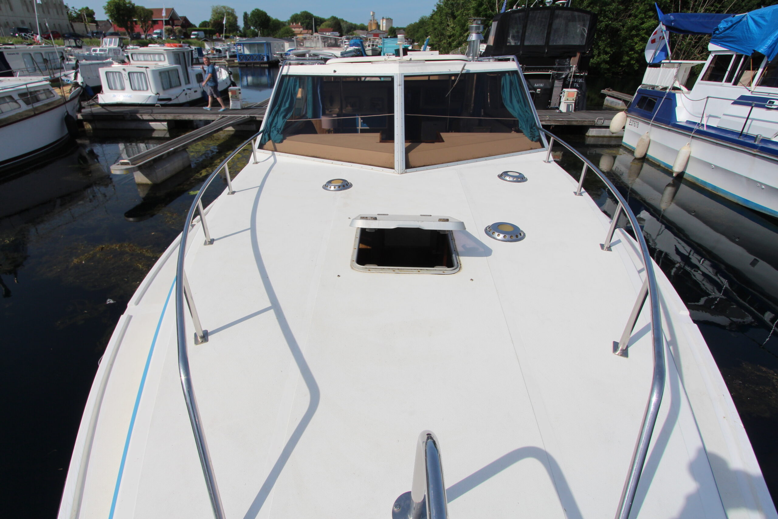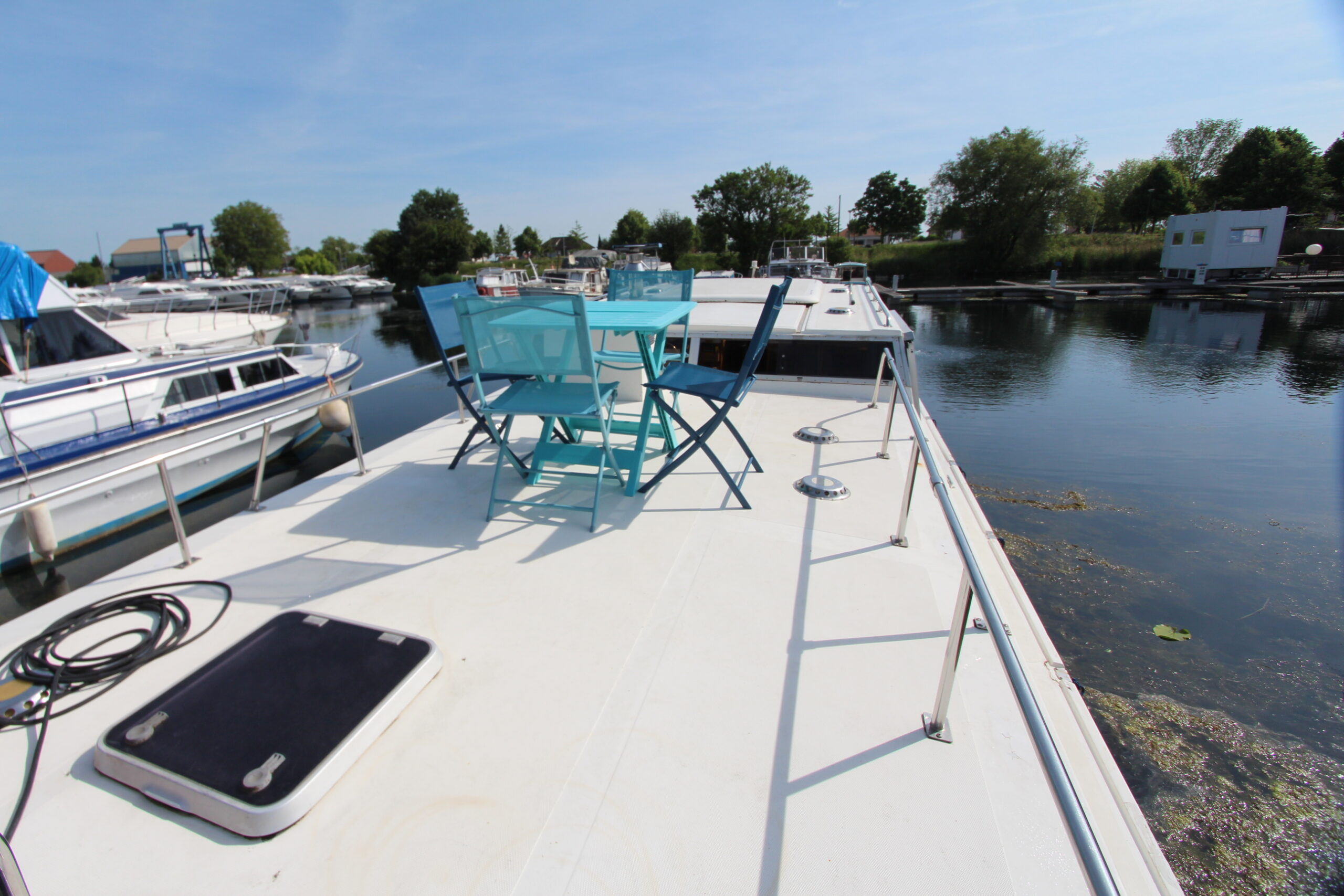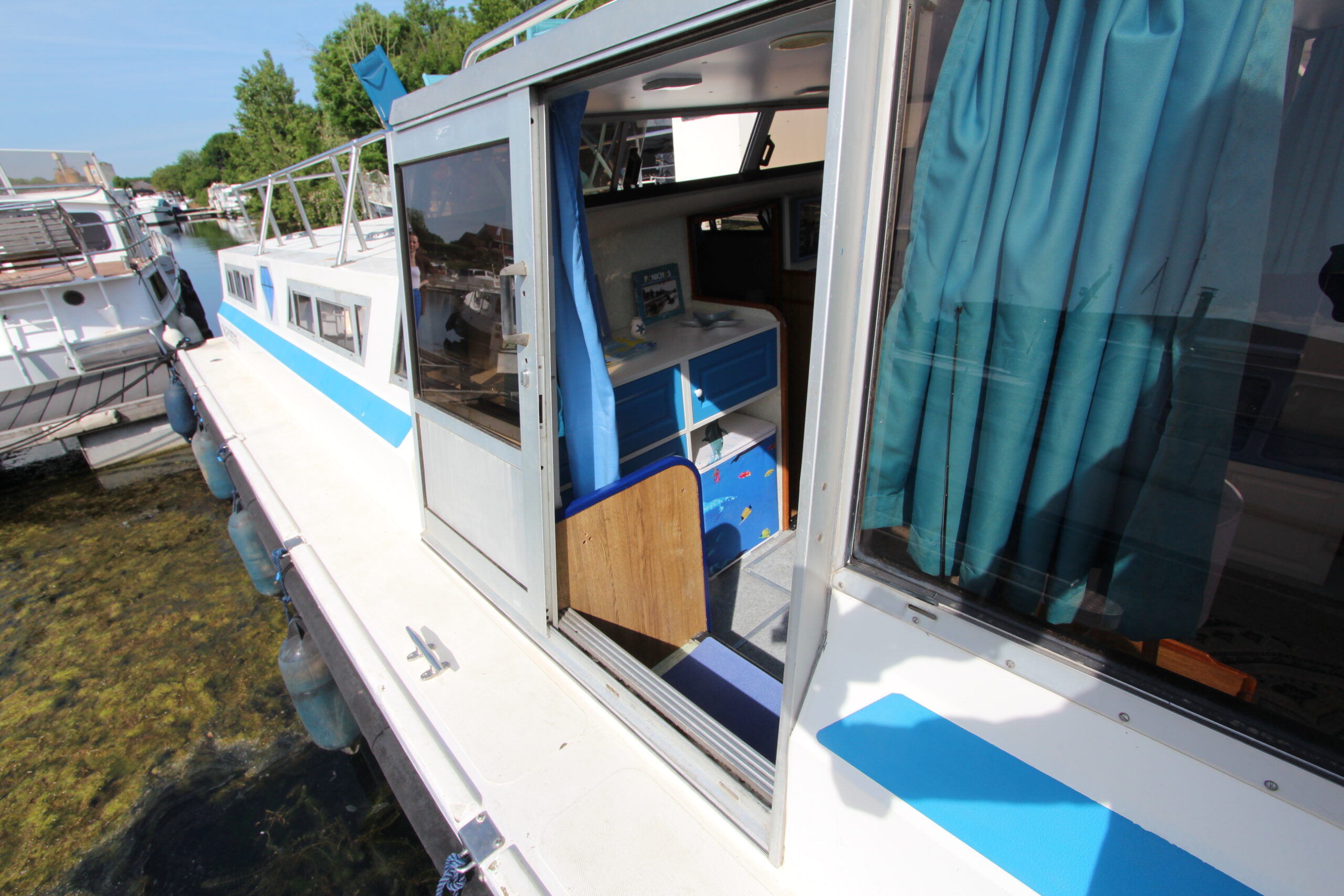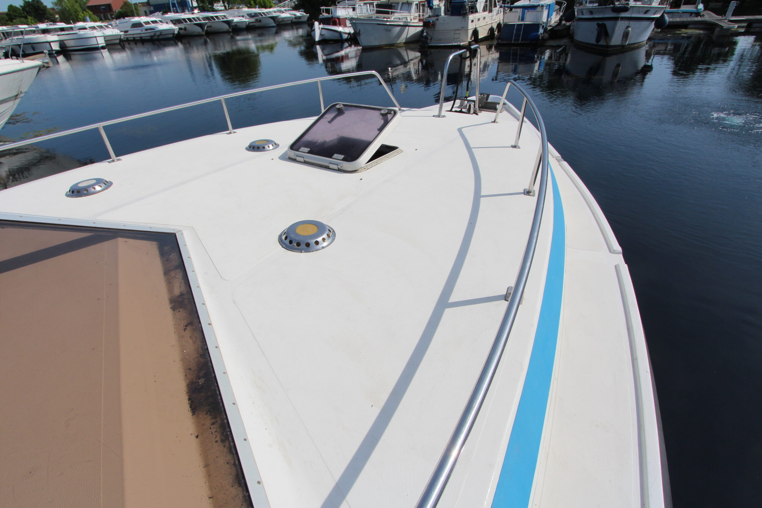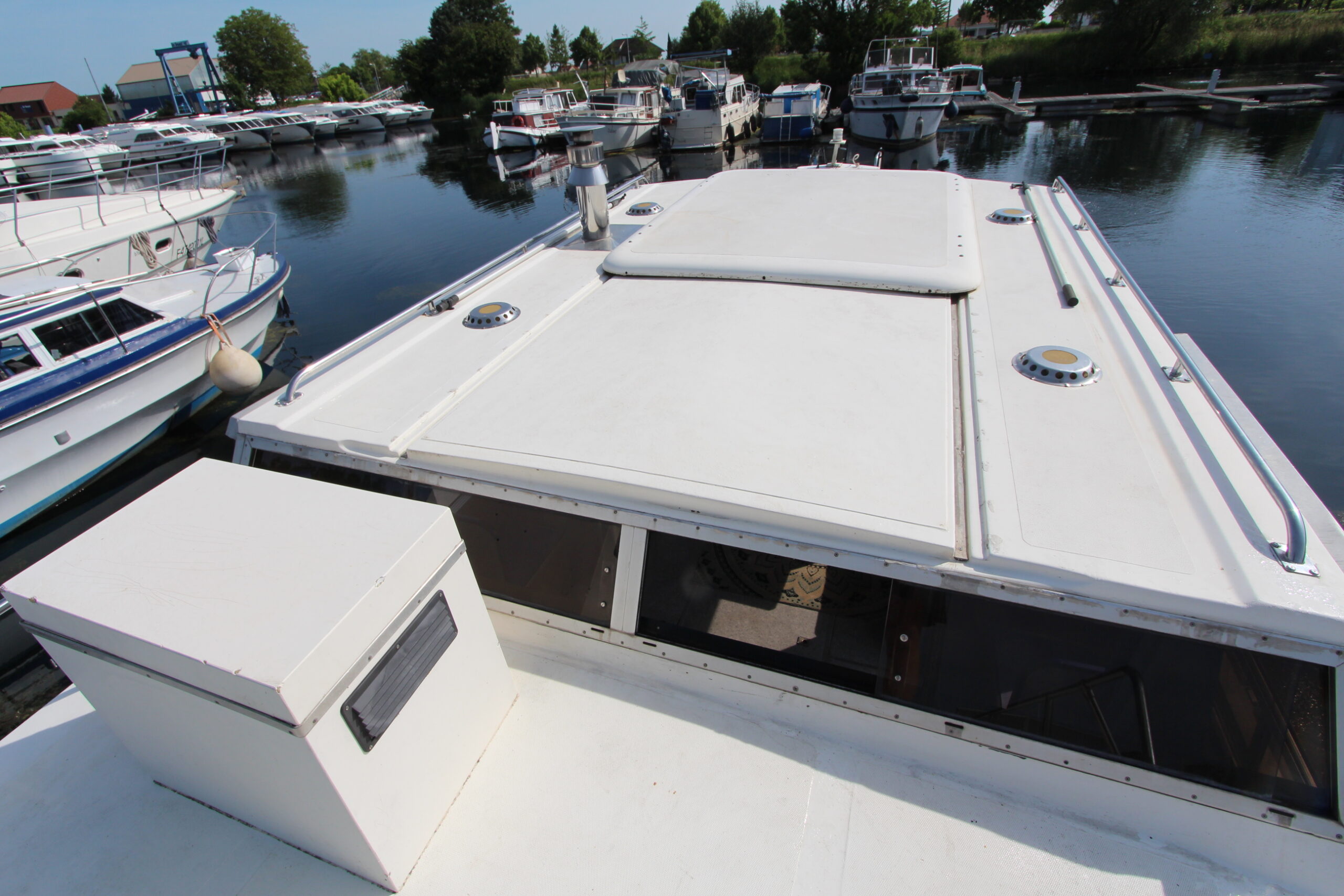 Vedette polyester Challenger de 1991. Idéale pour naviguer en famille et avec les amis sur toutes les voies navigables intérieures. Spacieuse terrasse pour profiter d’agréables moments lors de vos accostages. Deux entrées latérales. Espace à vivre lumineux offrant vue panoramique sur l’eau et comprenant un salon et un poste de pilotage. L’avant dessert une cabine avec lits simples, un WC et une cuisine. Sur l’arrière, vous retrouverez une dinette convertible en lit double, deux cabines avec lit double, une salle de bain et un WC.