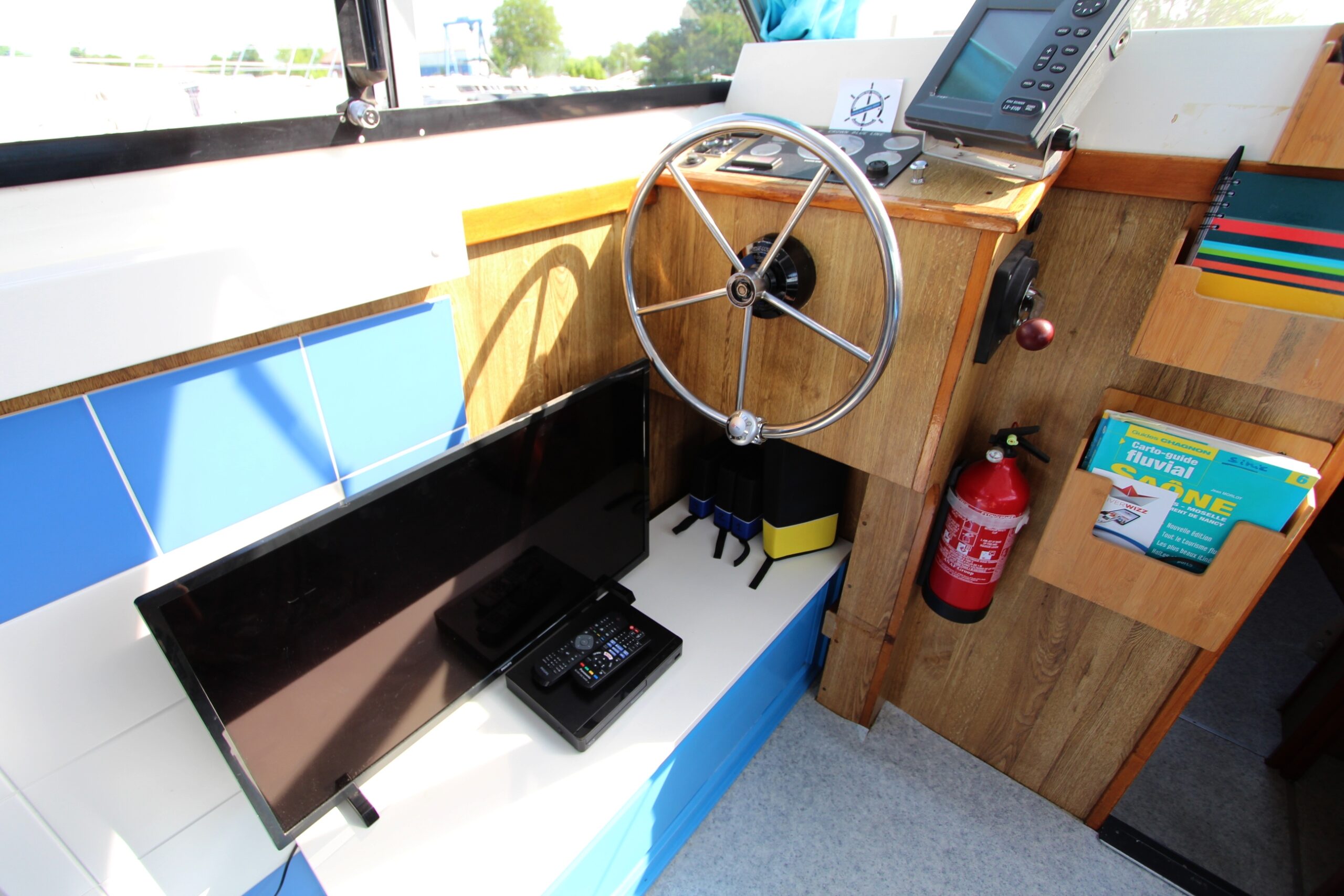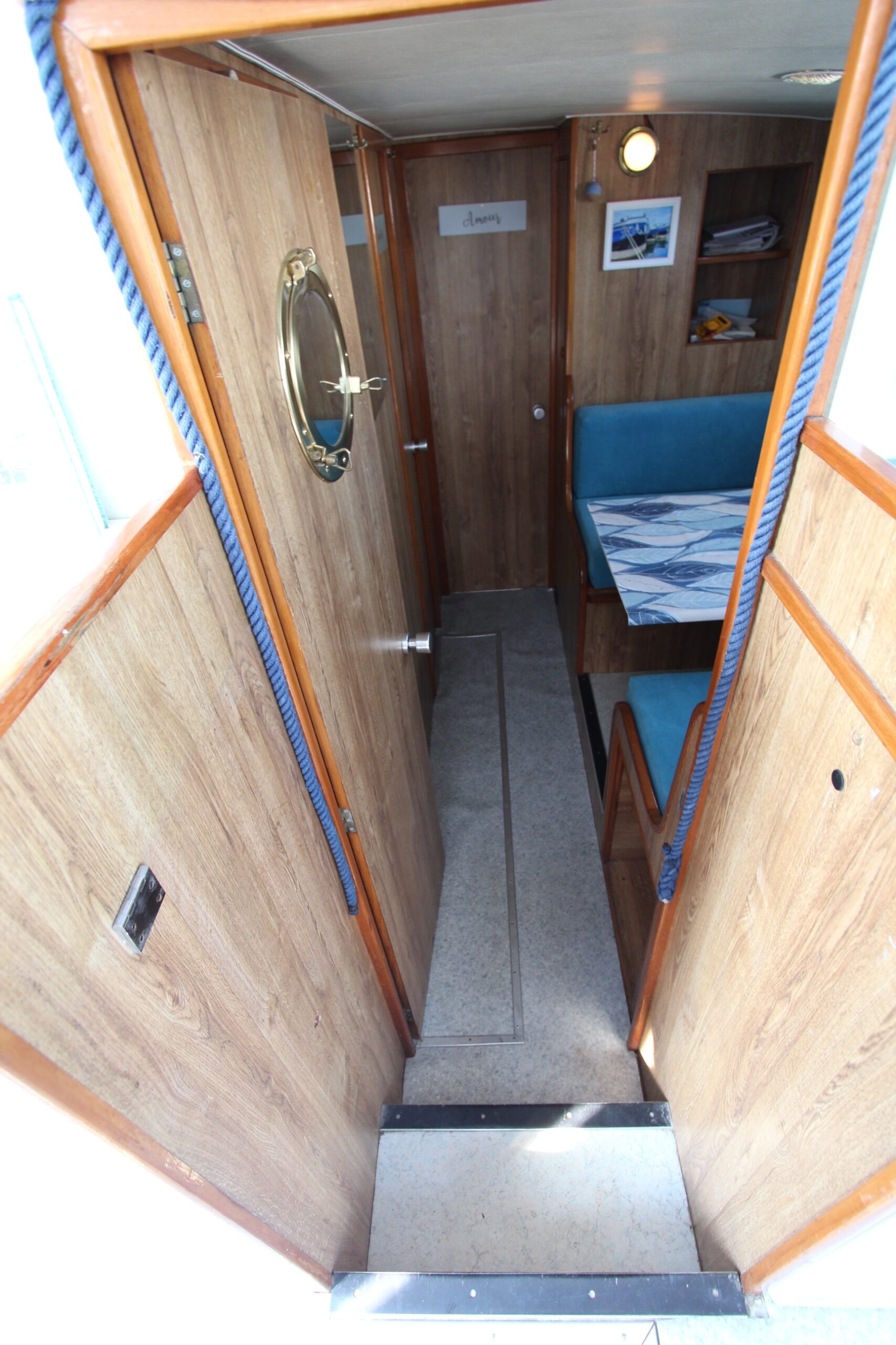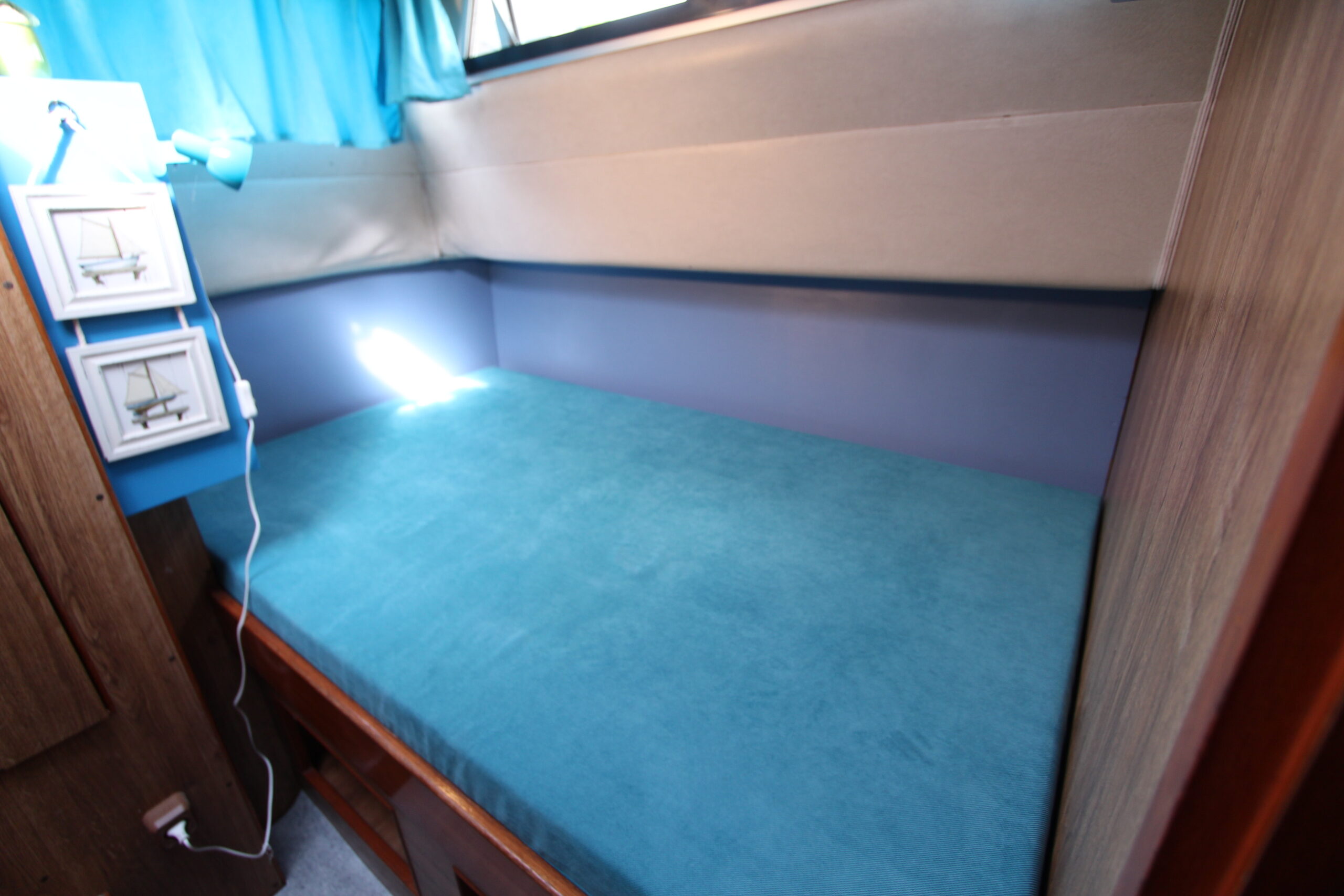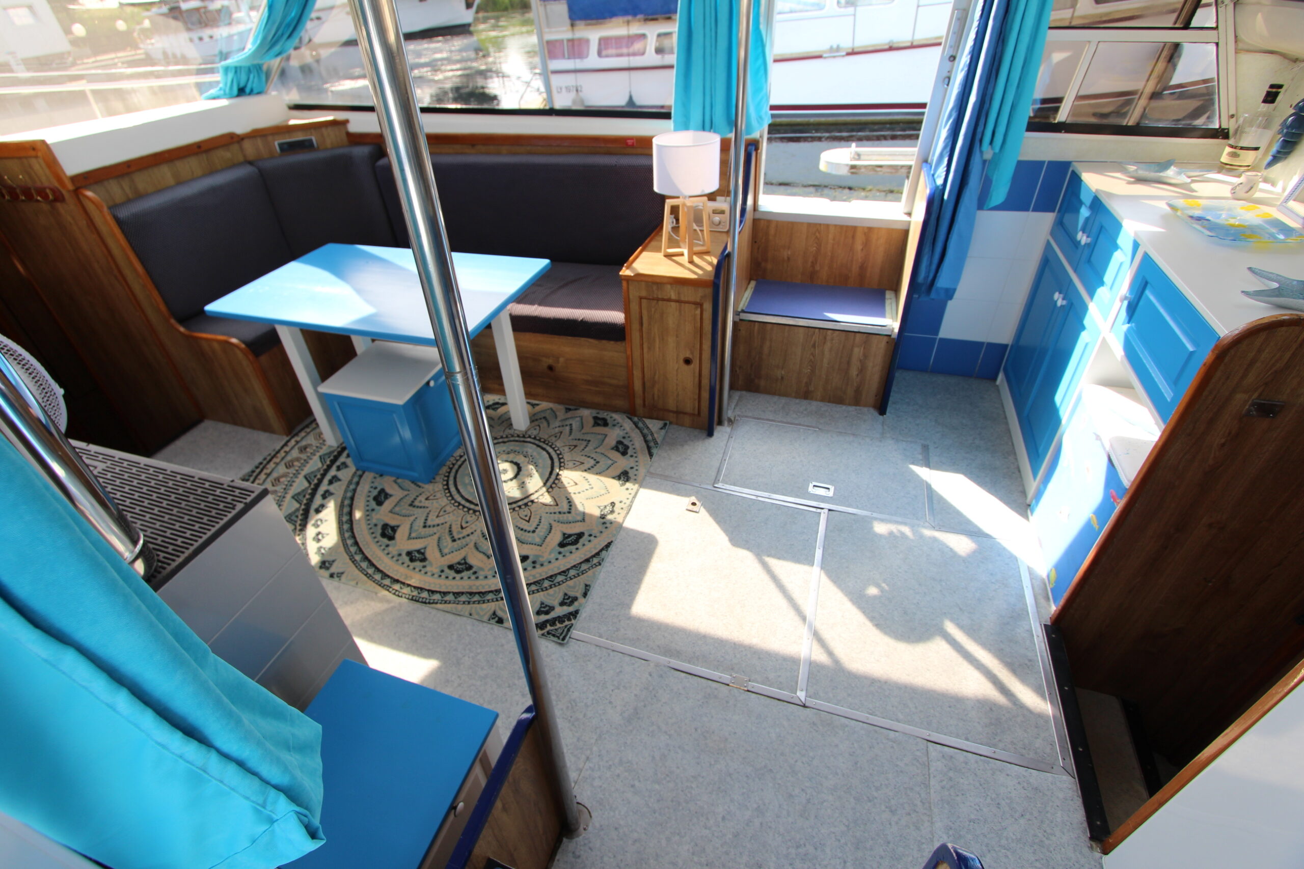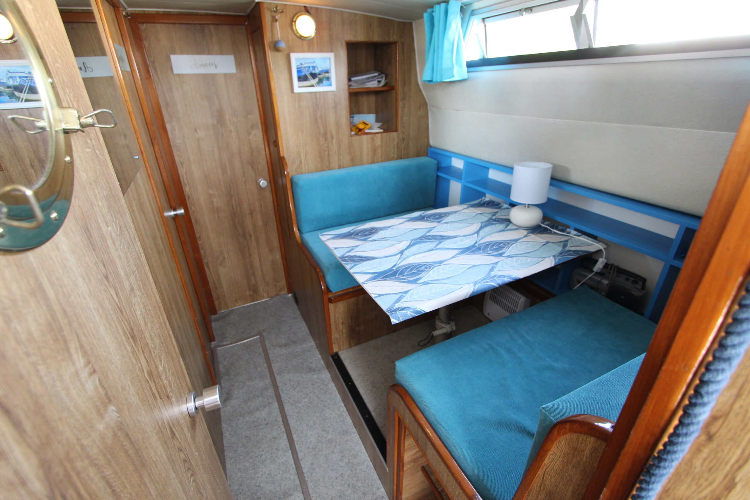 Vedette polyester Challenger de 1991. Idéale pour naviguer en famille et avec les amis sur toutes les voies navigables intérieures. Spacieuse terrasse pour profiter d’agréables moments lors de vos accostages. Deux entrées latérales. Espace à vivre lumineux offrant vue panoramique sur l’eau et comprenant un salon et un poste de pilotage. L’avant dessert une cabine avec lits simples, un WC et une cuisine. Sur l’arrière, vous retrouverez une dinette convertible en lit double, deux cabines avec lit double, une salle de bain et un WC.