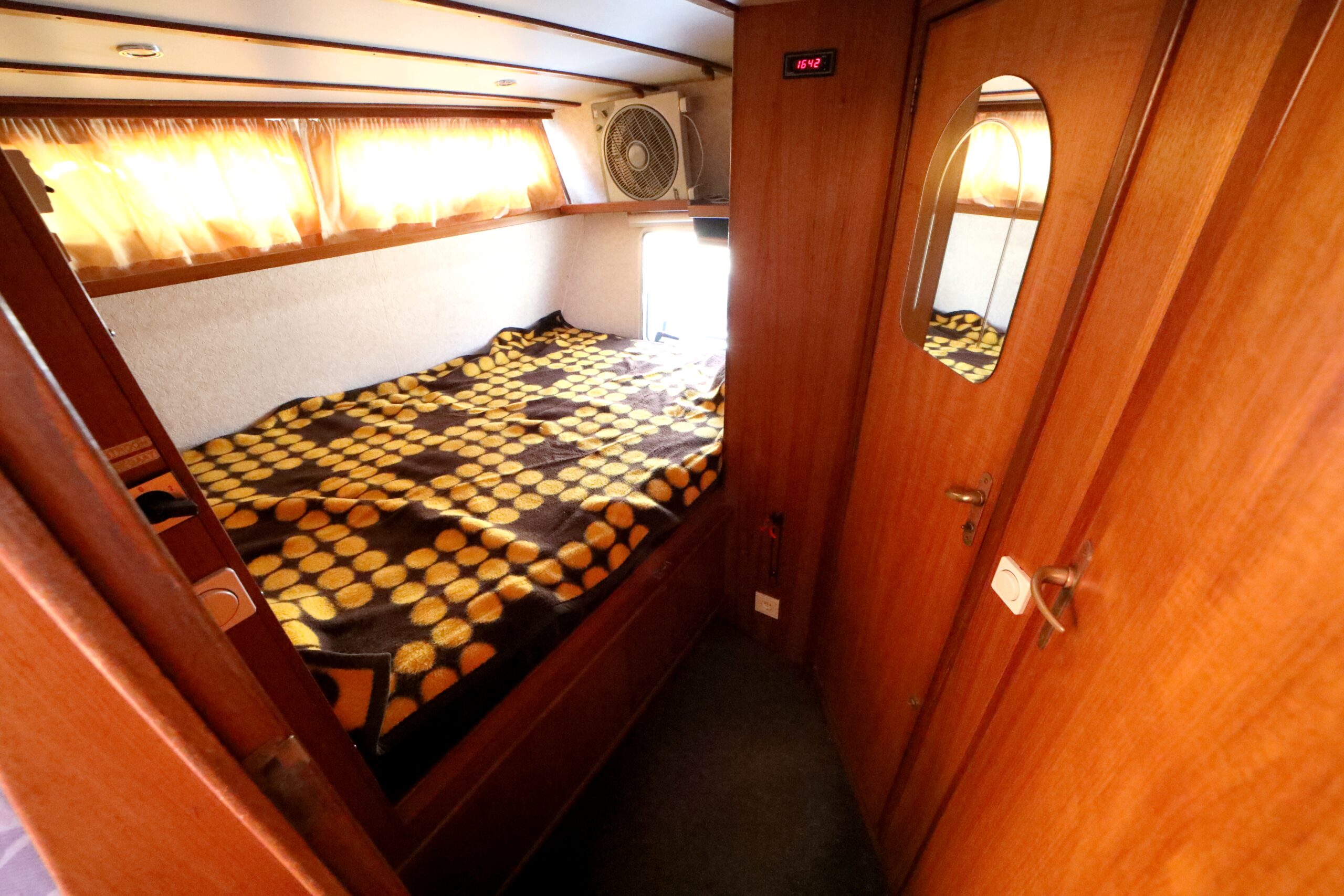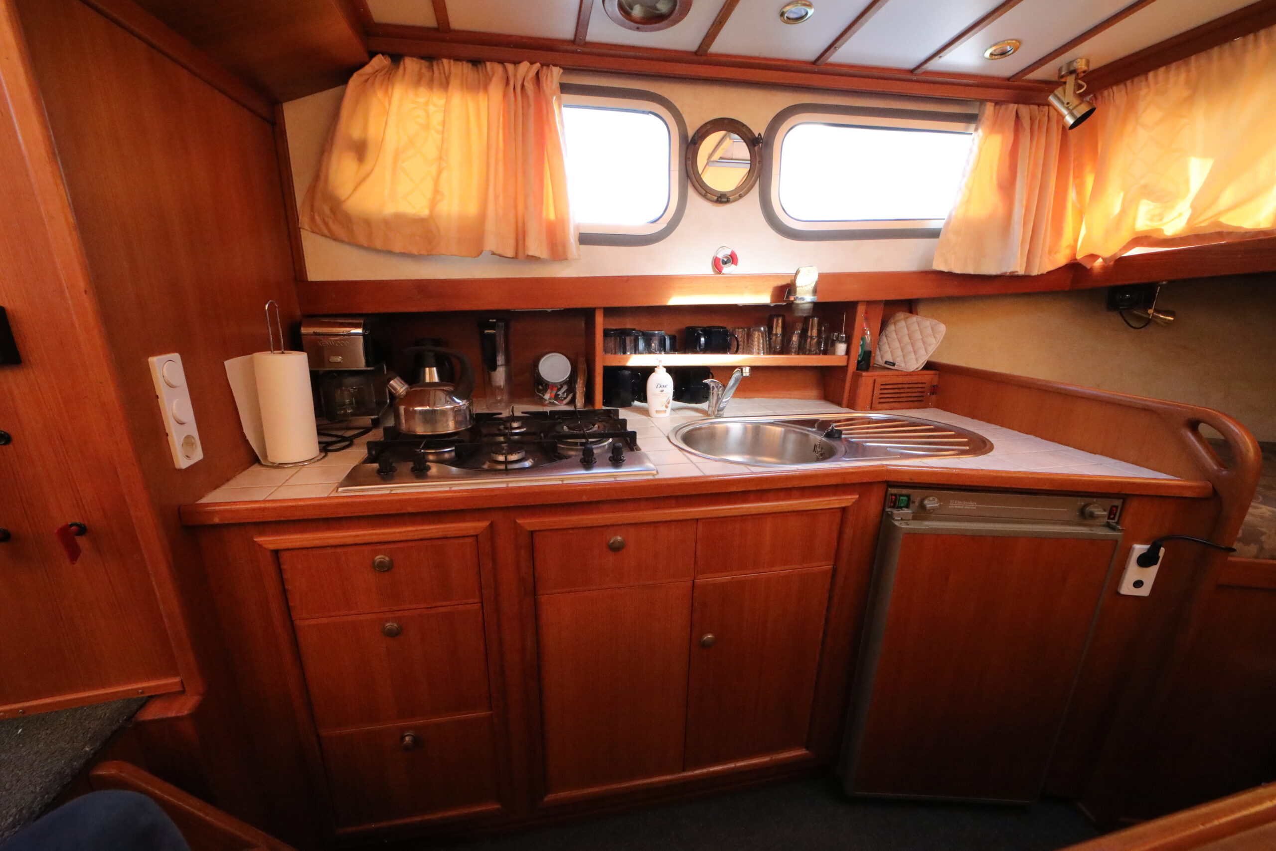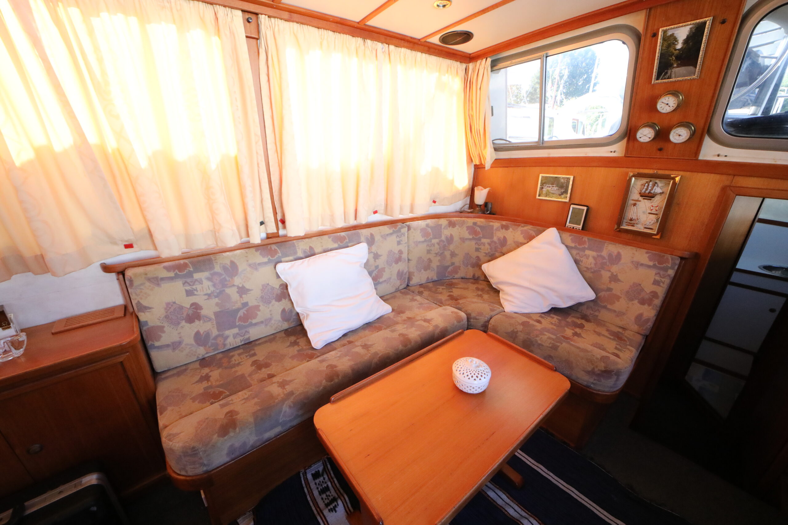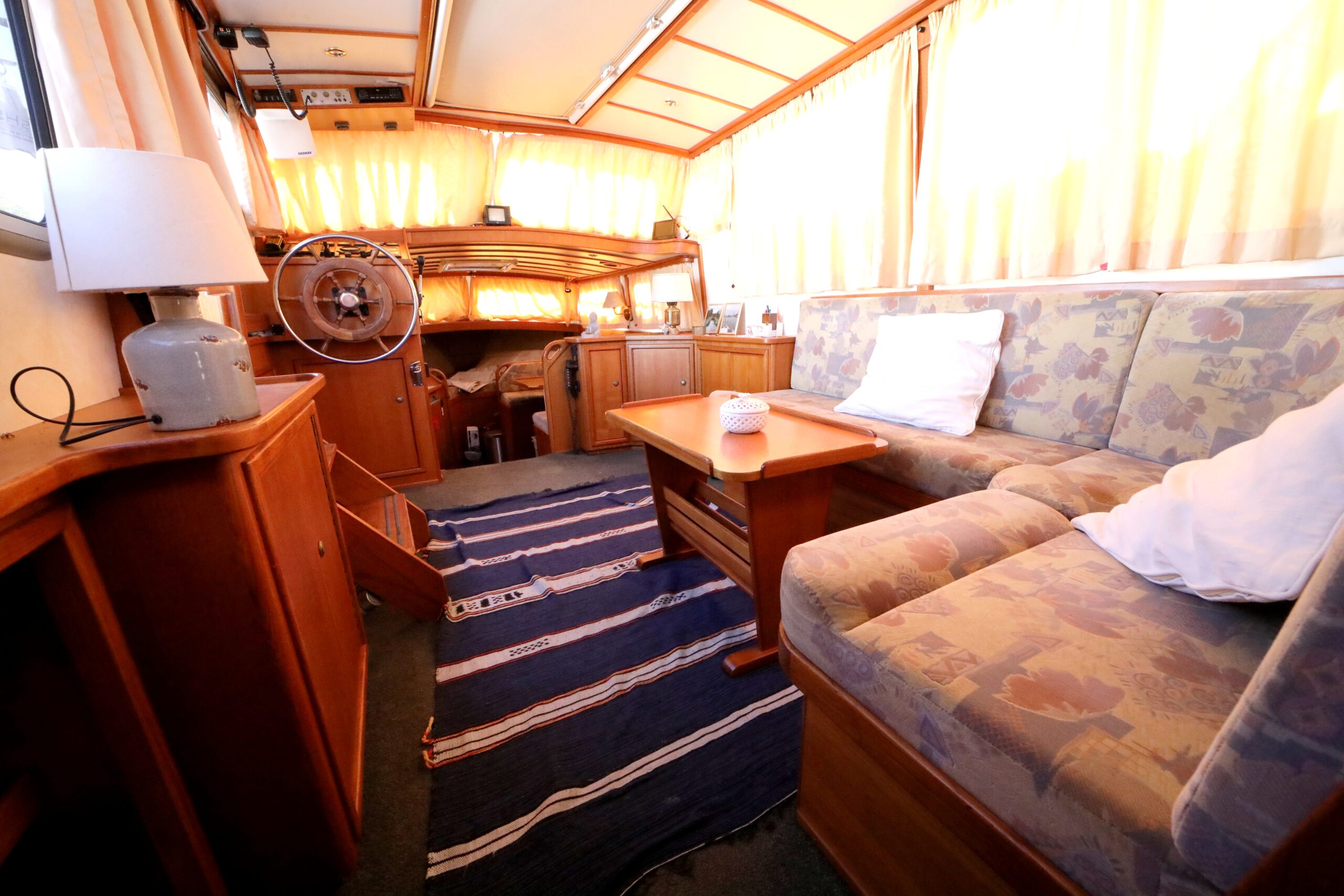 Jolie vedette hollandaise de 1979, idéale pour parcourir sereinement les canaux français et européens. La terrasse, agréable en navigation comme au mouillage, offre un bel espace pour profiter des paysages. L’accès latéral mène à un intérieur confortable et lumineux, composé d’un salon accueillant, d’une cabine avec lit double et salle de bain avec douche et wc. La cuisine est très fonctionnelle, la dinette est conviviale. Deux couchettes confortables se trouvent dans le pic avant du bateau.