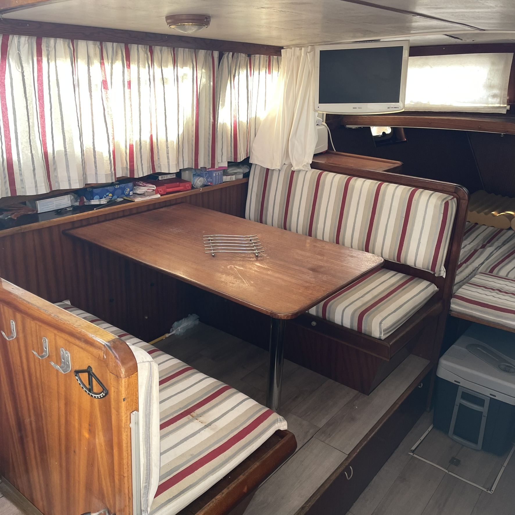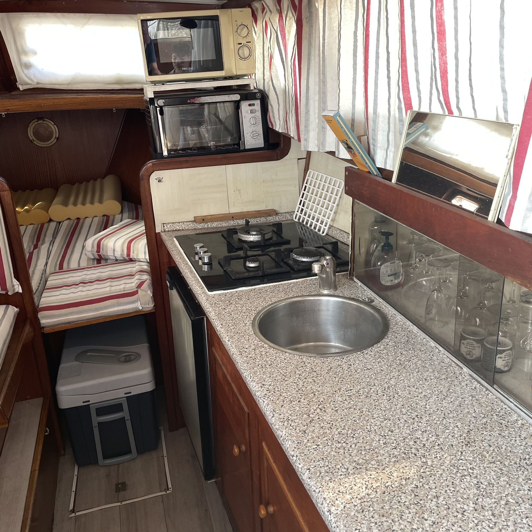 L’intérieur séduit par sa luminosité et son ambiance chaleureuse. Le salon spacieux constitue un véritable espace de vie convivial. La cuisine, bien agencée et équipée, permet de cuisiner facilement à bord tout en profitant d’un espace pratique et optimisé.