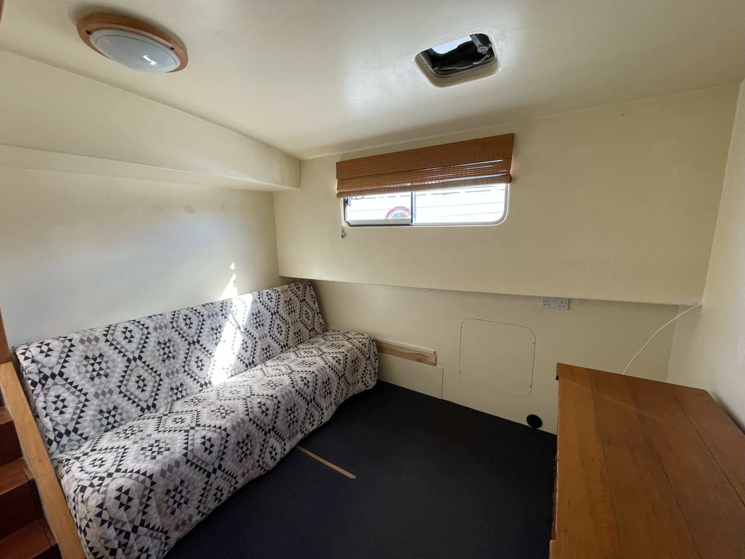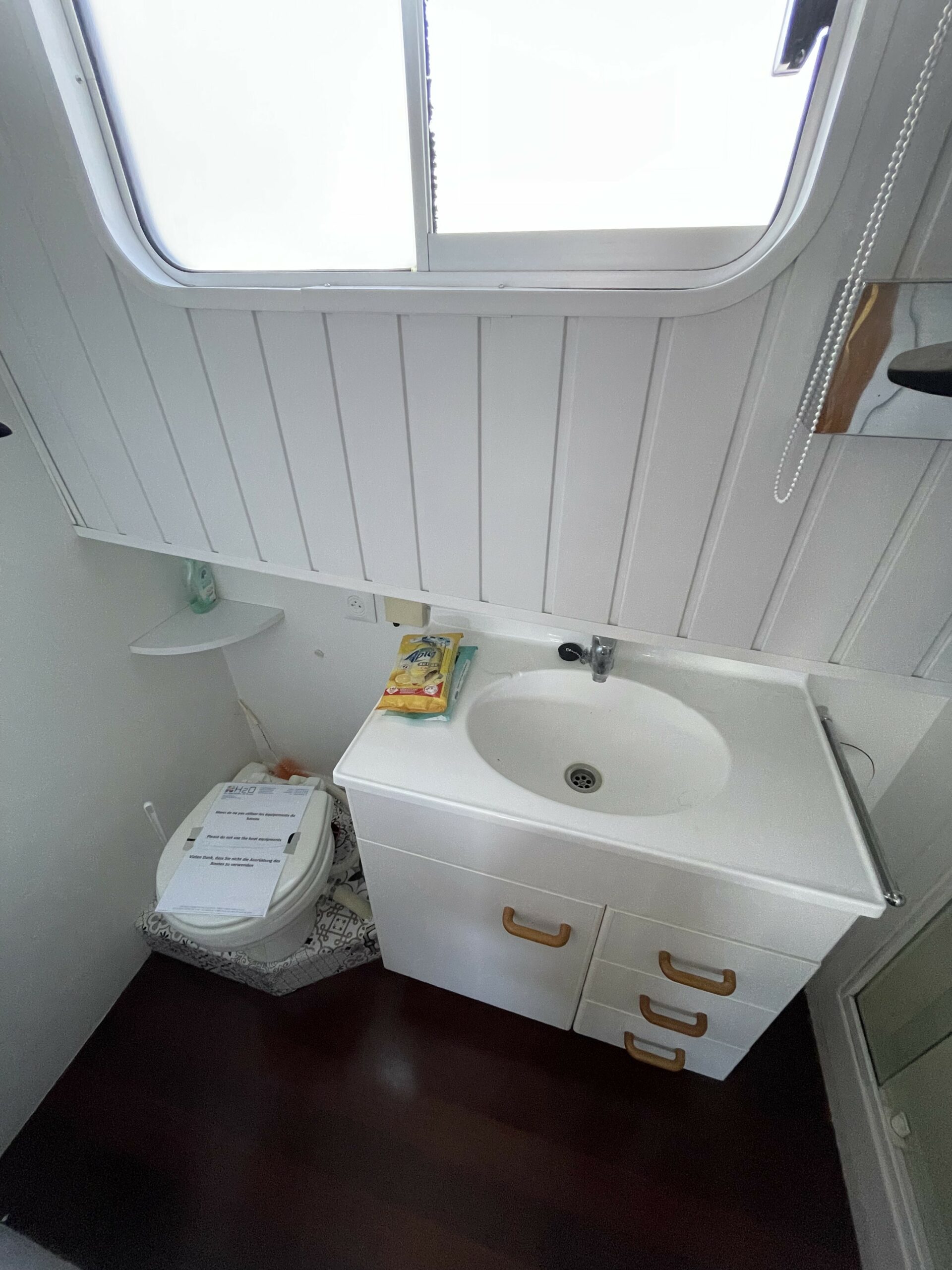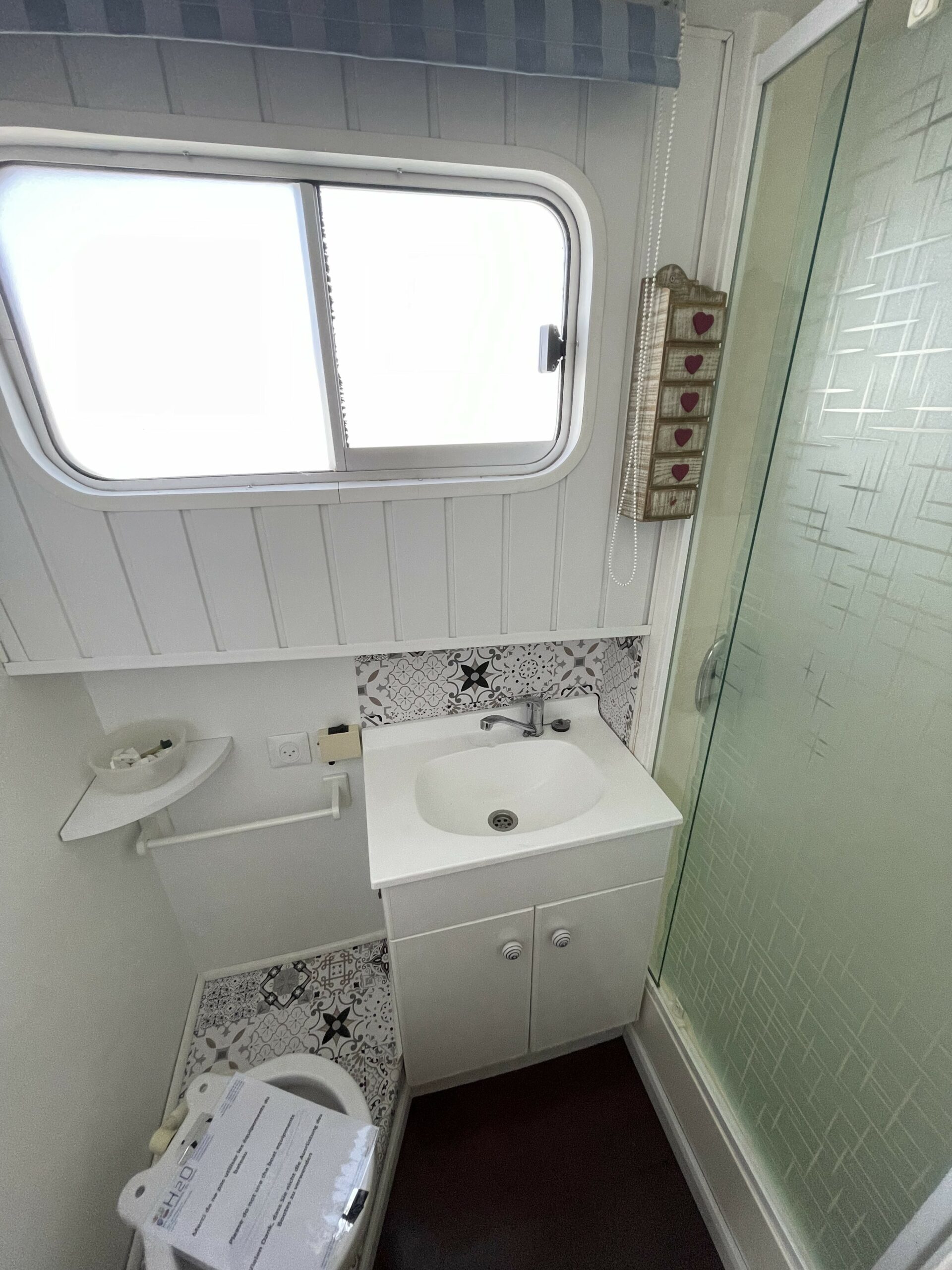 Cette péniche dispose de trois cabines : deux cabines latérales, l’une transformée en salon et l’autre en bureau, ainsi qu’une cabine avant avec un grand lit double central. De plus, deux salles de bain, chacune équipée d’une douche et de WC électriques, viennent compléter le confort de l’aménagement.