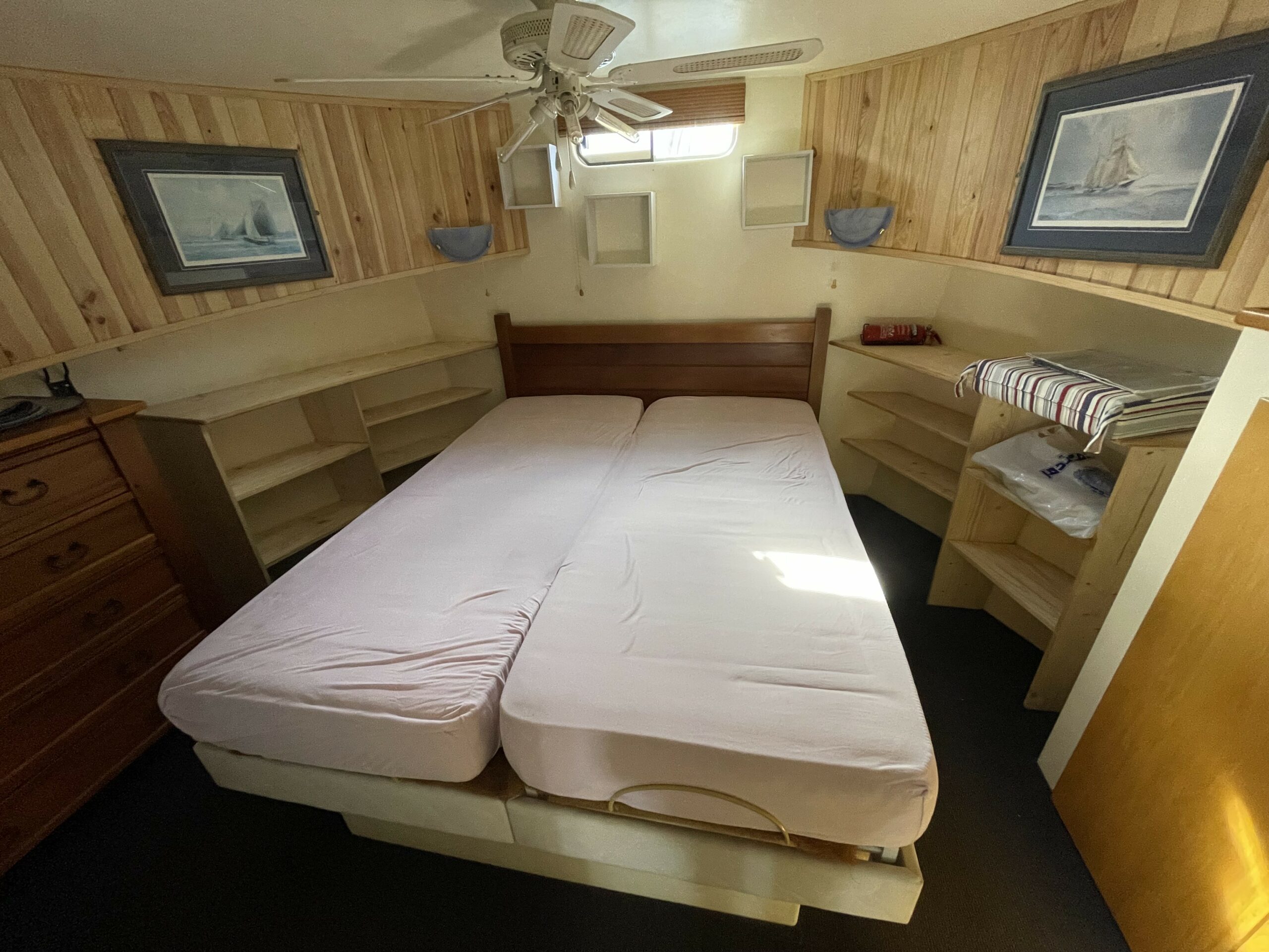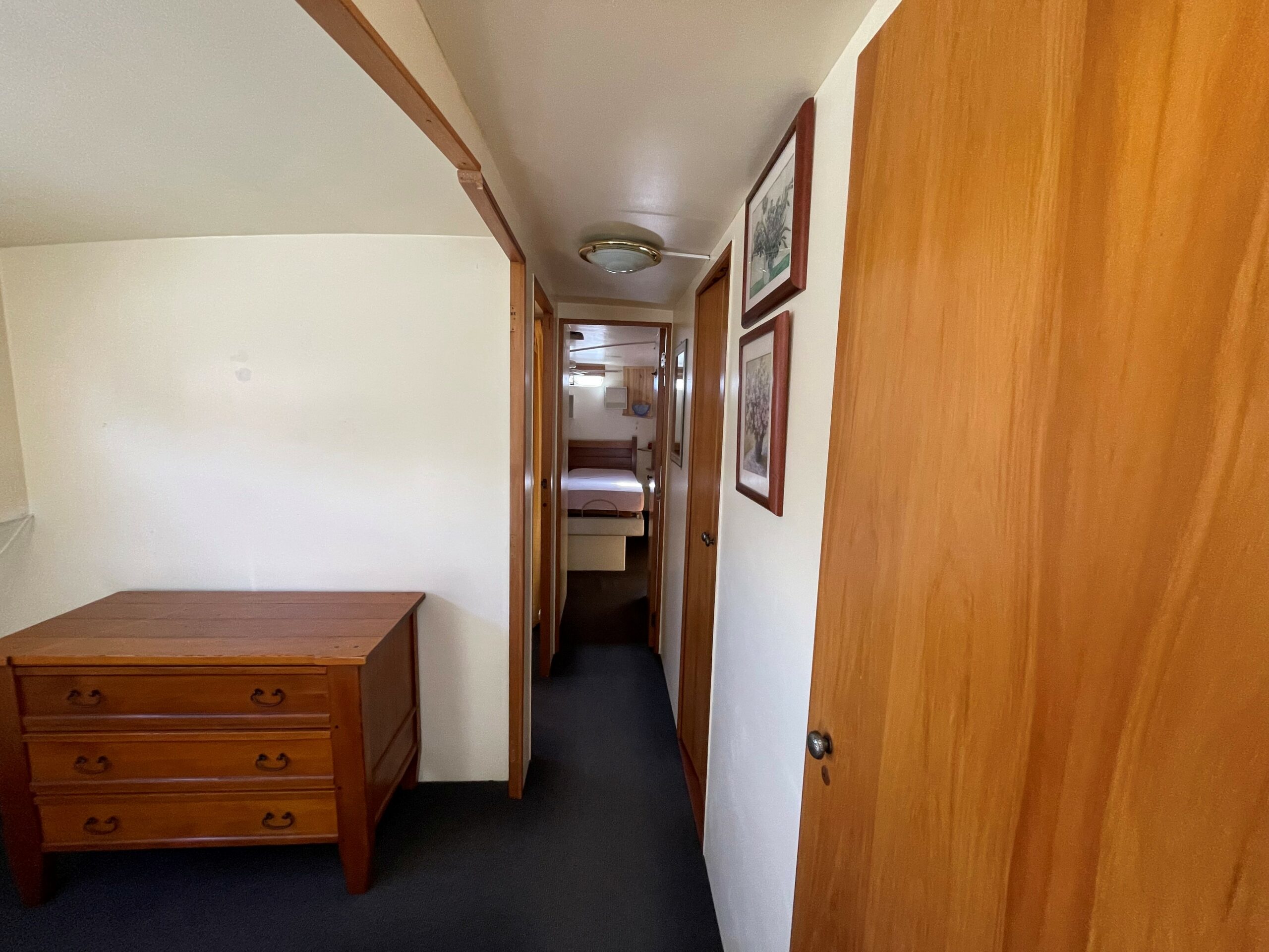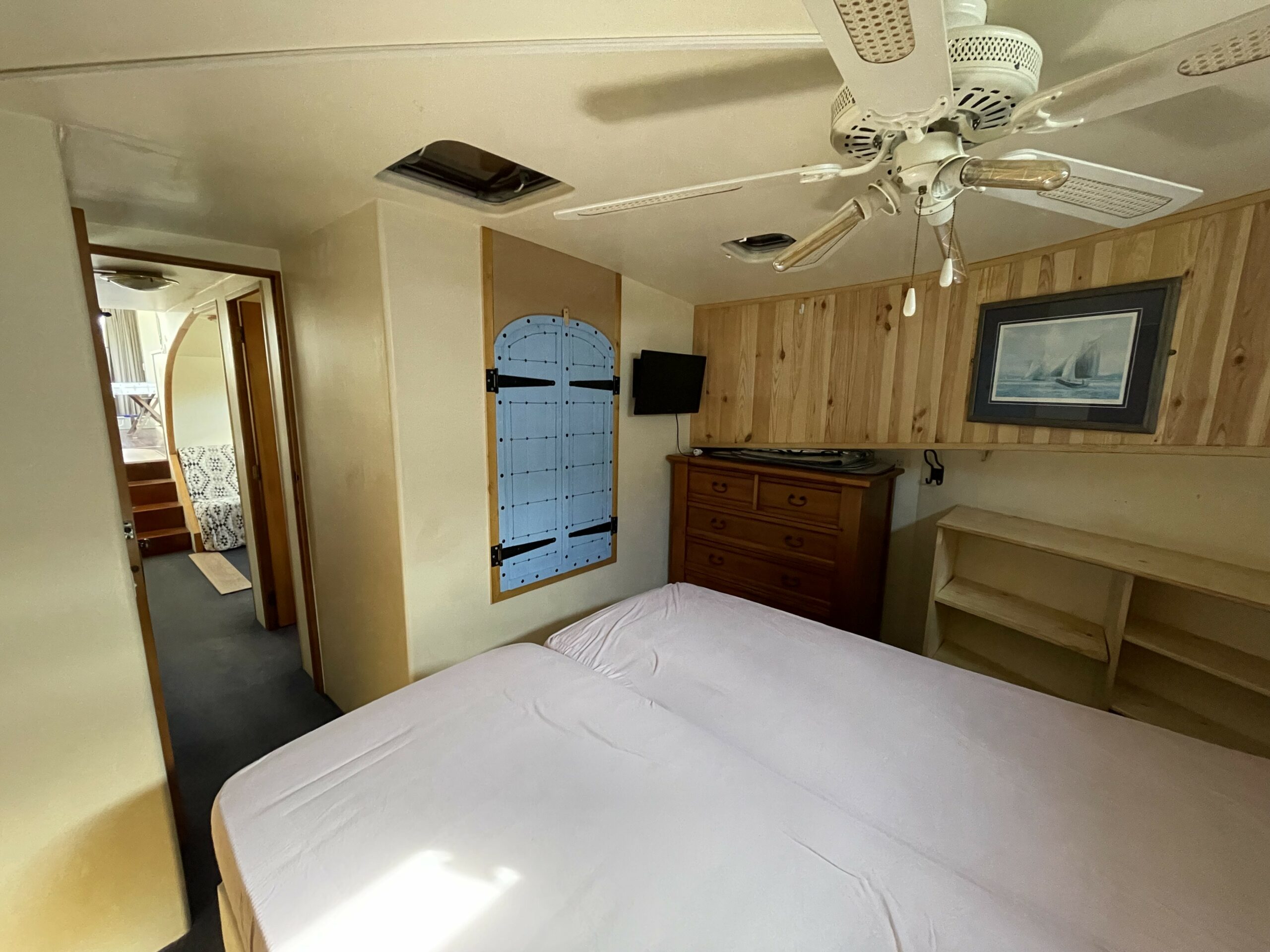 Cette péniche dispose de trois cabines : deux cabines latérales, l’une transformée en salon et l’autre en bureau, ainsi qu’une cabine avant avec un grand lit double central. De plus, deux salles de bain, chacune équipée d’une douche et de WC électriques, viennent compléter le confort de l’aménagement.