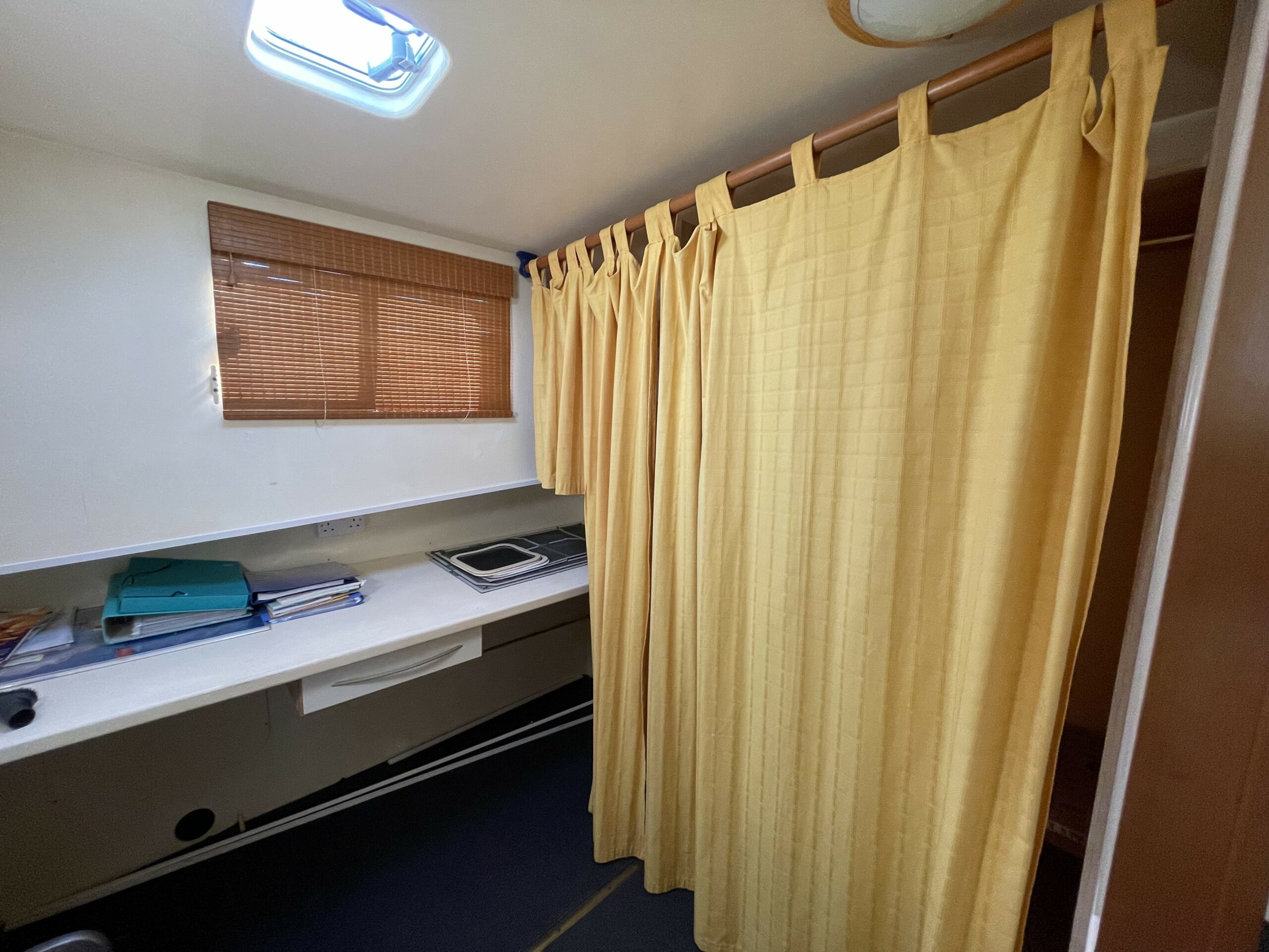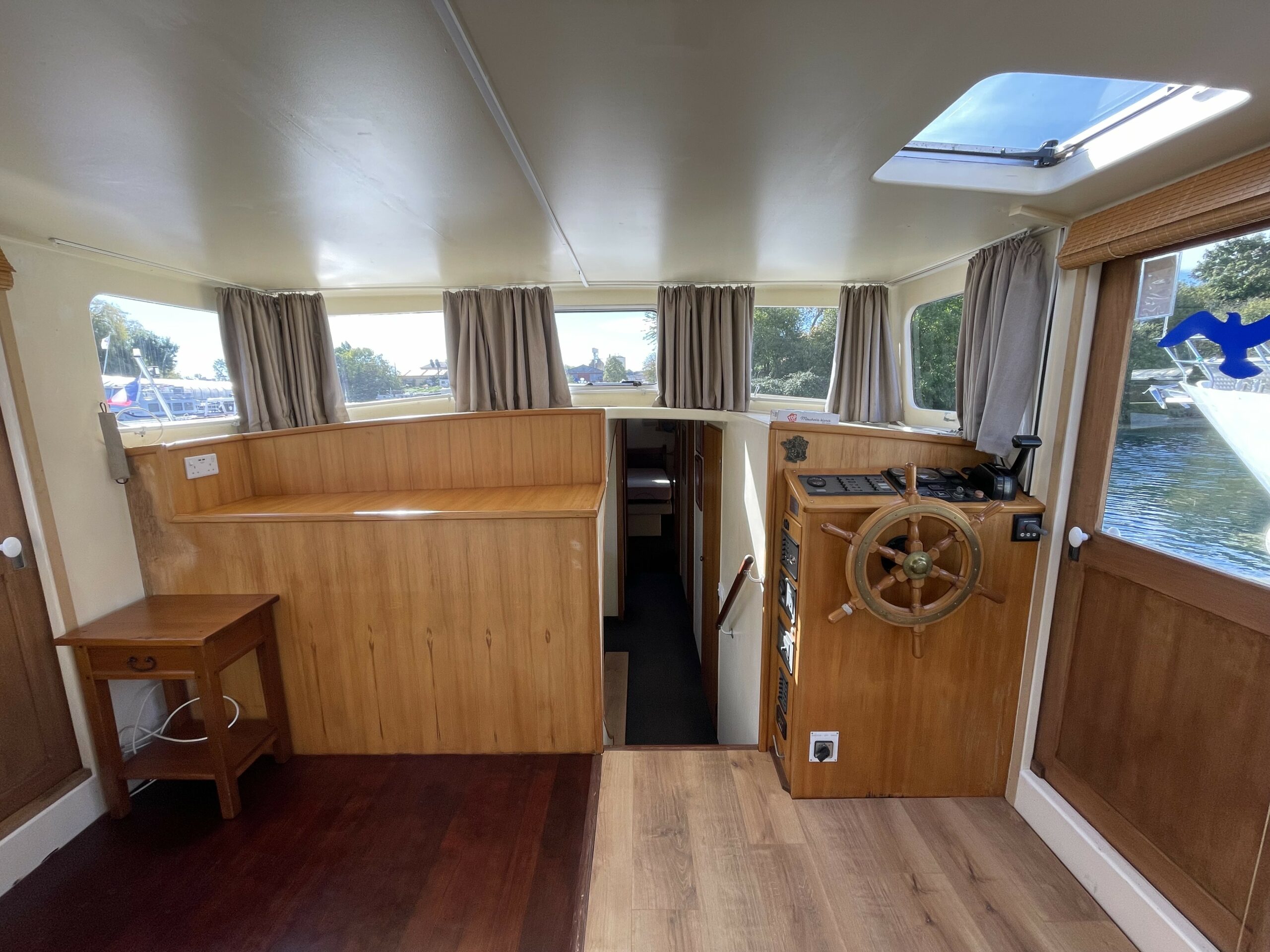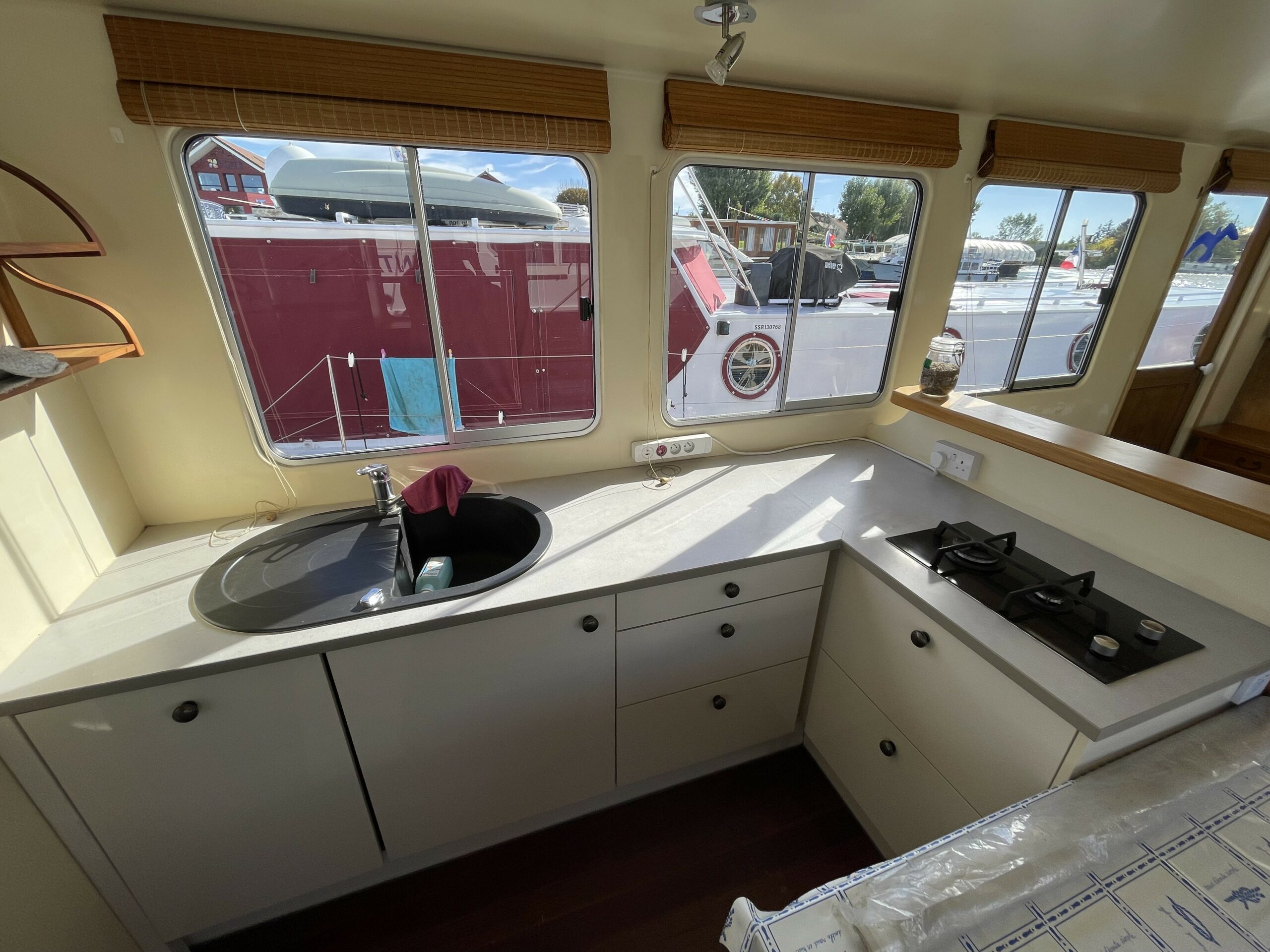 Sur le plan technique, la péniche bénéficie d’un moteur diesel John Deere de 130 cv, d’un propulseur d’étrave Sidepower de 9 cv, d’un poste de pilotage hydraulique et d’un guindeau électrique. En complément, des réservoirs généreux l’équipent : 2 600 L de carburant, 2 900 L d’eau potable et 60 L pour les eaux noires.