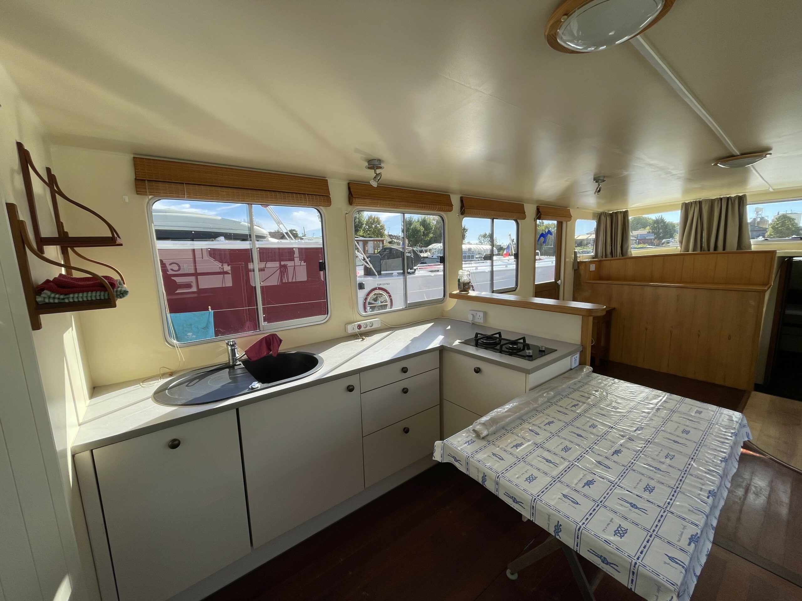 Cette péniche lumineuse et confortable de 16 mètres de long et de 4,30 mètres de large, construite en 2000, est idéale aussi bien pour la navigation fluviale que pour la vie à bord. En effet, elle propose un grand espace de vie spacieux et convivial, comprenant une cuisine équipée (plaque de cuisson au gaz, four 220V, réfrigérateur, congélateur, micro-ondes), ouverte sur un coin repas et un poste de pilotage.