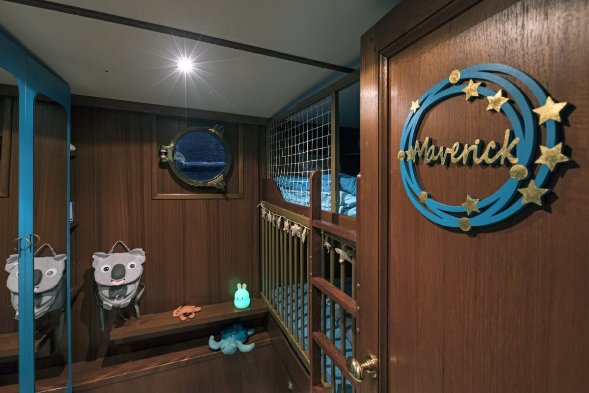 La cabine propriétaire dispose d’un lit double central et d’une penderie, créant un espace nuit confortable et bien organisé. Une cabine invités avec couchettes superposées et penderie permet d’accueillir famille ou amis. L’ensemble est complété par une salle d’eau équipée d’une douche et d’un WC.