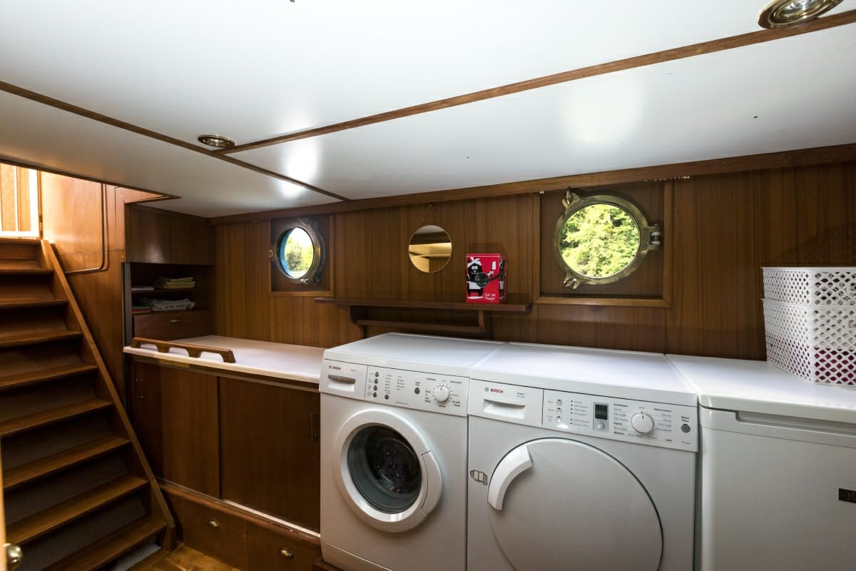 Les beaux espaces extérieurs permettent de profiter pleinement de la vie sur l’eau, que ce soit au mouillage ou en déplacement. À l’intérieur, l’agencement est fonctionnel et bien pensé. Une coursive accueille un congélateur, un lave-linge et un sèche-linge, apportant un vrai confort au quotidien.