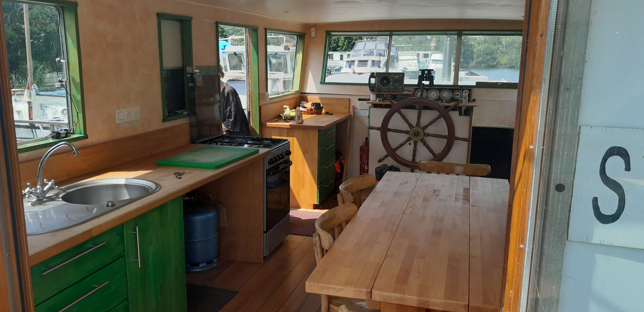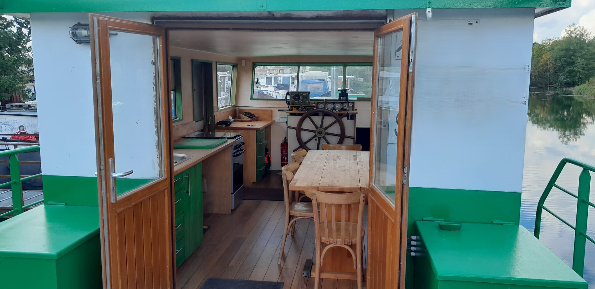 Dès l’extérieur, vous serez séduits par la vaste terrasse de plain-pied, parfaite pour imaginer un salon d’été, un espace de réception ou une zone de détente avec vue panoramique. Elle communique directement avec la grande timonerie, aujourd’hui transformée en cuisine baignée de lumière, offrant un cadre chaleureux et convivial.