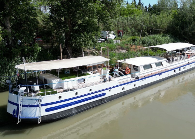Anciennement dédiée au transport du blé entre Reims et Rouen, cette péniche Freycinet de 38.71 mètres témoigne d’un riche passé fluvial. Elle a ensuite été transformée en habitation dans les années 1980. Puis, en 2021, la propriétaire actuelle l’a rachetée et a entrepris d’importants travaux de mise aux normes et de rénovation intérieure, réalisés en 2022.