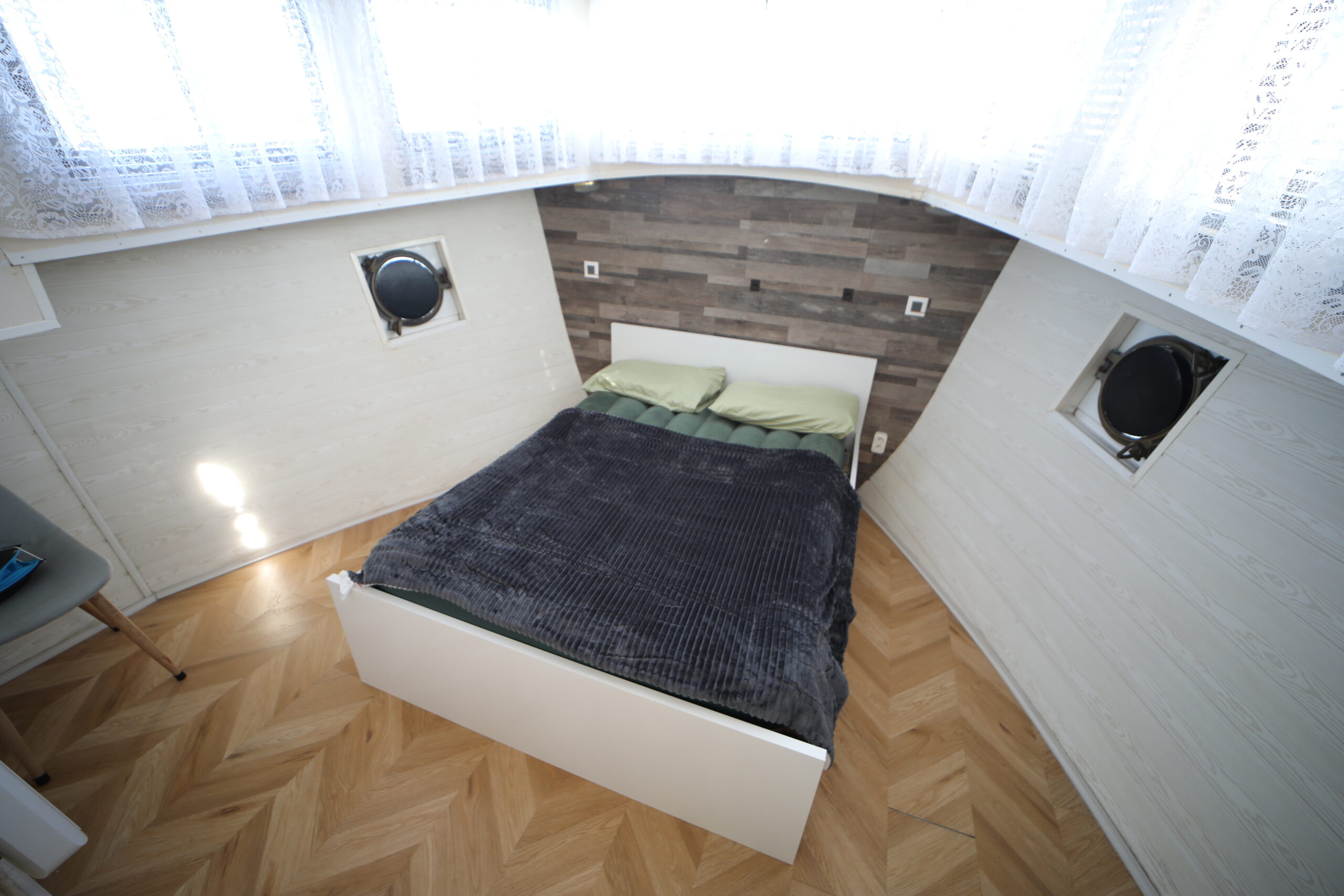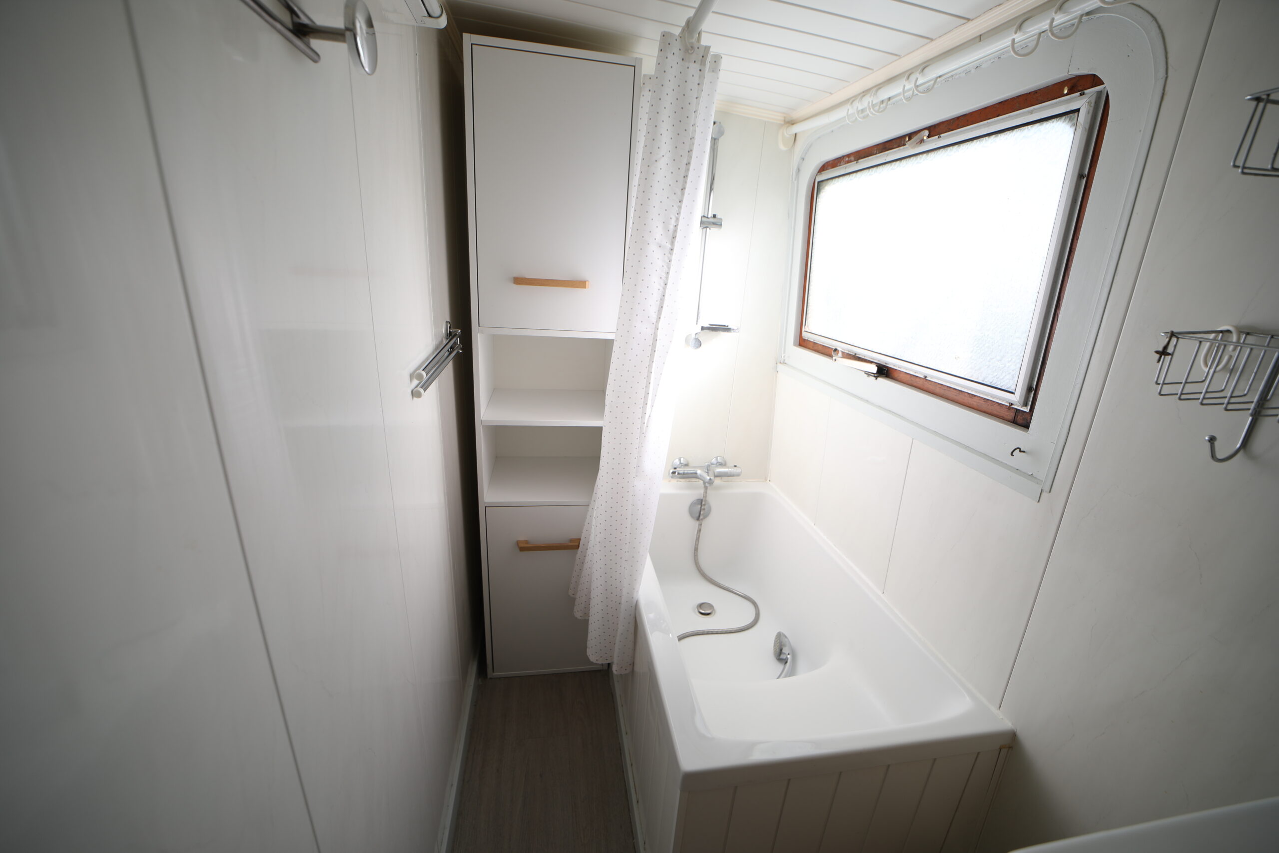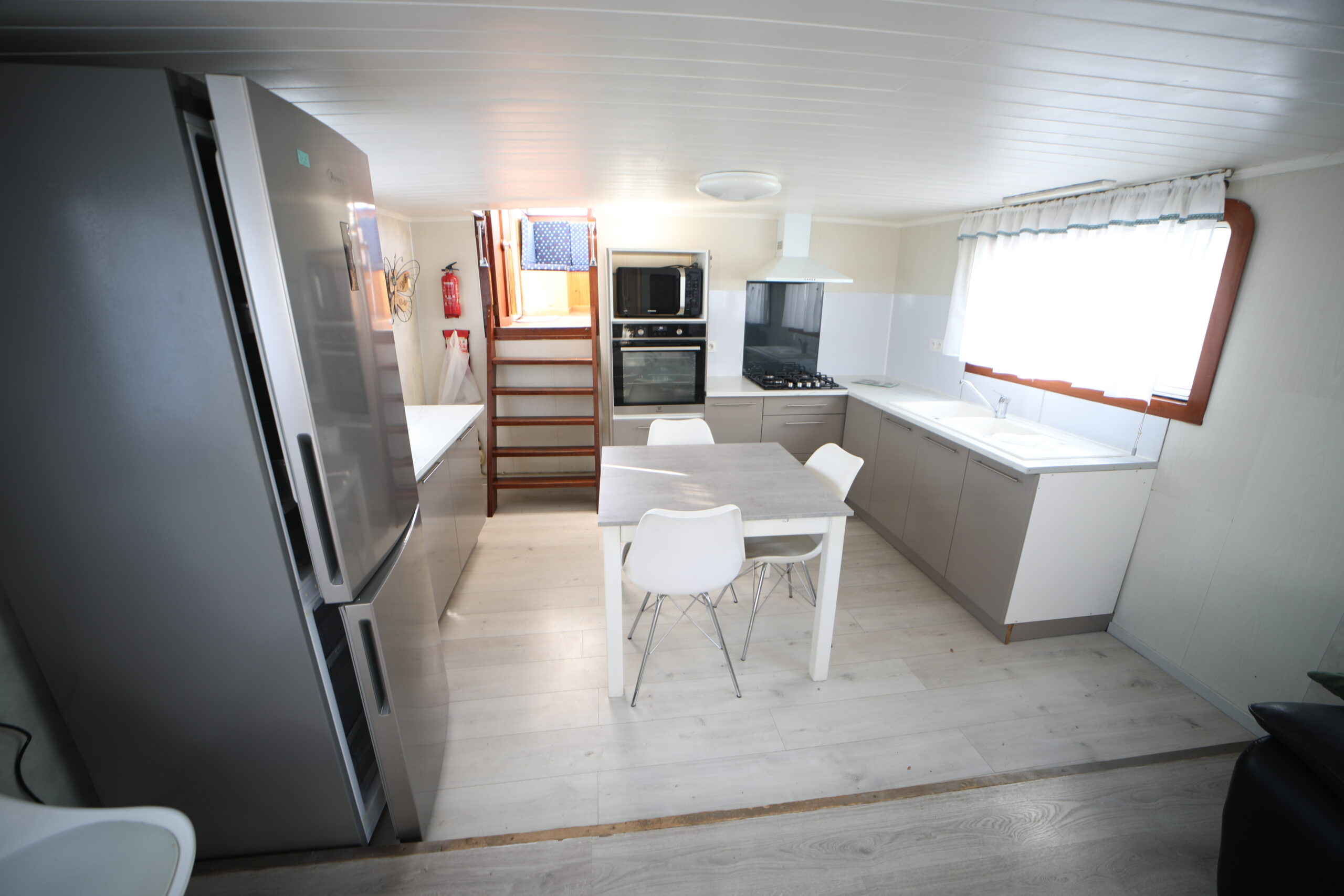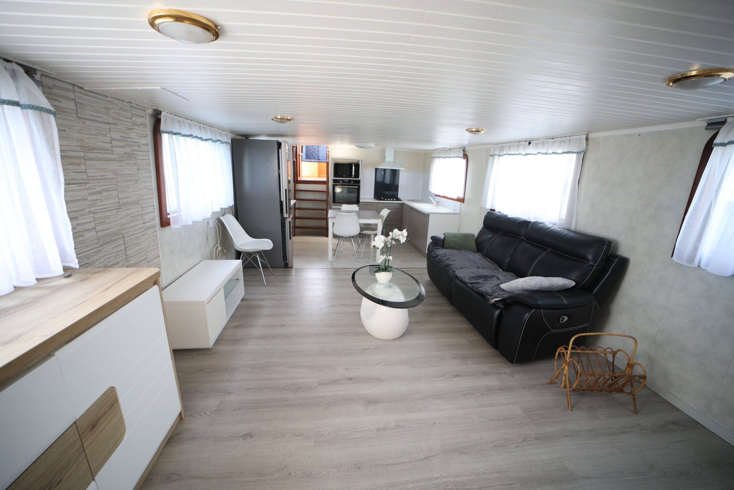 Tant à l’extérieur qu’à l’intérieur, la péniche a fait l’objet d’une rénovation particulièrement soignée. D’une part, la timonerie, spacieuse et lumineuse, est démontable afin de permettre le passage sous les ponts sans difficulté. D’autre part, la partie habitable, moderne et épurée, propose une cuisine ouverte entièrement équipée, comprenant une plaque de cuisson au gaz, un four 220V, un réfrigérateur 220V, un congélateur et une hotte aspirante. Ainsi, cet espace s’ouvre harmonieusement sur un salon convivial et lumineux, une salle de bain, une chambre double, mais aussi deux dressings pouvant facilement être transformés en cabines supplémentaires selon les besoins.