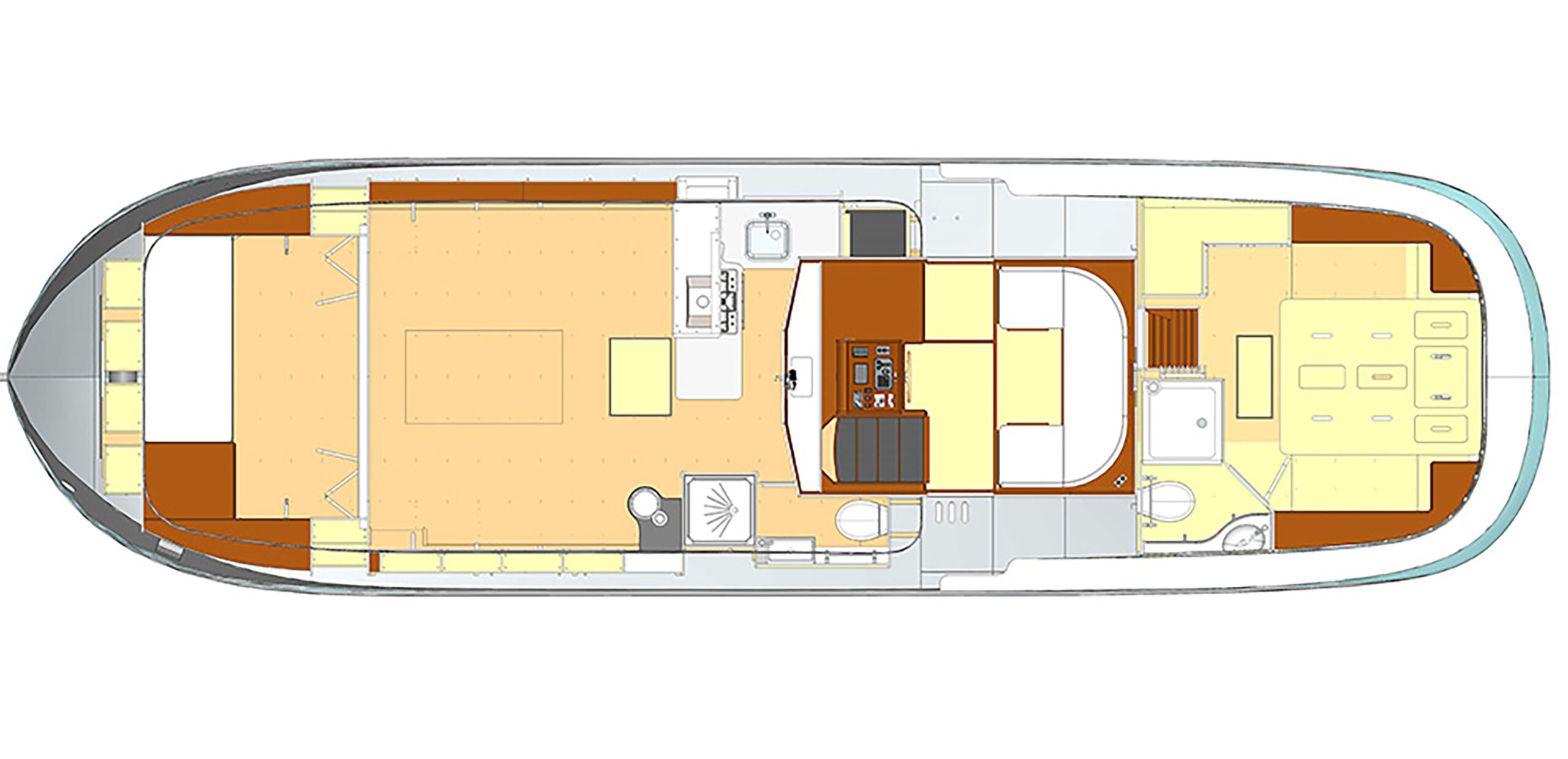Enfin, à l’extérieur, le pont-terrasse à l’arrière offre un véritable espace de vie supplémentaire. Un second poste de pilotage,y est installé, parfait pour manœuvrer en toute convivialité lors des beaux jours.