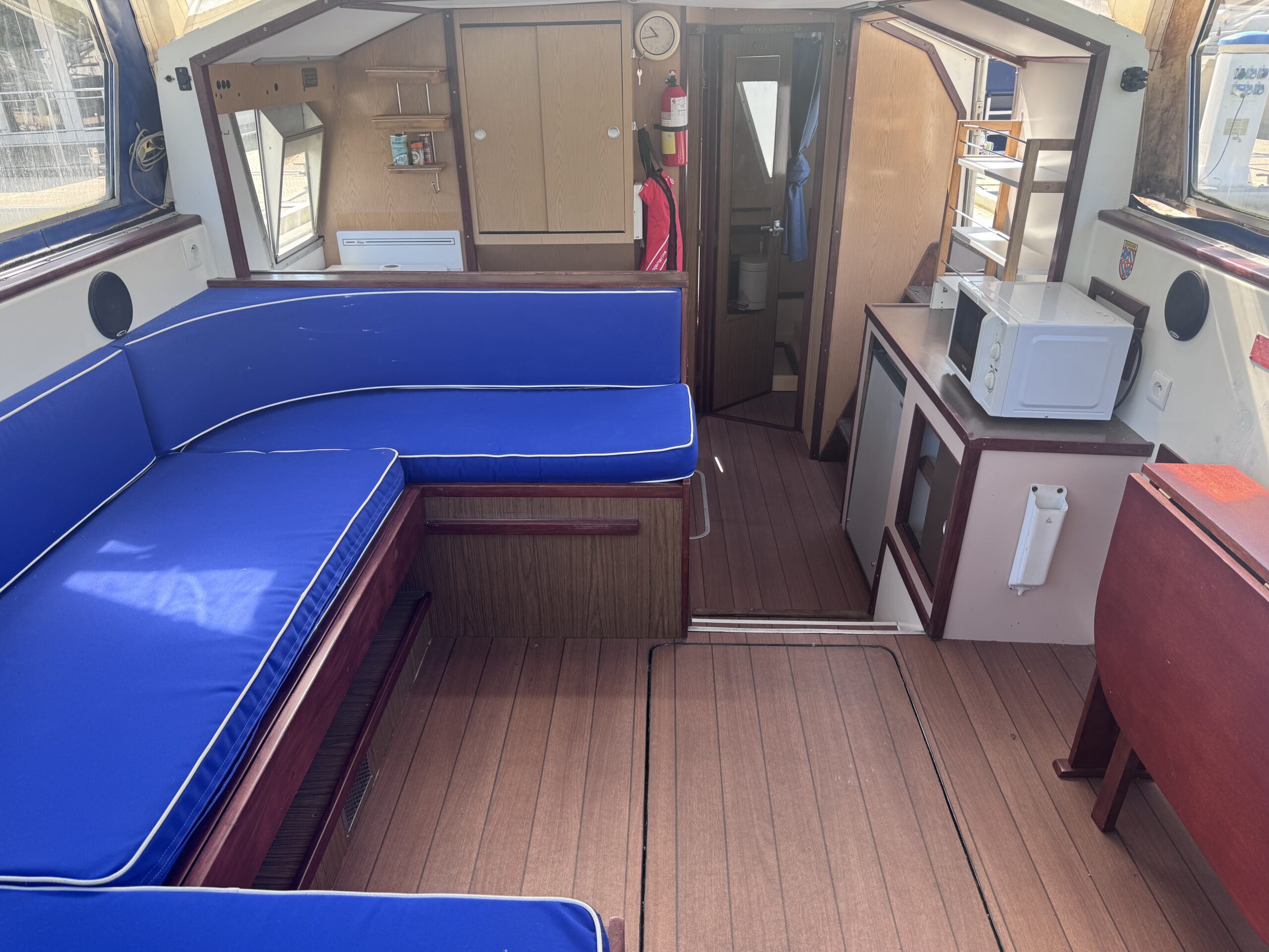 L’intérieur est spacieux et lumineux, avec un carré convivial, une cuisine fonctionnelle, plusieurs couchages ainsi que deux salles d’eau, permettant d’accueillir famille et amis dans de bonnes conditions. Le bateau est bien pensé pour une vie à bord agréable.