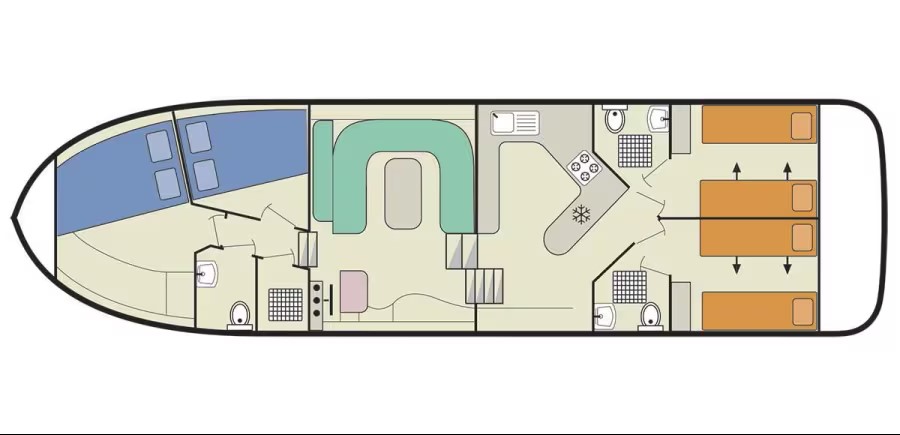 Construit par le chantier réputé Porter & Haylett, ce bateau séduit par son aménagement spacieux et son confort pensé pour la vie à bord. Le grand salon, véritable cœur de vie du bateau, offre un espace idéal pour se retrouver, se détendre ou partager un repas convivial autour de sa grande table. Lumineux et chaleureux, il intègre une cuisine moderne parfaitement équipée (plaque de cuisson gaz, réfrigérateurs, congélateur, four 22OV, hotte aspirante, micro-ondes), ainsi qu’un poste de pilotage confortable.