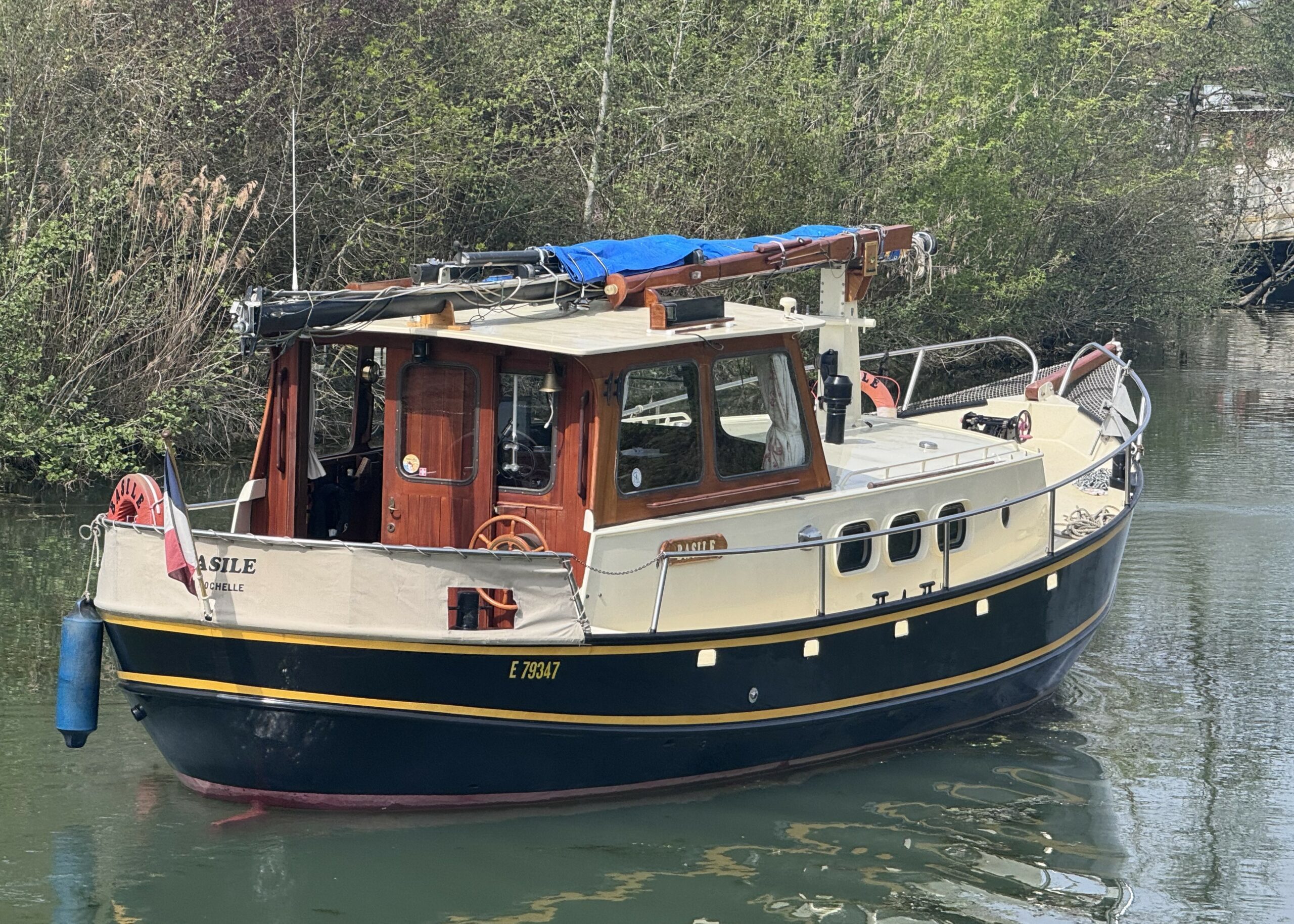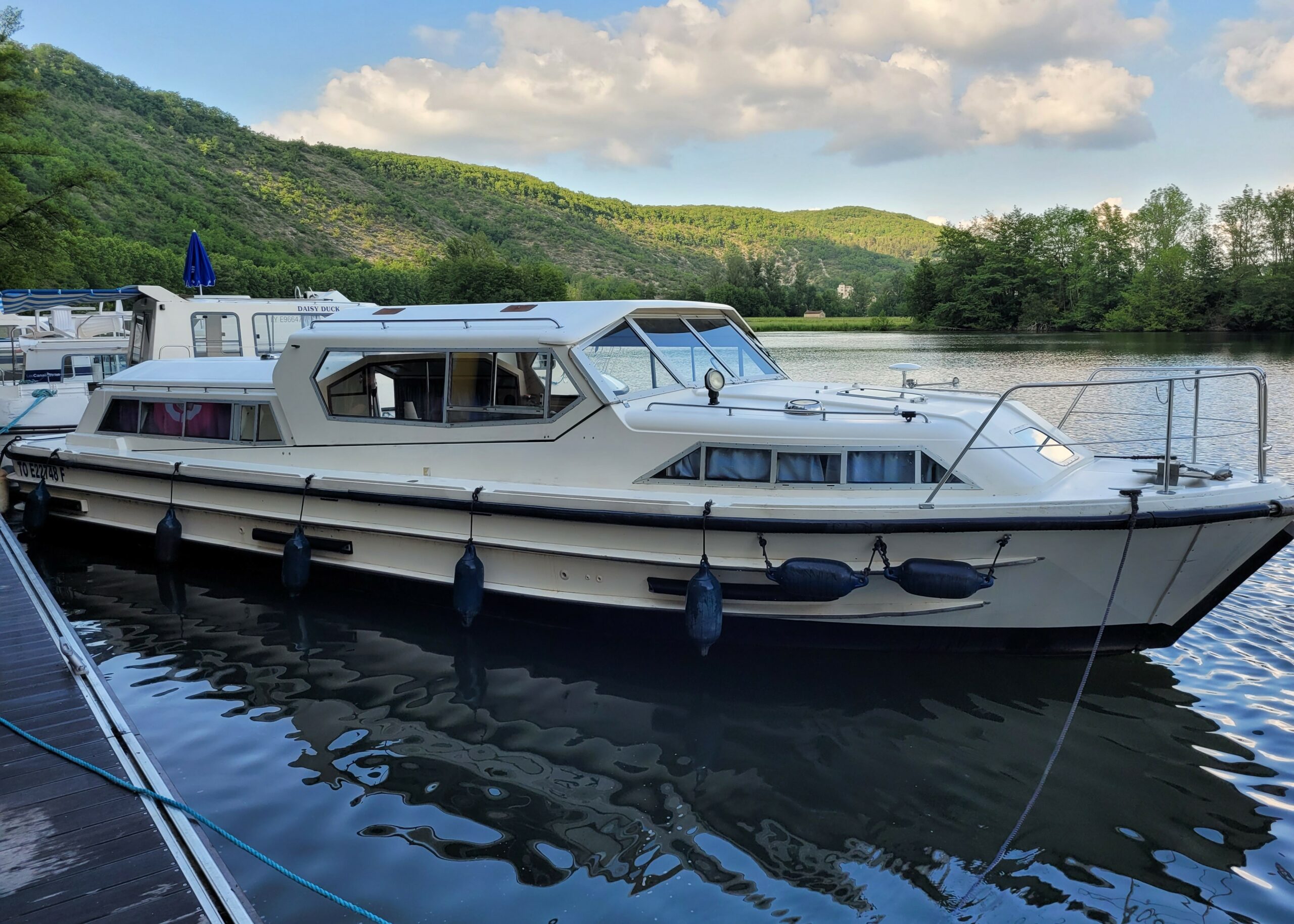 Vedette Espade de 1986, idéale pour débuter dans la navigation. Grande terrasse sur pont supérieur avec poste de pilotage. Bateau très apprécié pour son aménagement de plain pied. L’intérieur offre un salon lumineux avec dinette convertible en lit double et poste de pilotage. Cabine arrière avec lit double et lavabo. Salle de bain avec douche et WC. Cabine latérale avec 2 lits simples. Cuisine équipée. Son faible tirant d’eau permet une navigation facile sur tous les canaux.