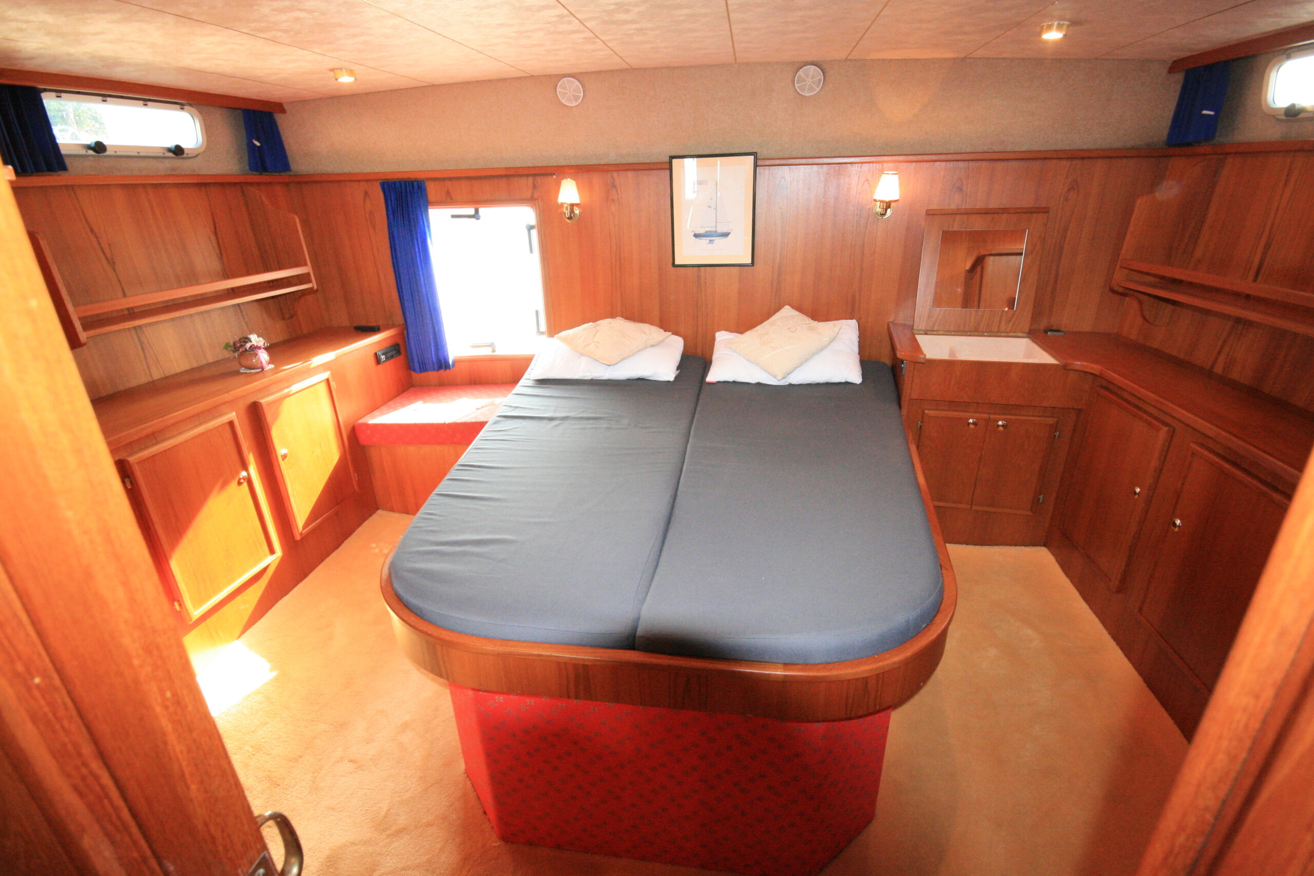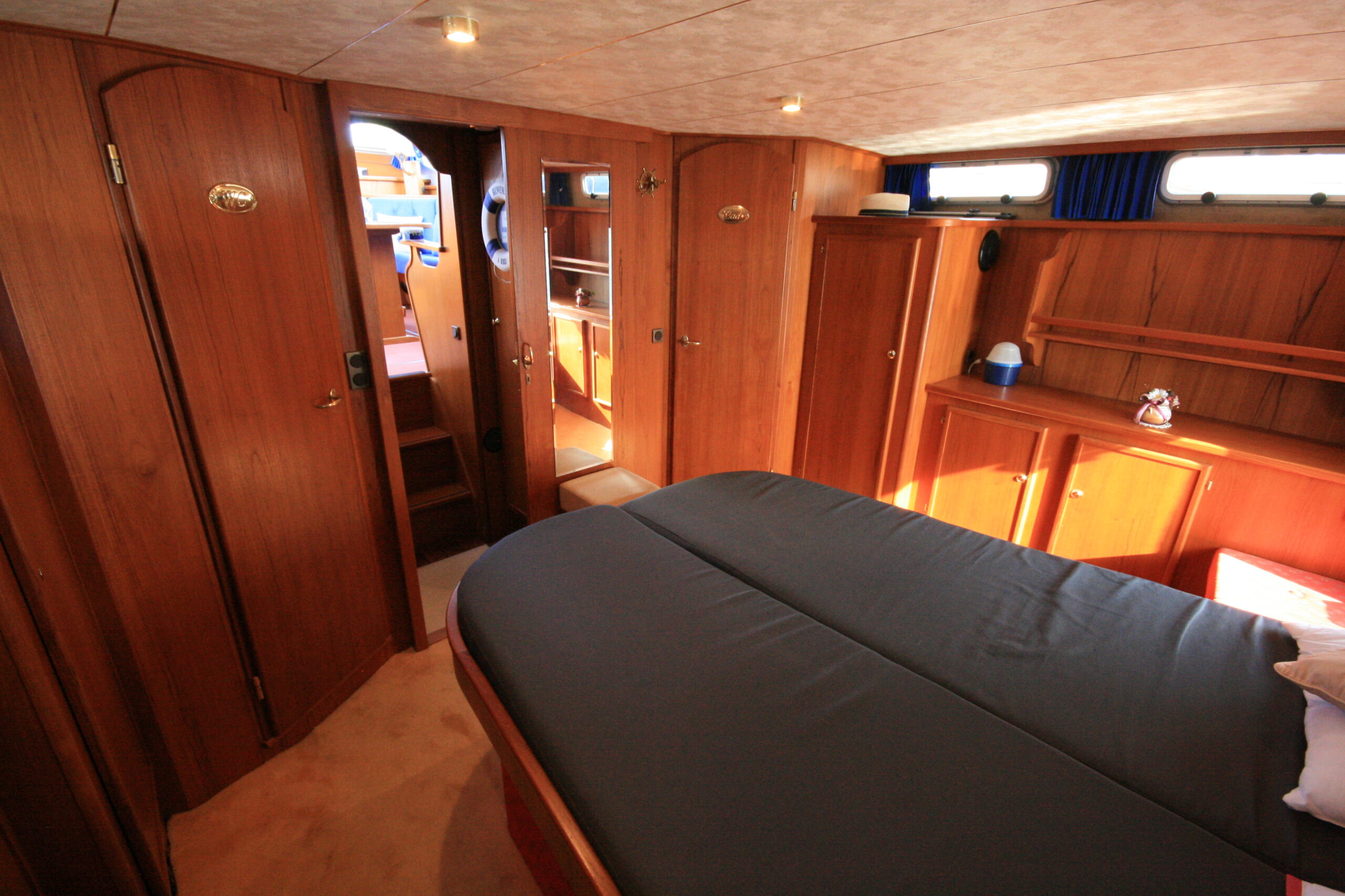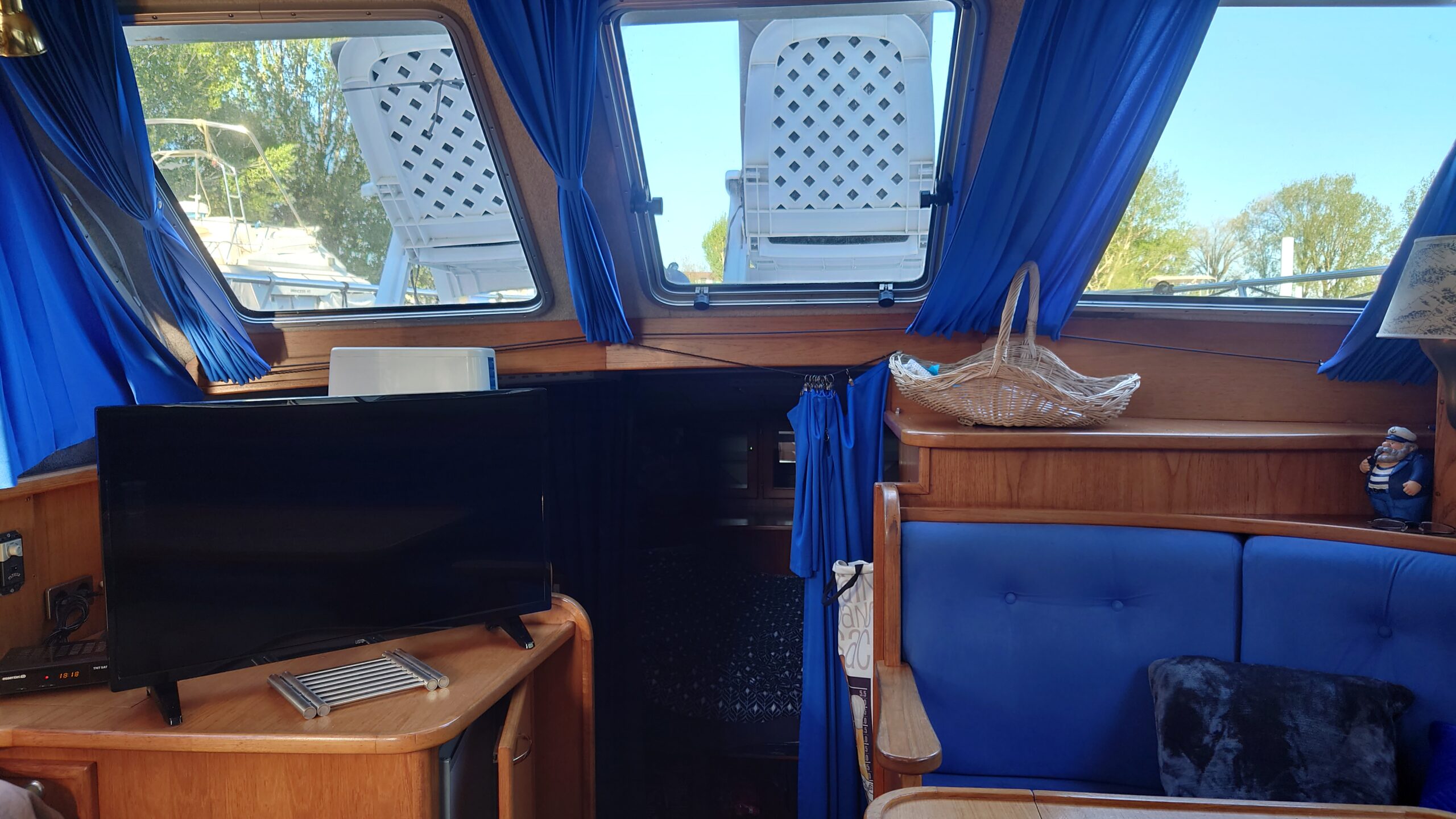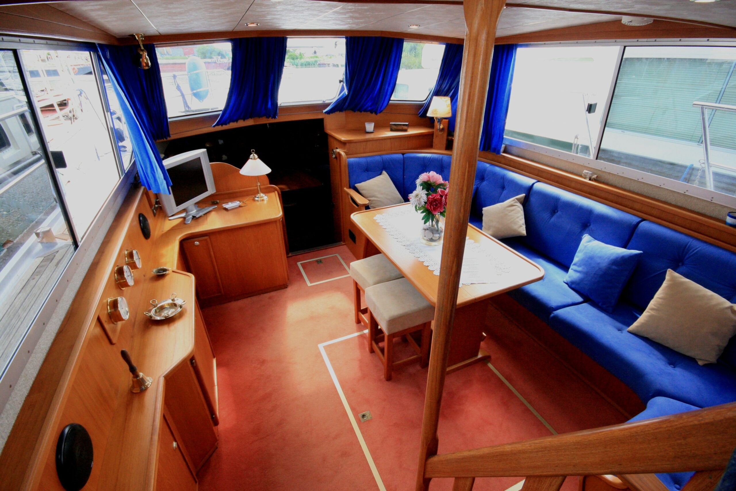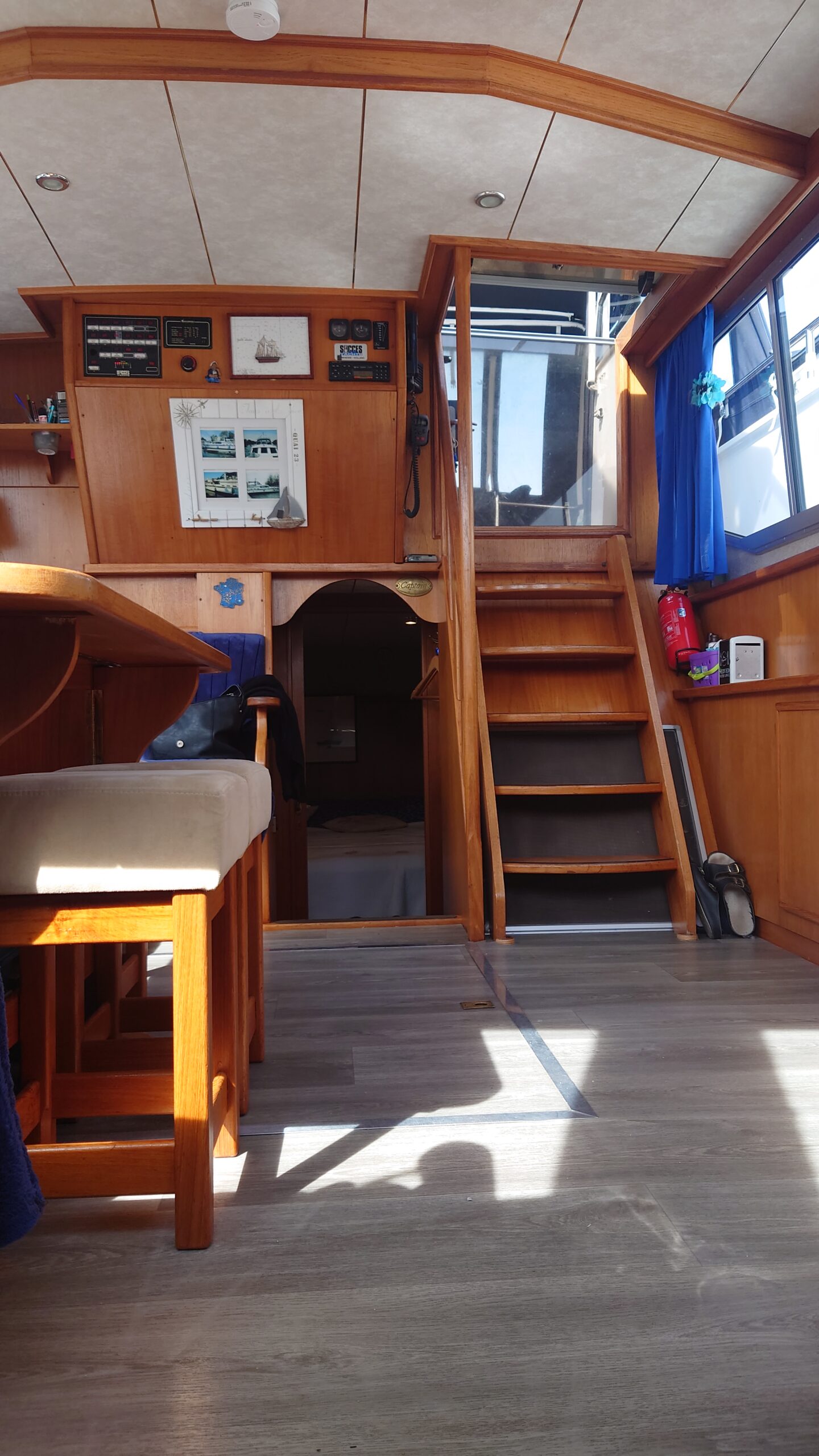 Dès l’entrée à bord, l’intérieur en bois chaleureux séduit immédiatement et installe une atmosphère conviviale et authentique. Le bateau bénéficie d’une belle luminosité naturelle, renforçant la sensation d’espace et de bien-être. Le salon spacieux constitue un véritable lieu de vie, propice à la détente et aux moments partagés.