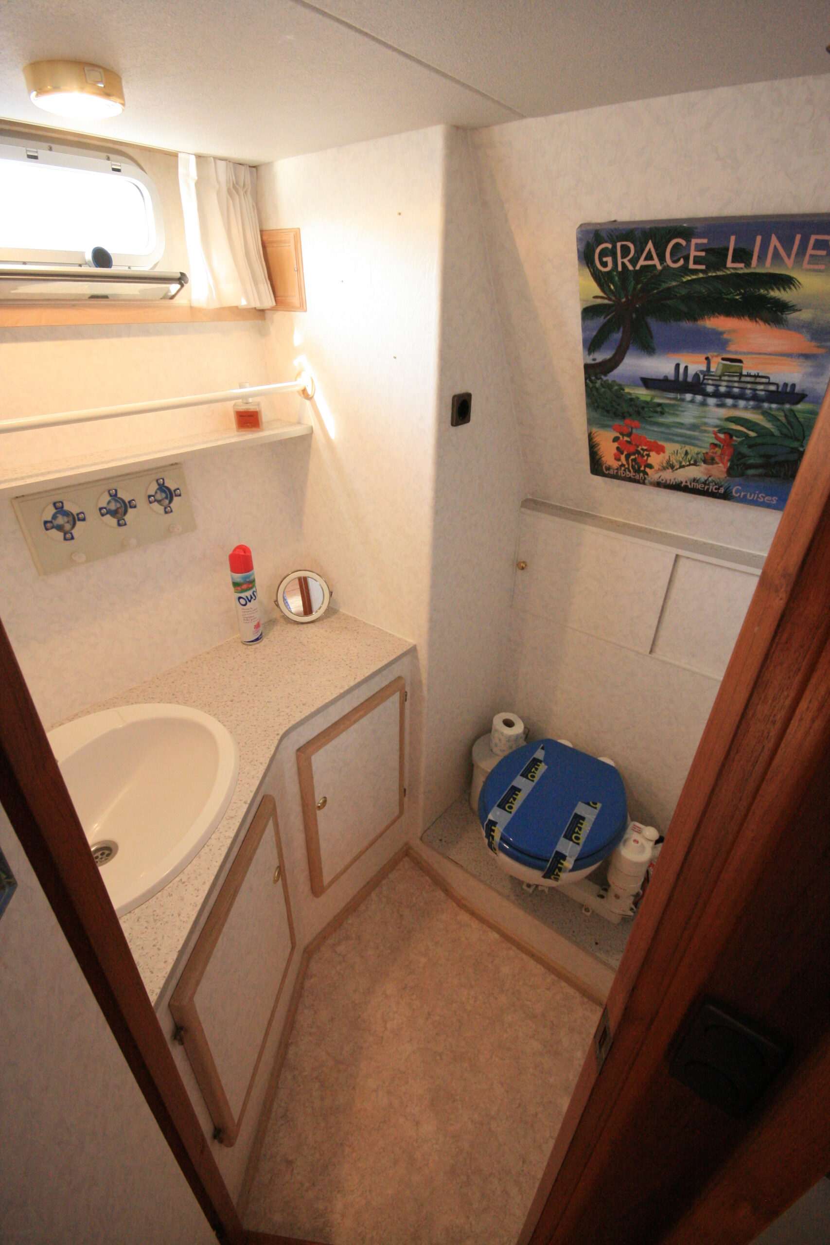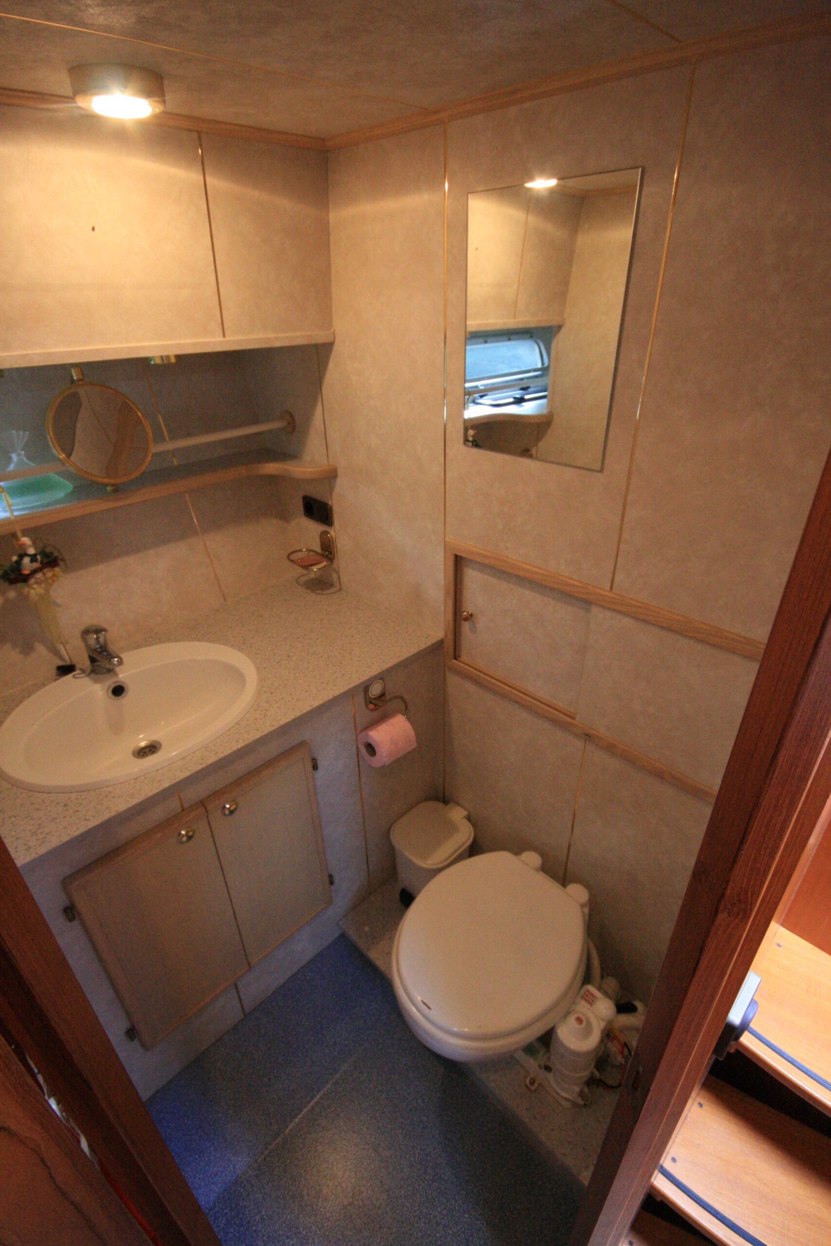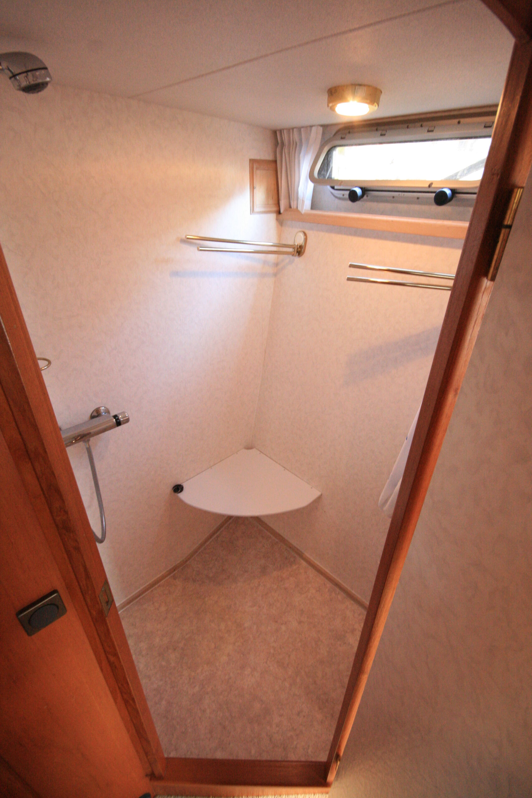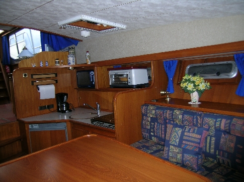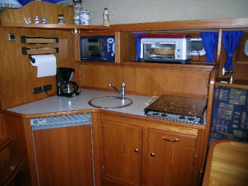 La cuisine équipée et fonctionnelle, permet de cuisiner facilement à bord. À l’arrière, la cabine avec lit double offre un couchage confortable et de nombreux rangements, parfaitement adaptés aux séjours prolongés. La salle de bain, pratique et bien entretenue, comprend une douche ainsi que deux toilettes électriques, un réel atout pour le confort au quotidien.