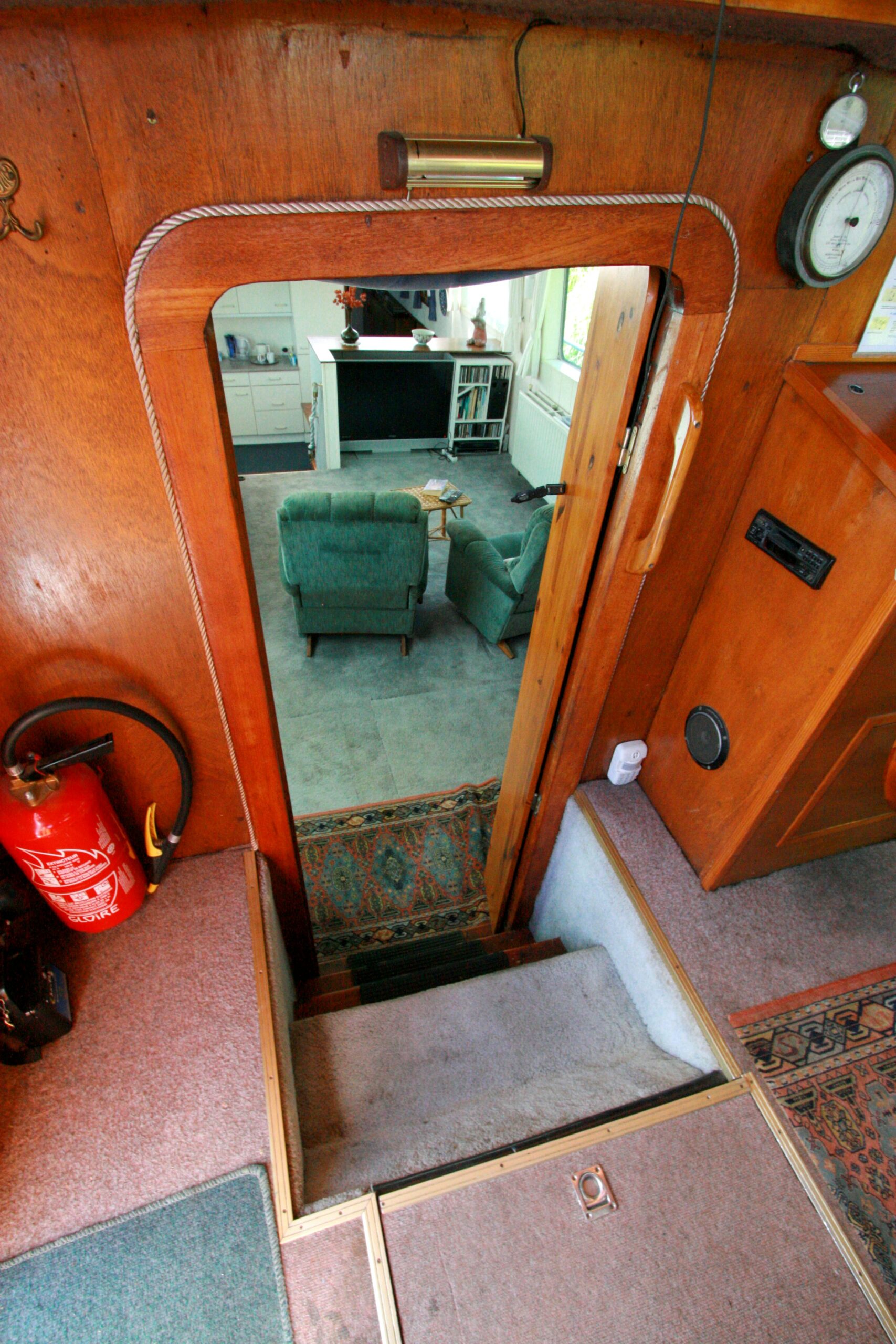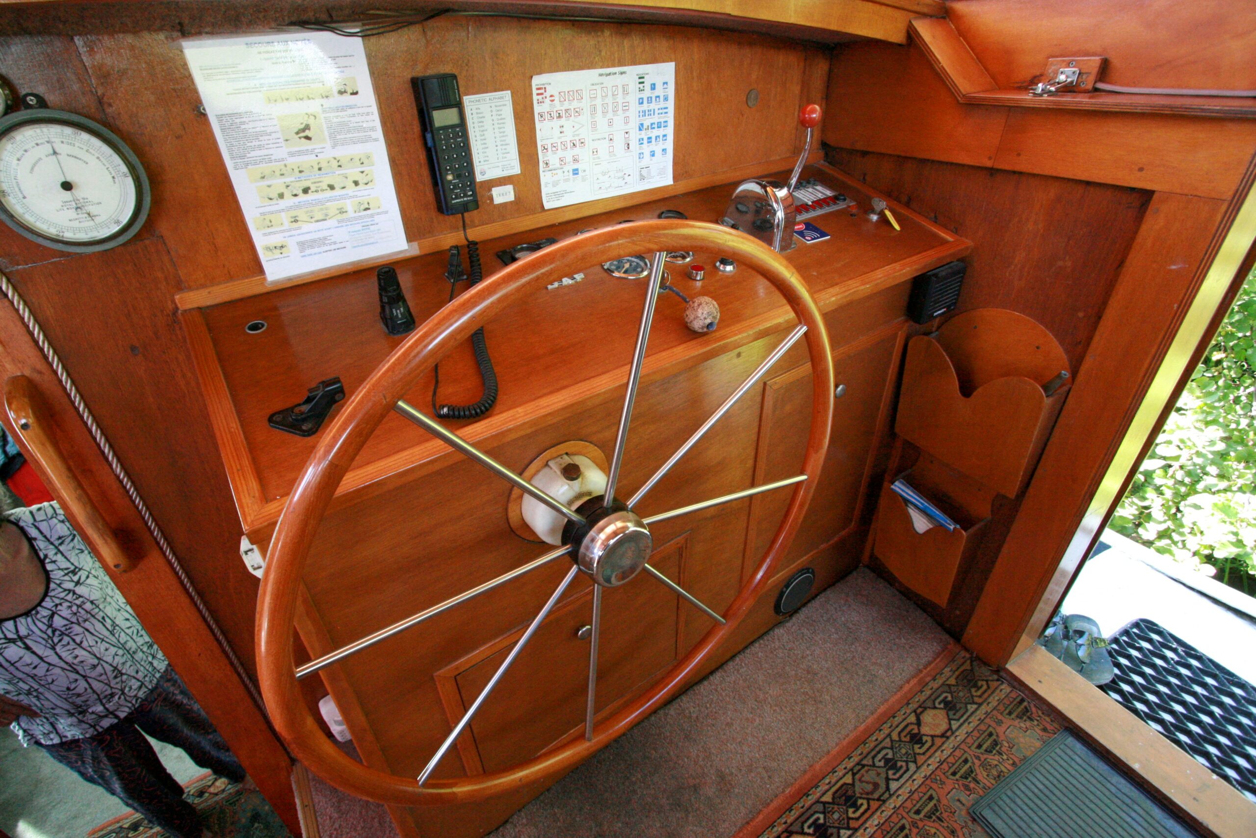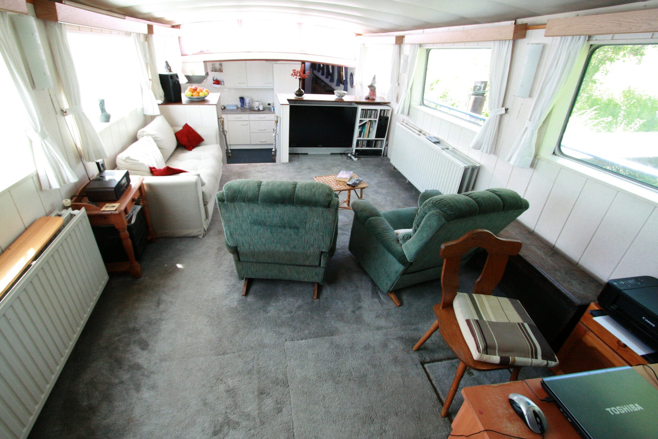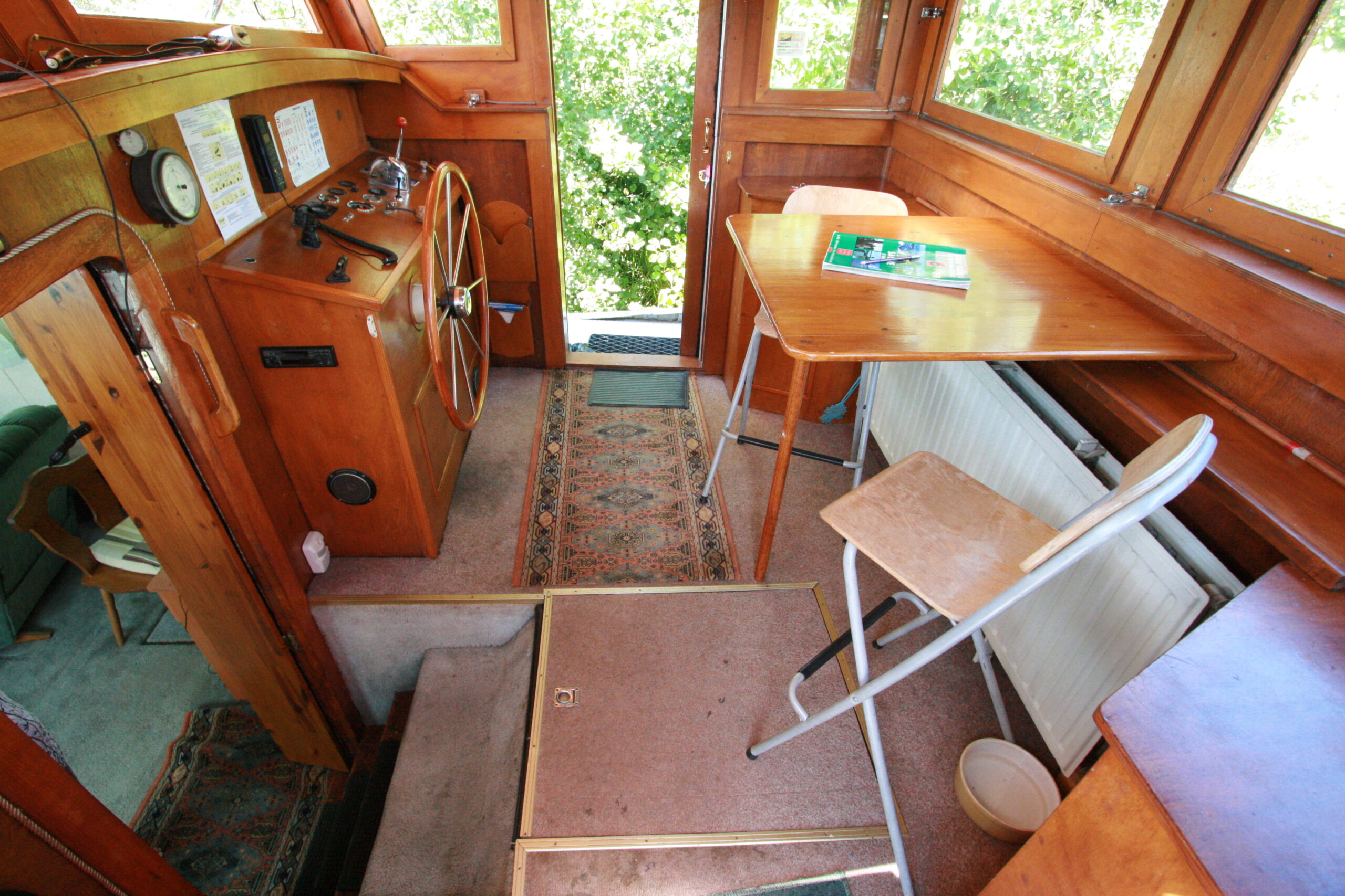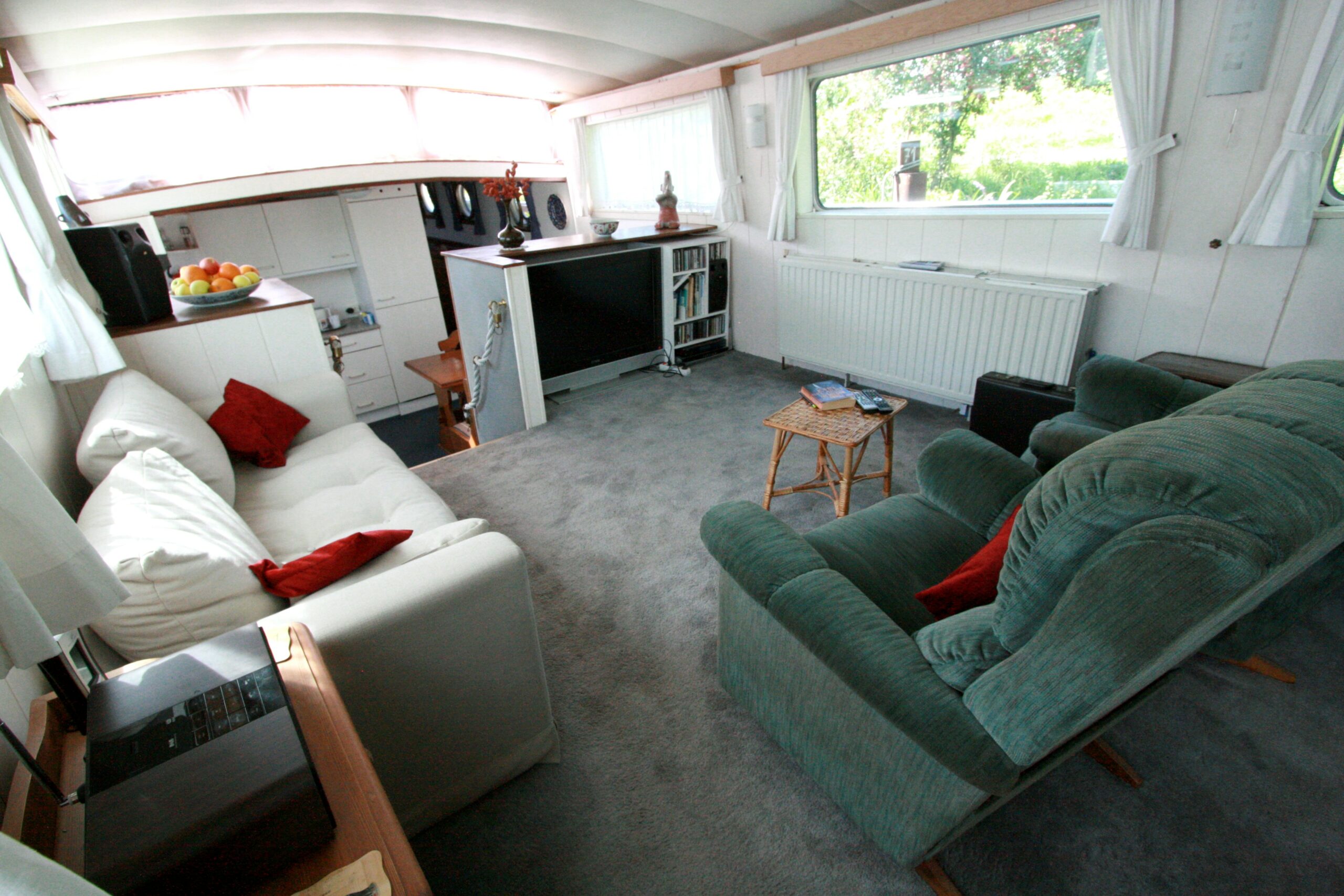 La timonerie traditionnelle équipée d’un poste de pilotage permet une navigation aisée sur toutes les voies d’eau. En descendant, on découvre un grand salon convivial avec canapé et fauteuils, attenant à une cuisine bien équipée (plaque de cuisson, four, hotte aspirante, réfrigérateur, coin repas confortable).