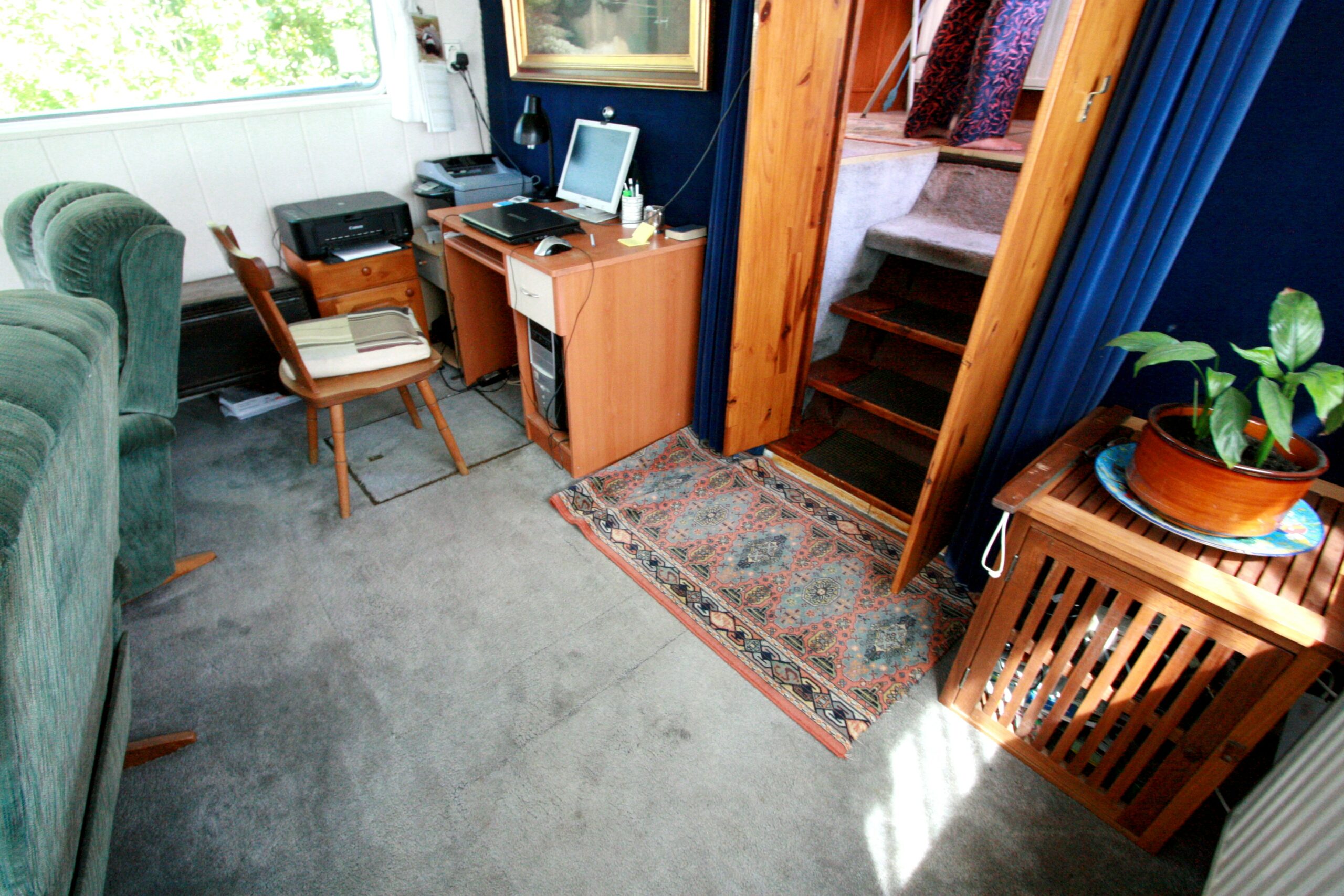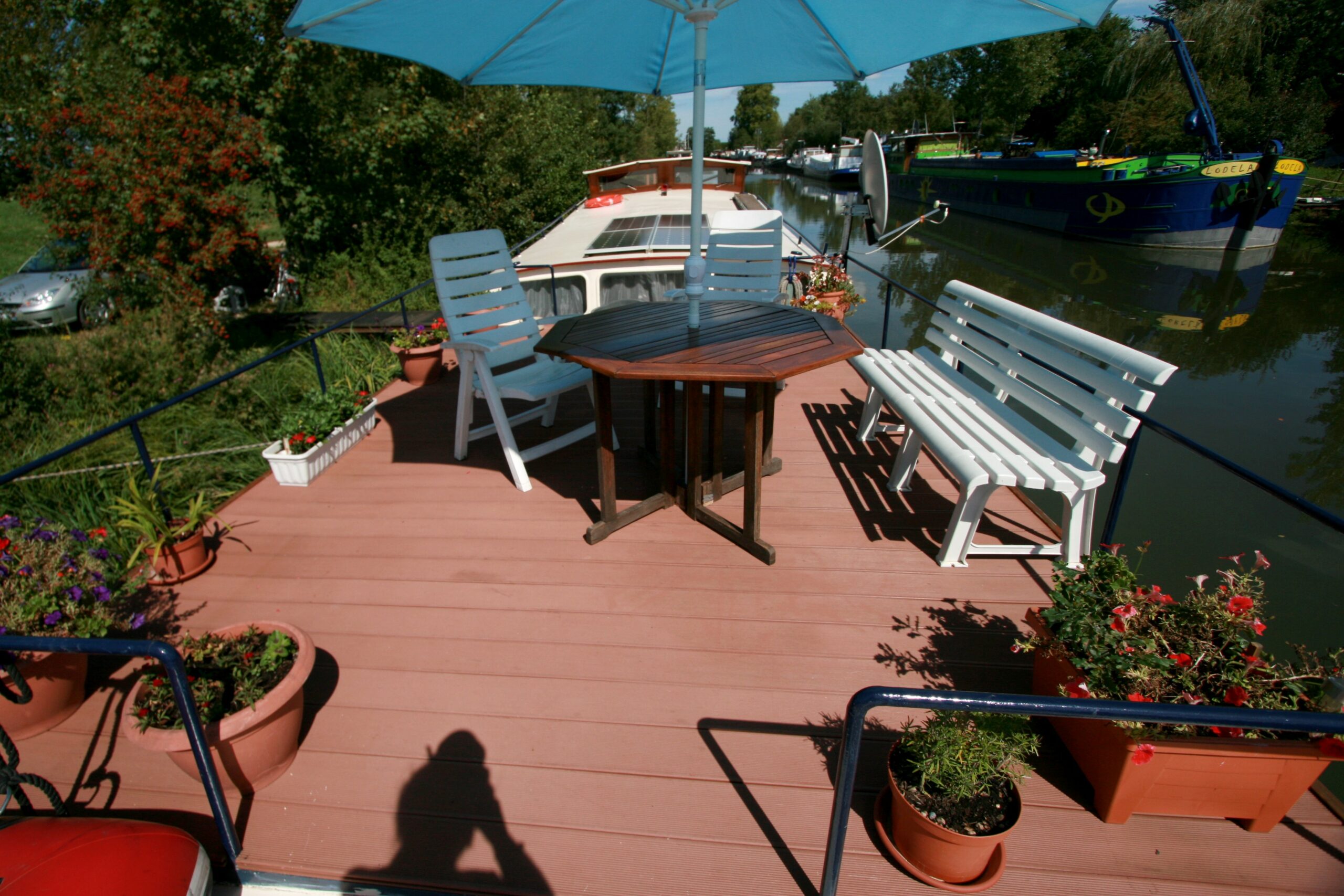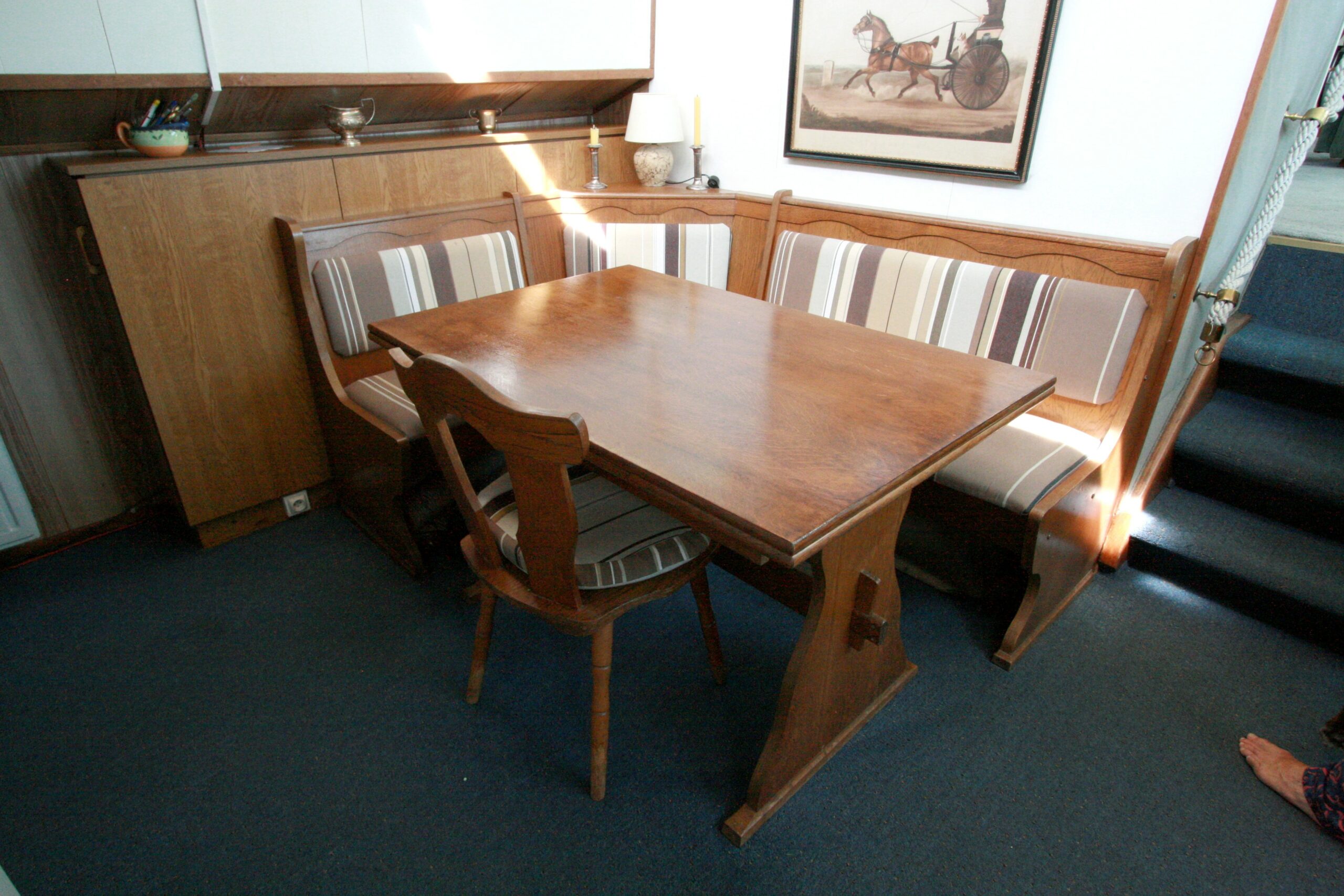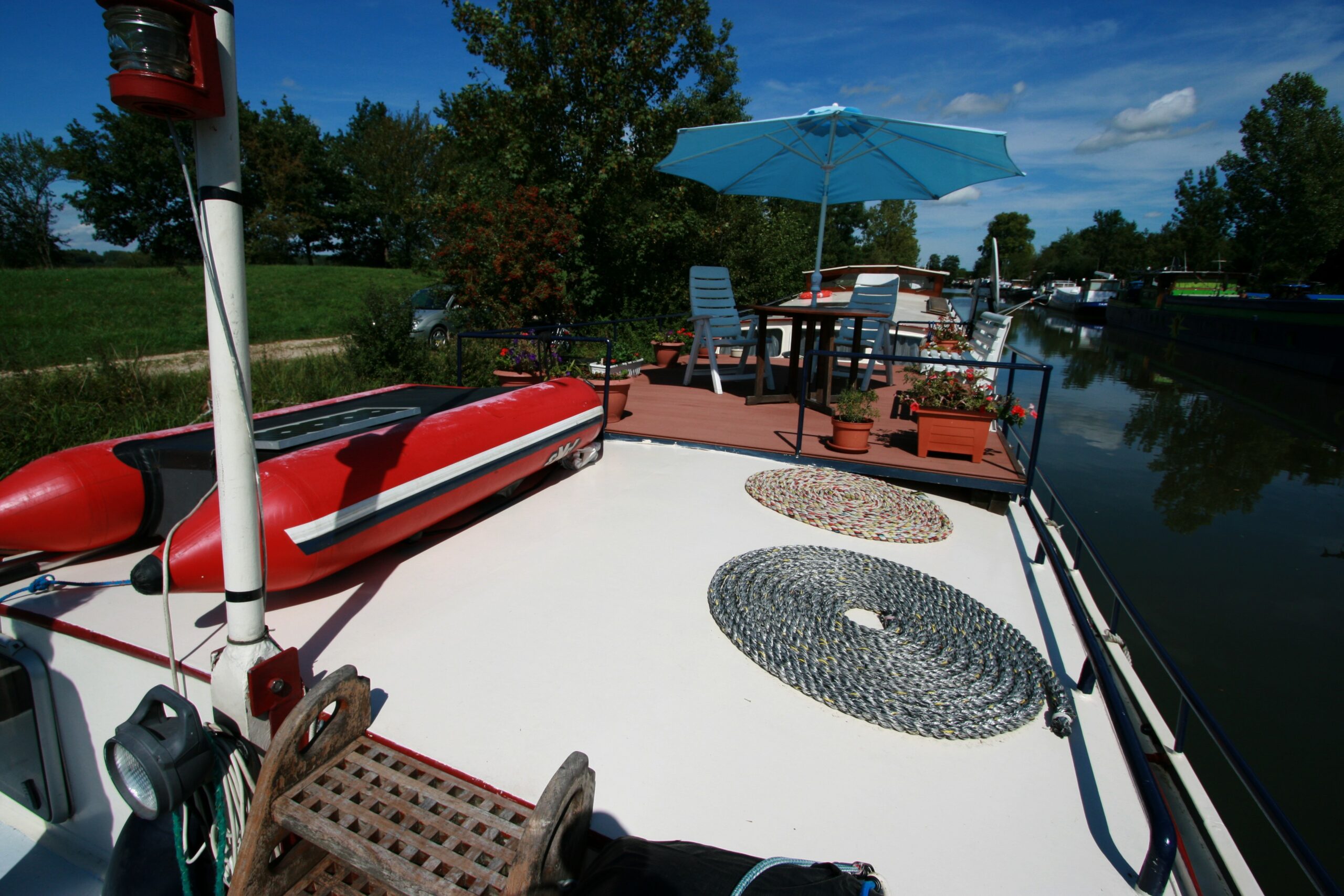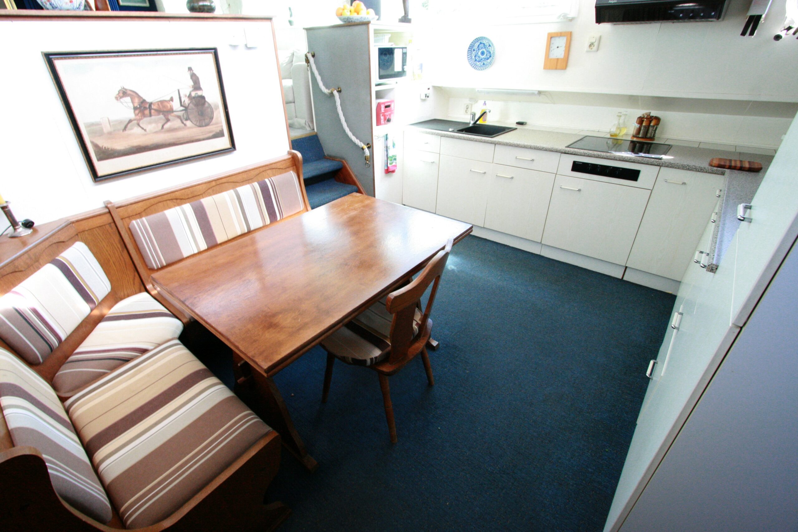 La timonerie traditionnelle équipée d’un poste de pilotage permet une navigation aisée sur toutes les voies d’eau. En descendant, on découvre un grand salon convivial avec canapé et fauteuils, attenant à une cuisine bien équipée (plaque de cuisson, four, hotte aspirante, réfrigérateur, coin repas confortable).