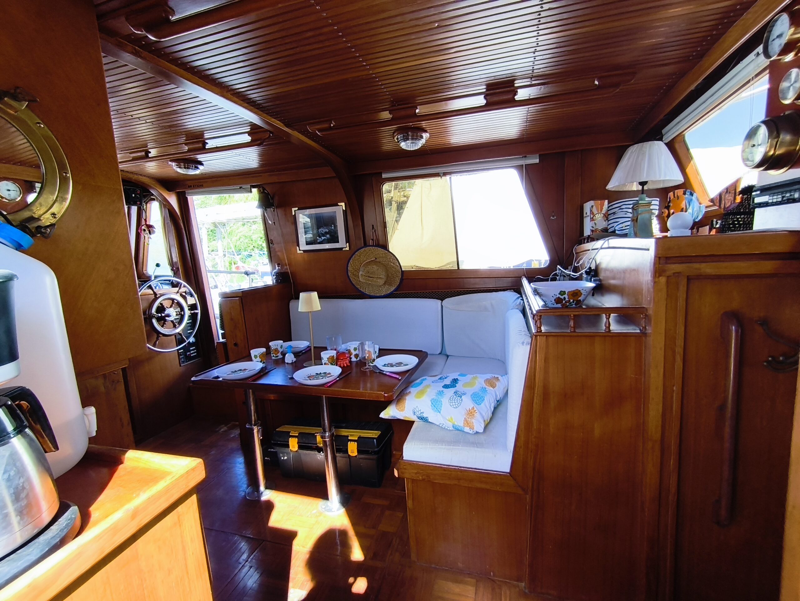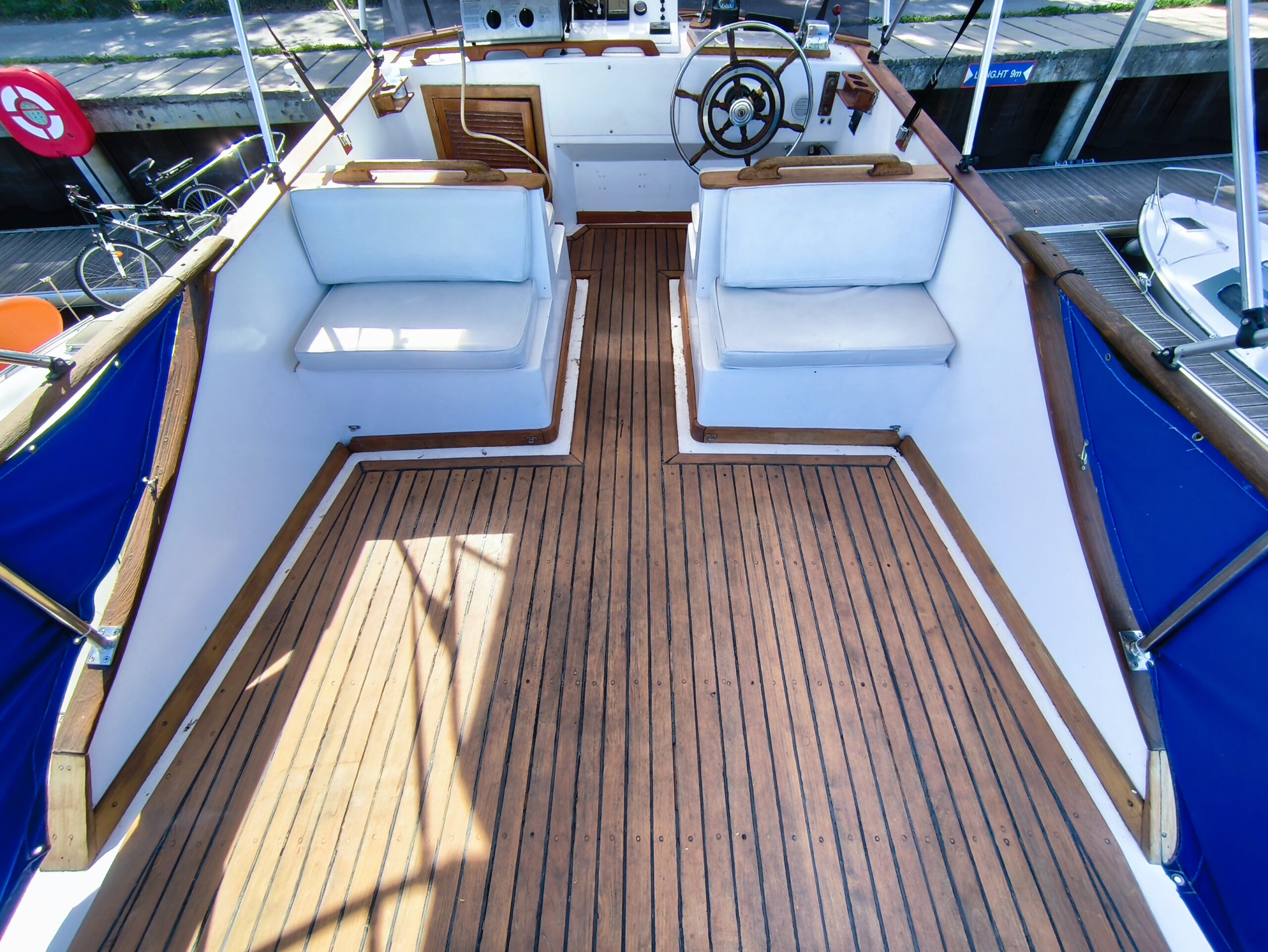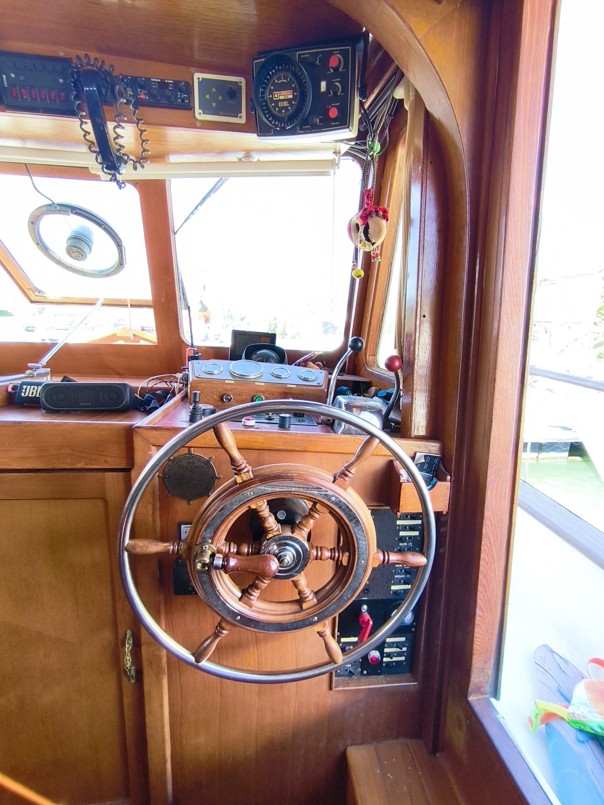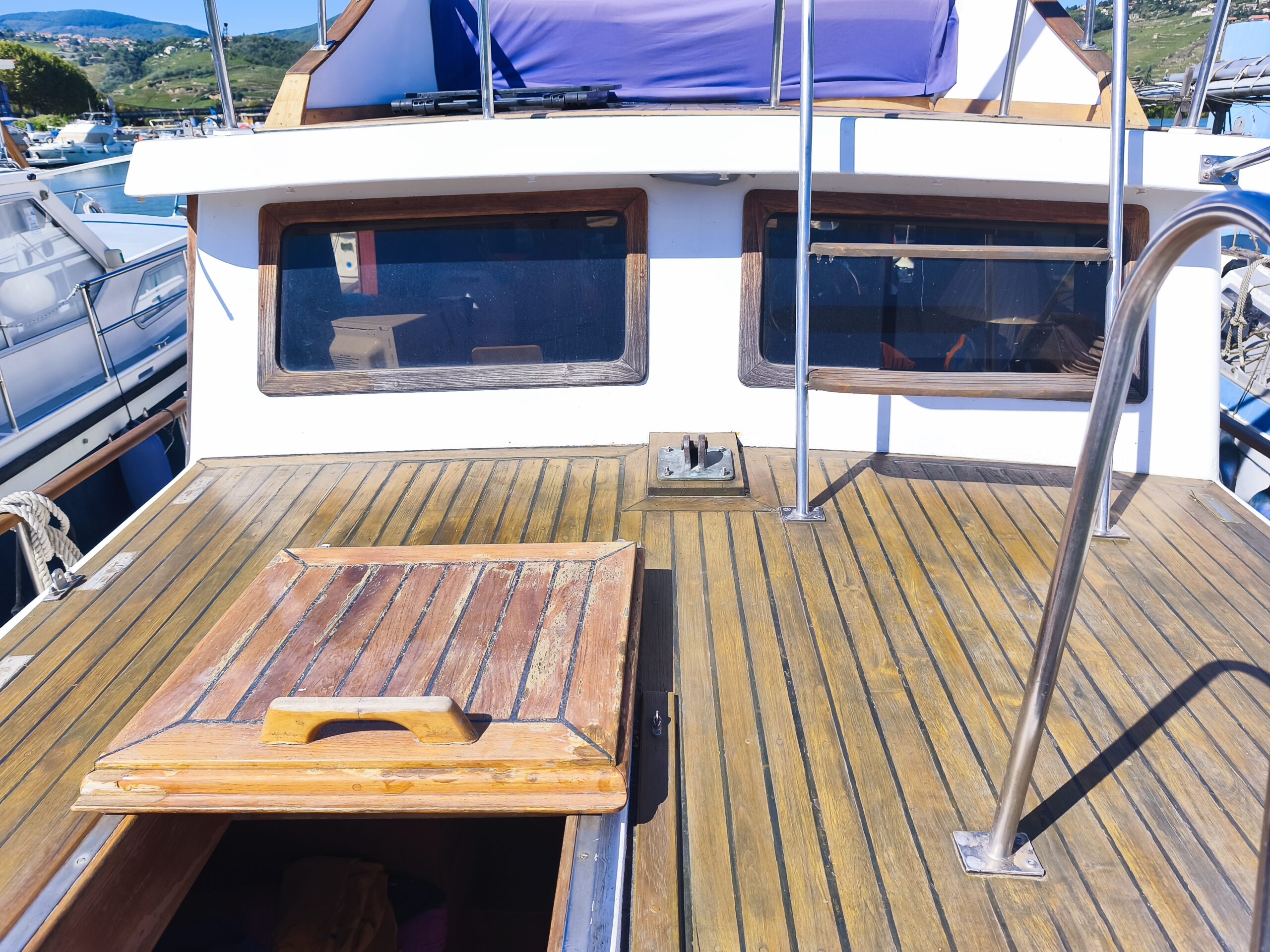 Les ponts en teck, entièrement refaits en 2023, témoignent du soin apporté à cette unité : dépose complète, stratification polyester assurant une parfaite étanchéité, puis repose du teck pour préserver l’esthétique traditionnelle du trawler.