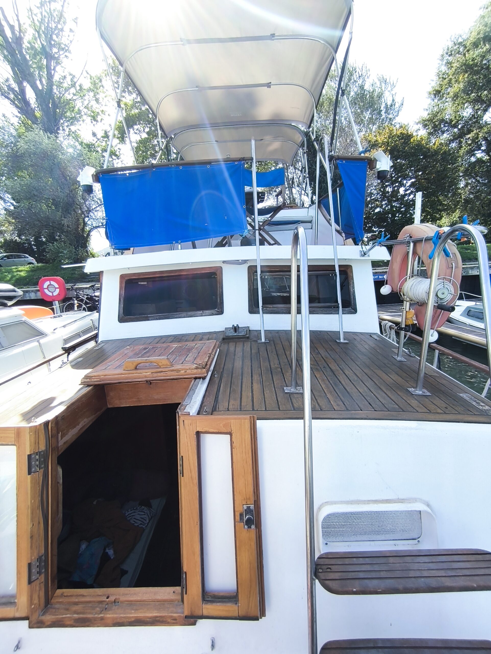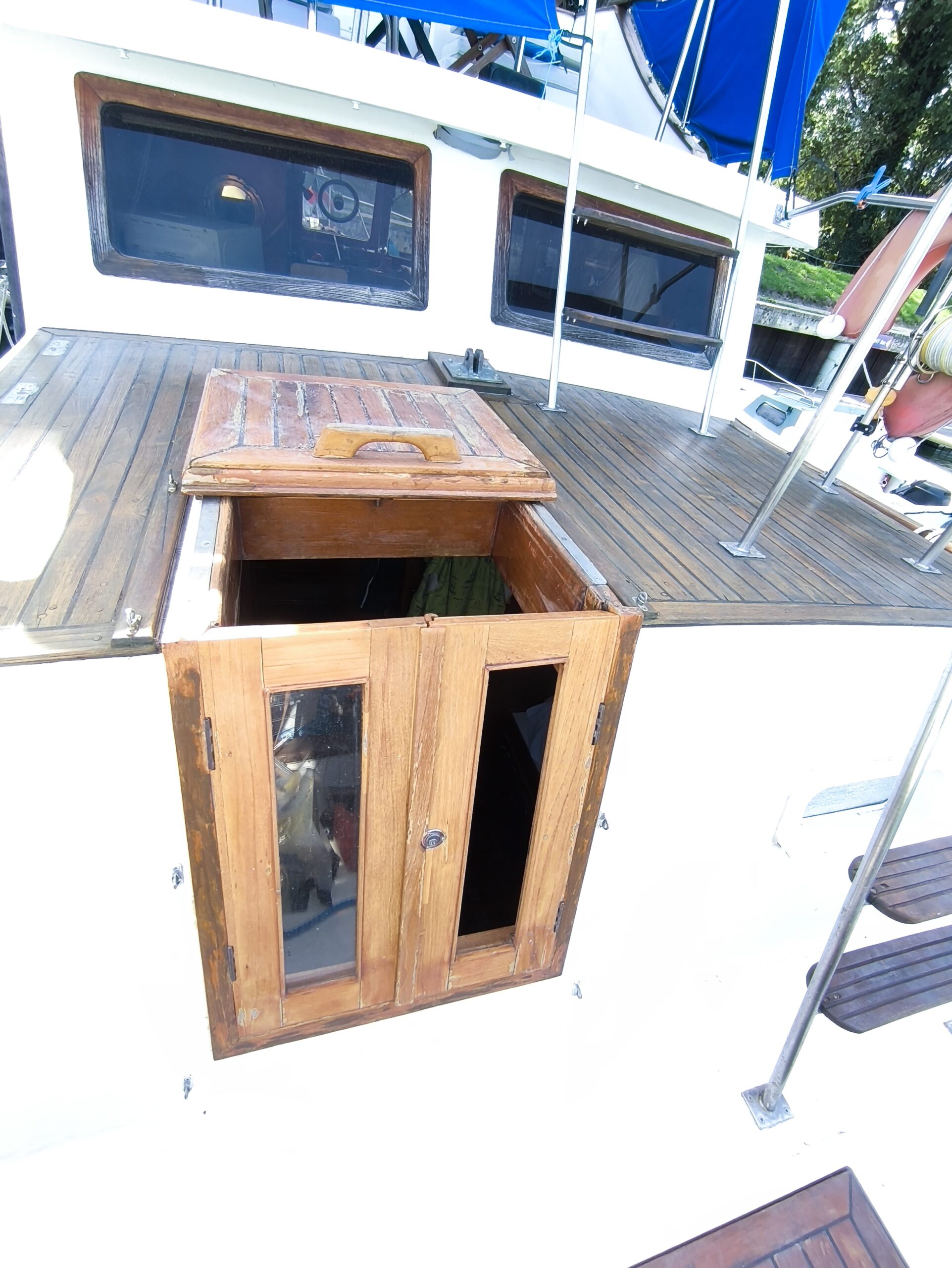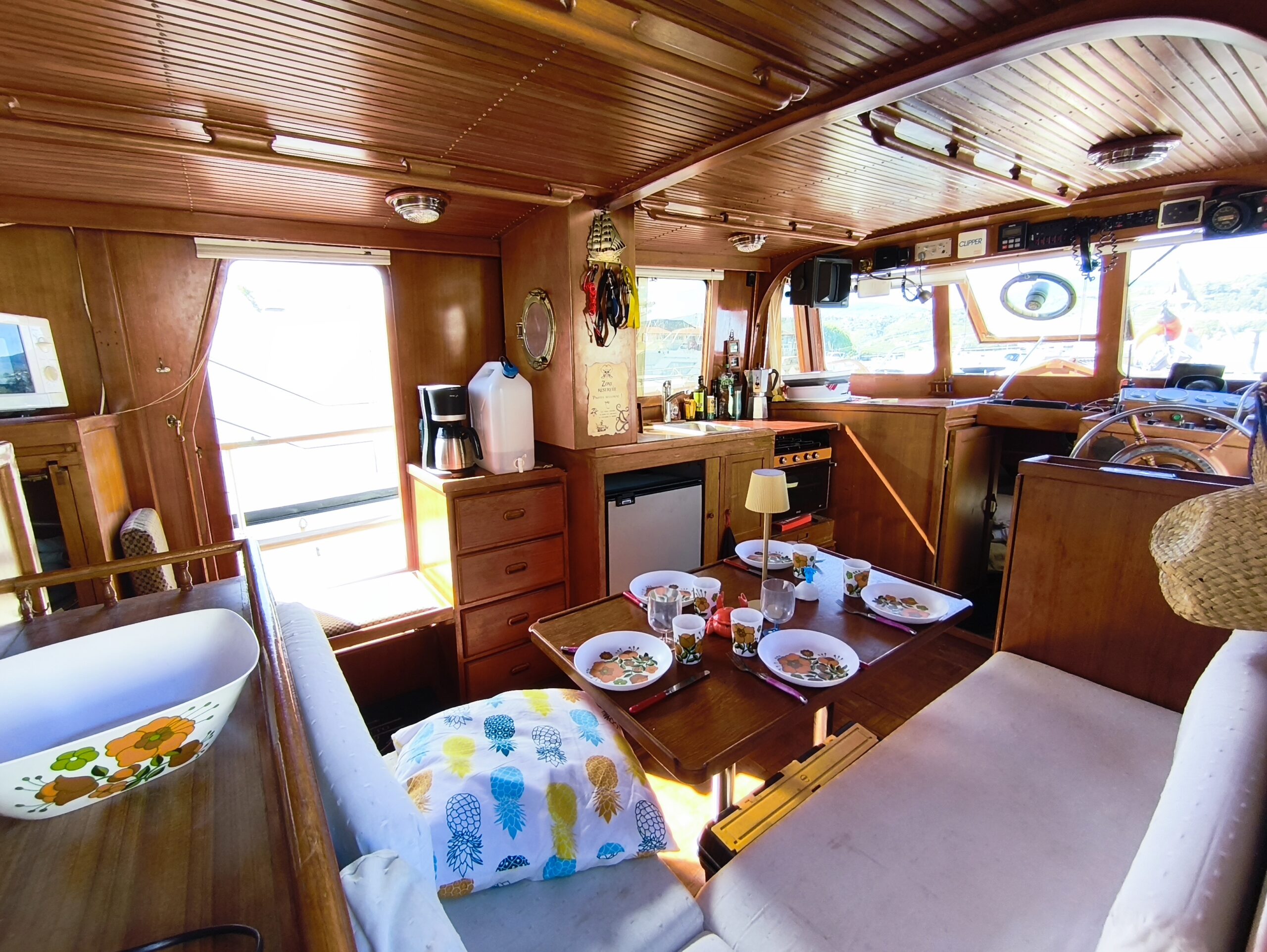 Les ponts en teck, entièrement refaits en 2023, témoignent du soin apporté à cette unité : dépose complète, stratification polyester assurant une parfaite étanchéité, puis repose du teck pour préserver l’esthétique traditionnelle du trawler.