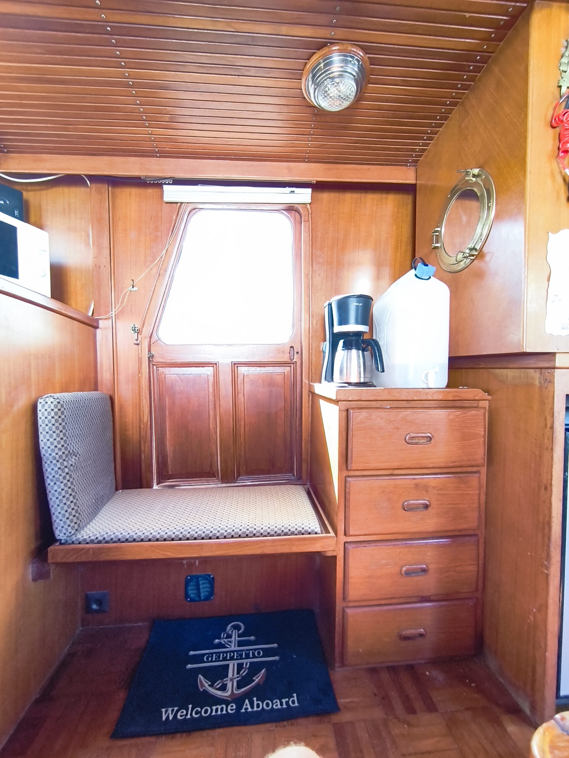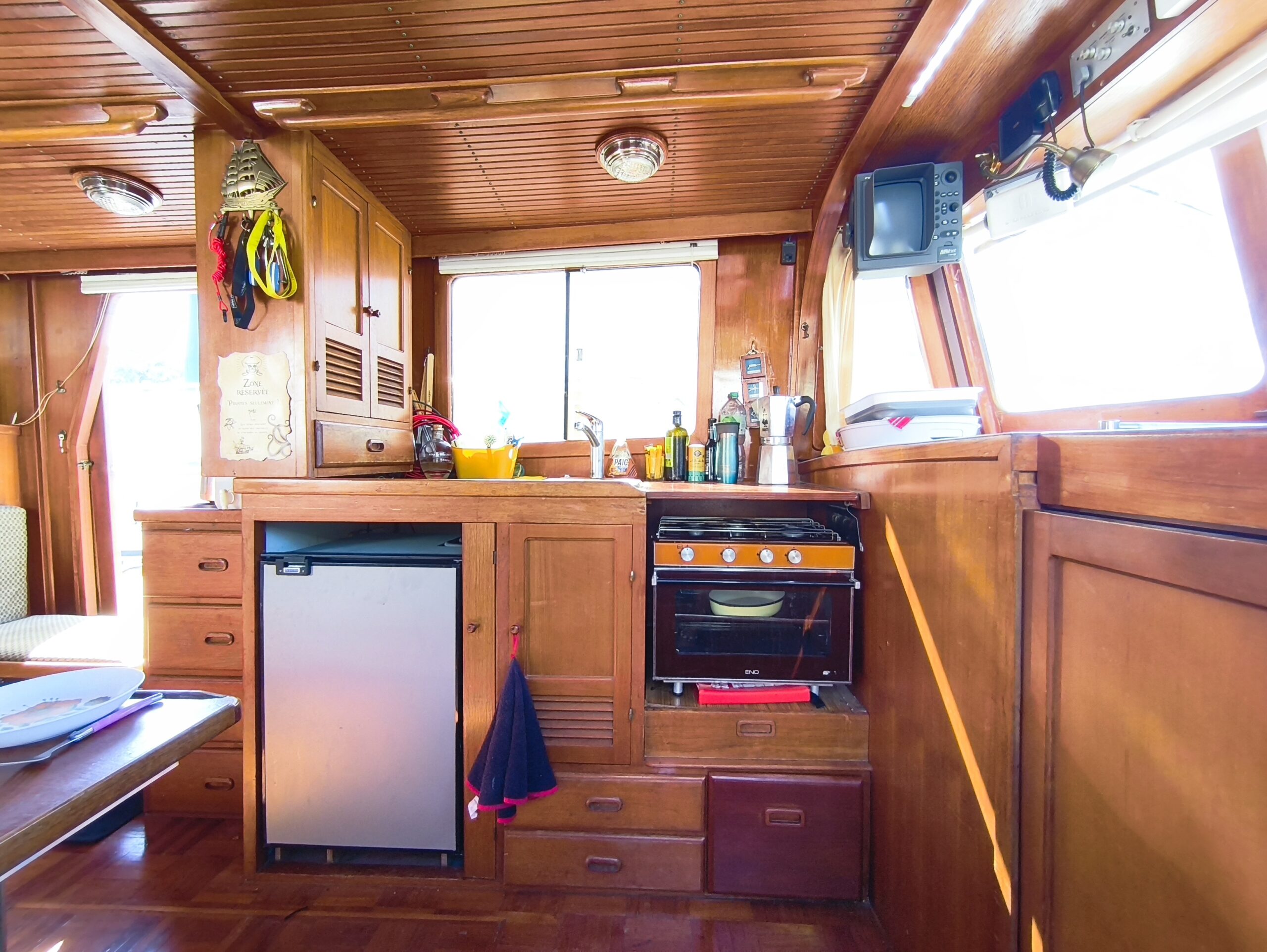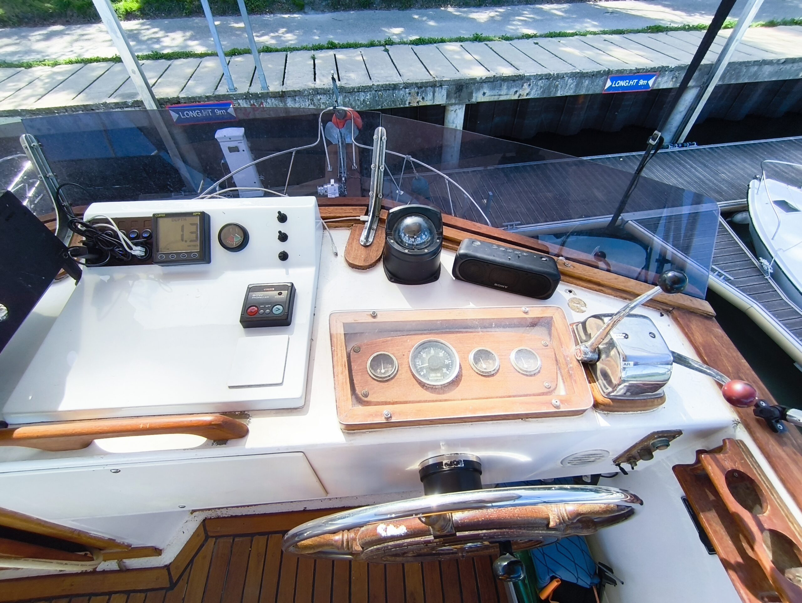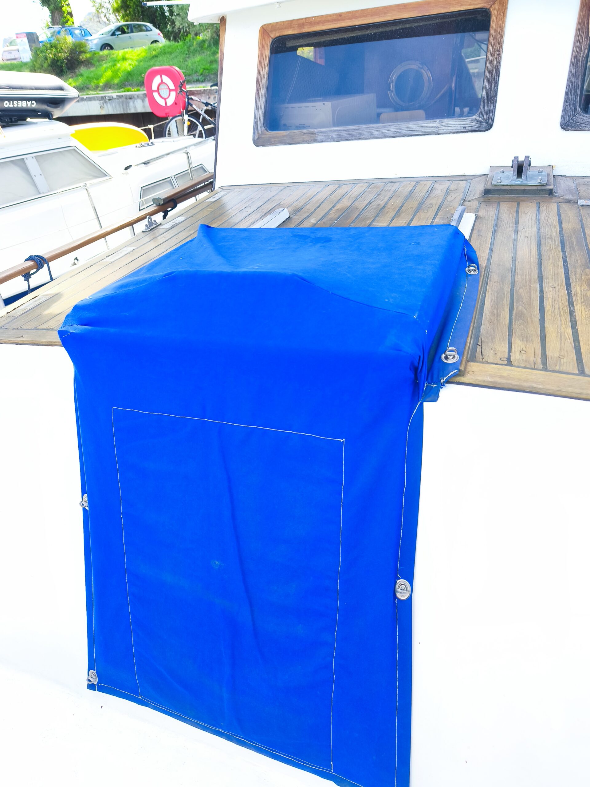 Les ponts en teck, entièrement refaits en 2023, témoignent du soin apporté à cette unité : dépose complète, stratification polyester assurant une parfaite étanchéité, puis repose du teck pour préserver l’esthétique traditionnelle du trawler.