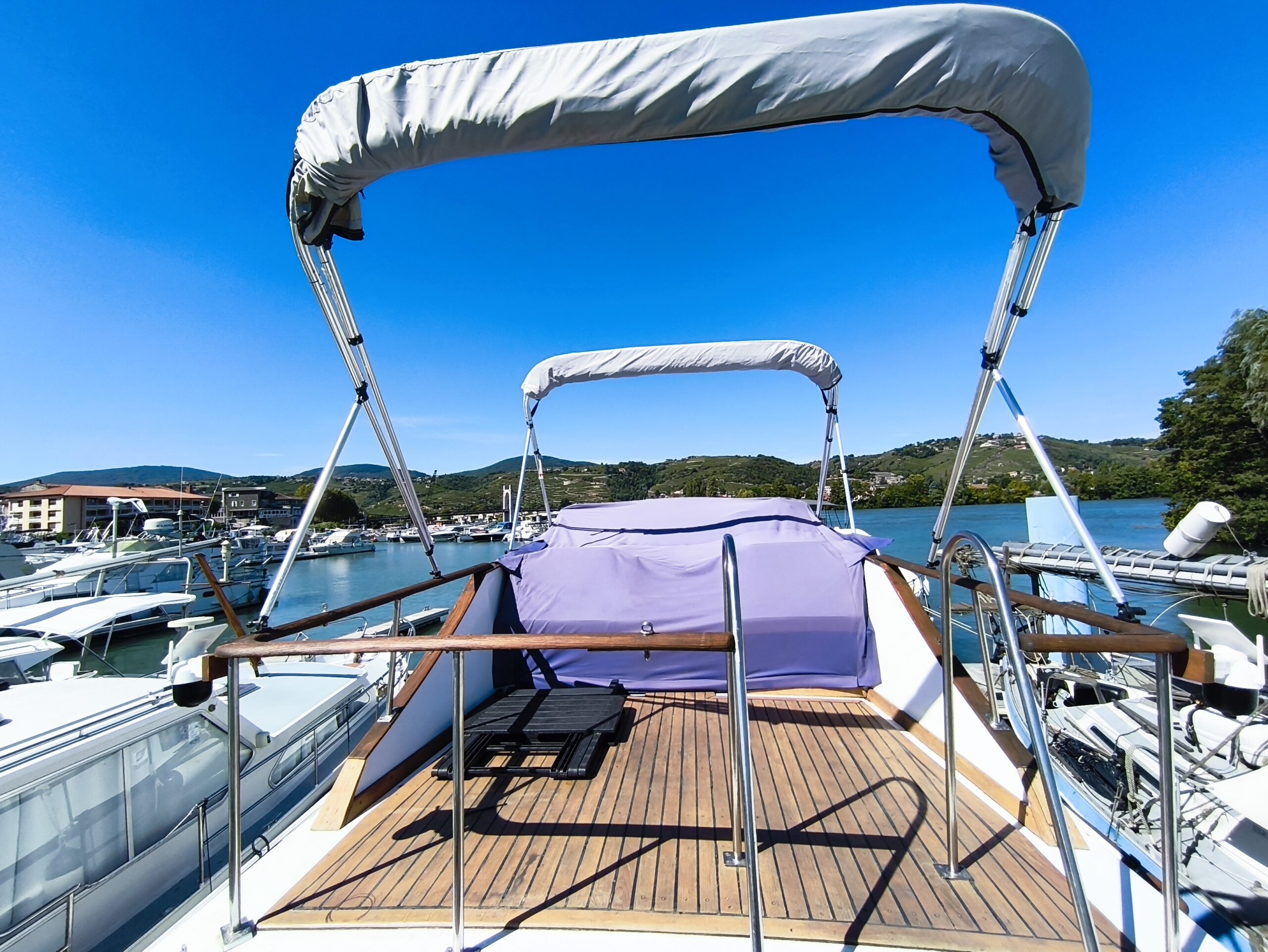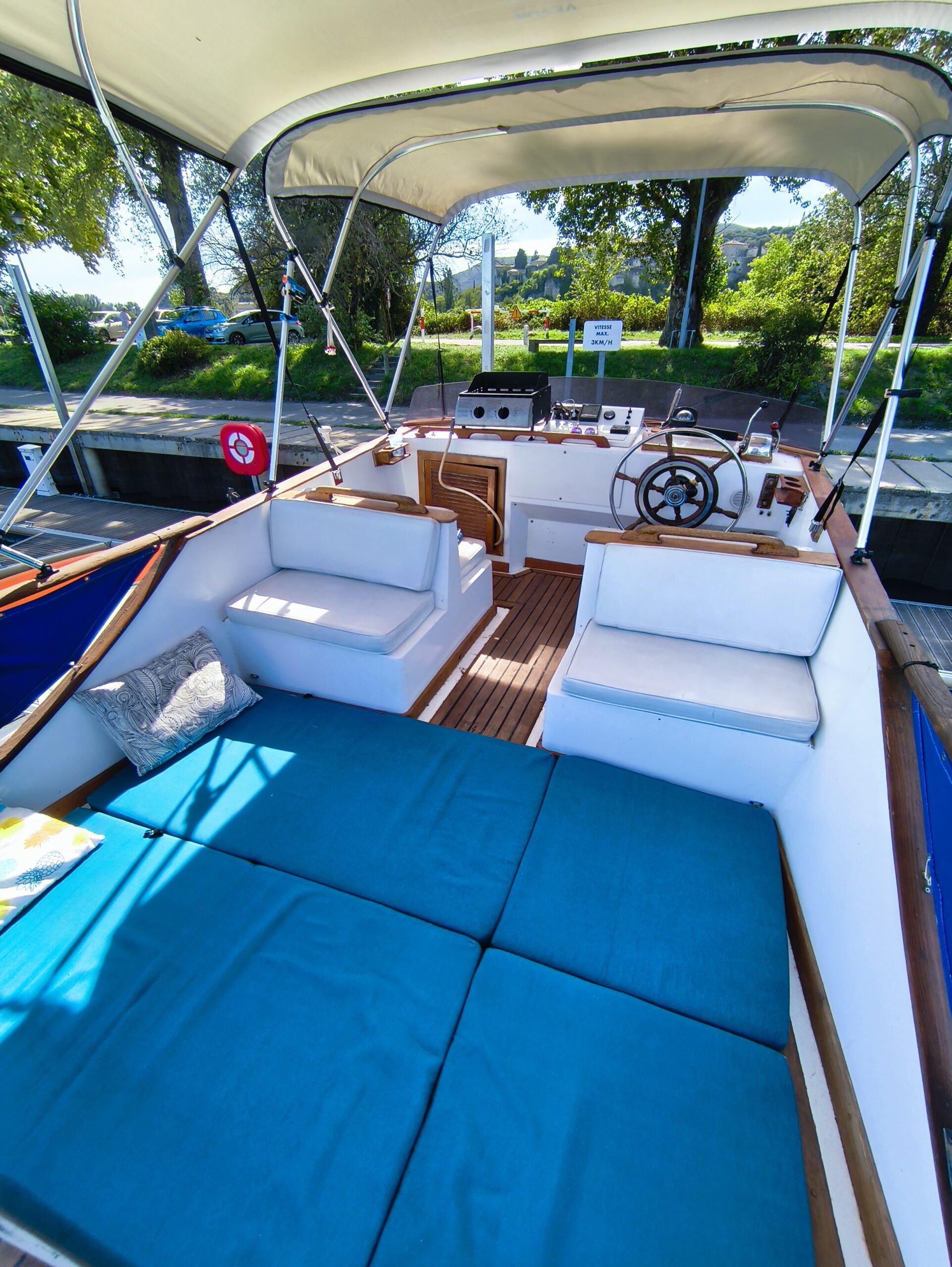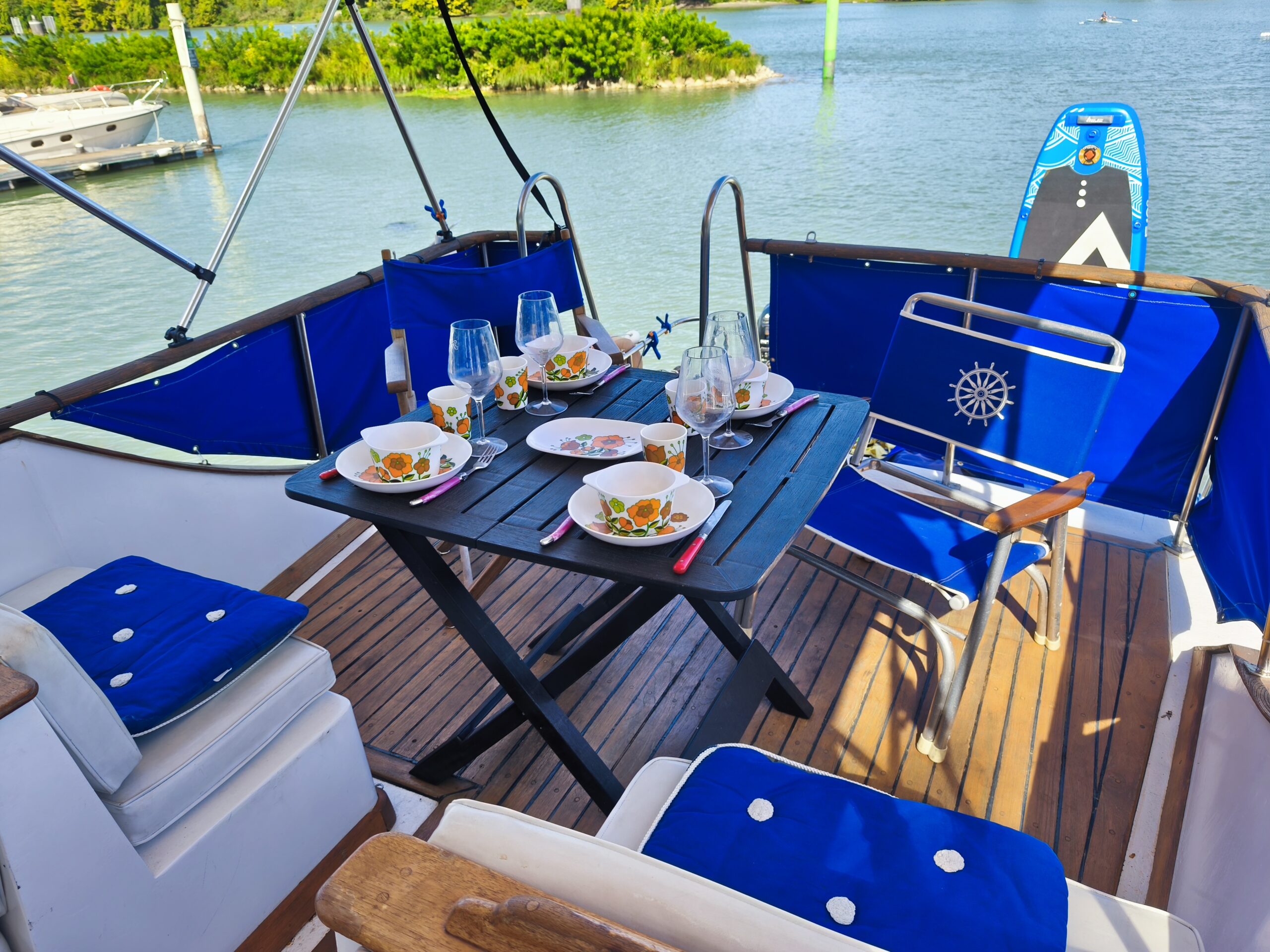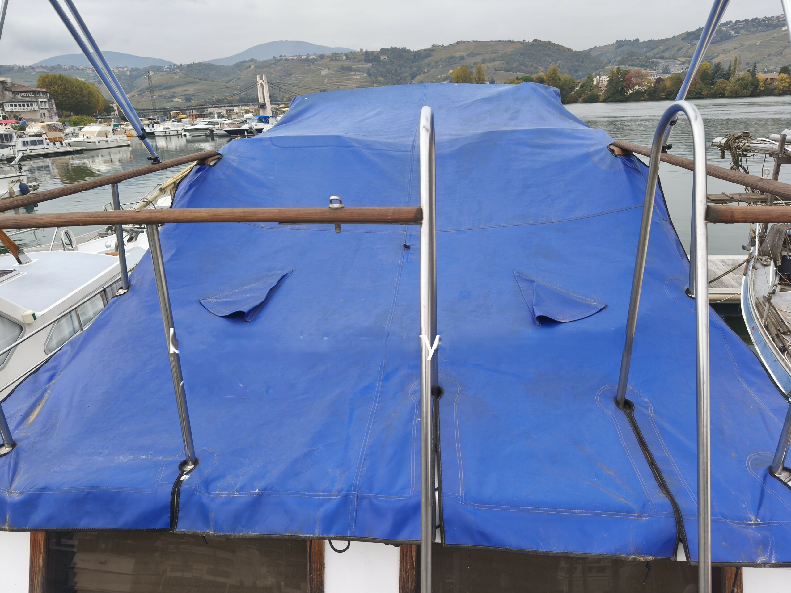 Côté équipements, le bateau est parfaitement autonome avec un panneau solaire de 260 W, un convertisseur et un chargeur Victron Bluetooth, ainsi que trois batteries neuves installées en 2024 (moteur, servitude et propulseur d’étrave). Le flybridge est protégé par un double bimini neuf, offrant un confort appréciable en navigation comme au mouillage.