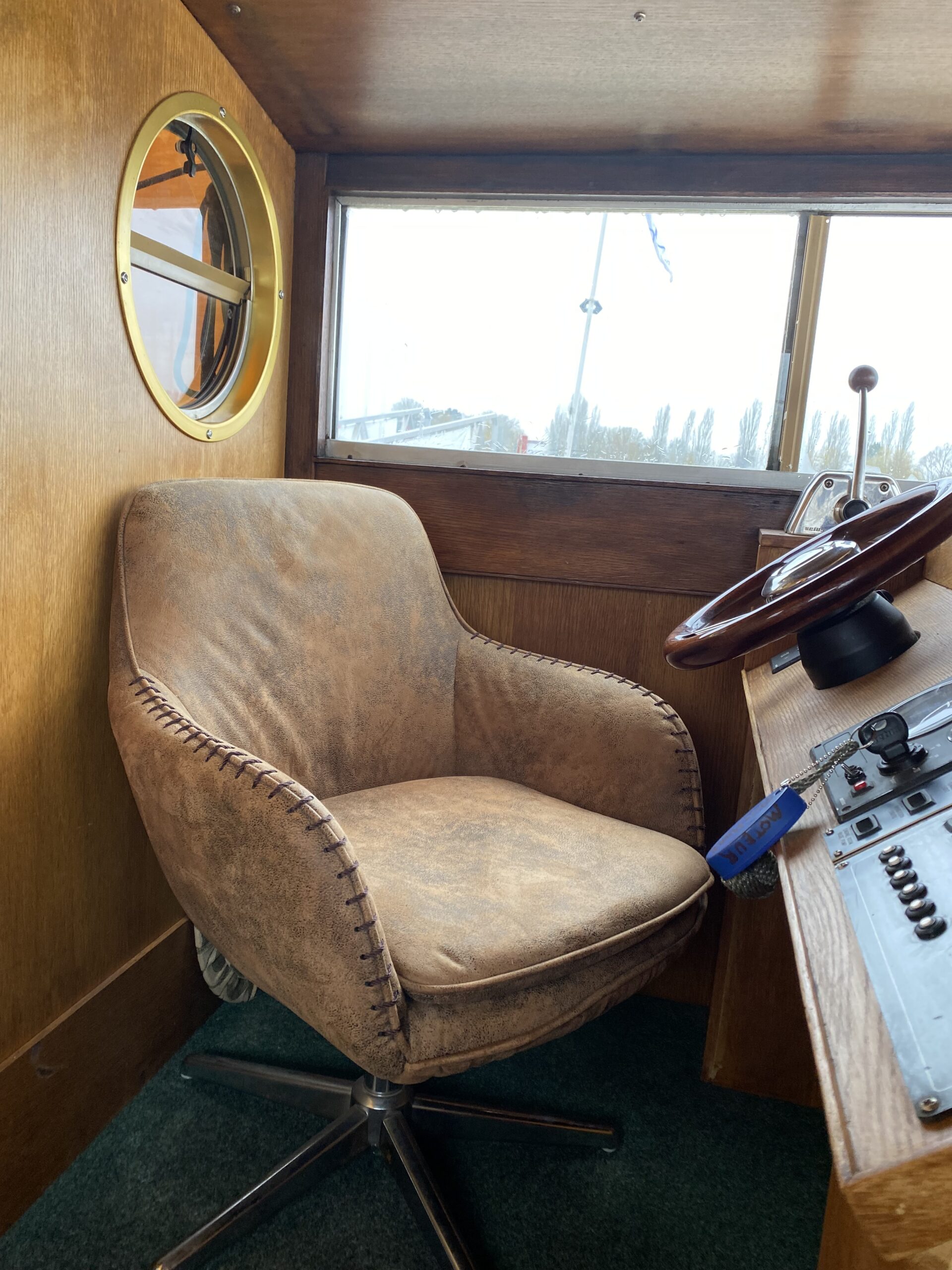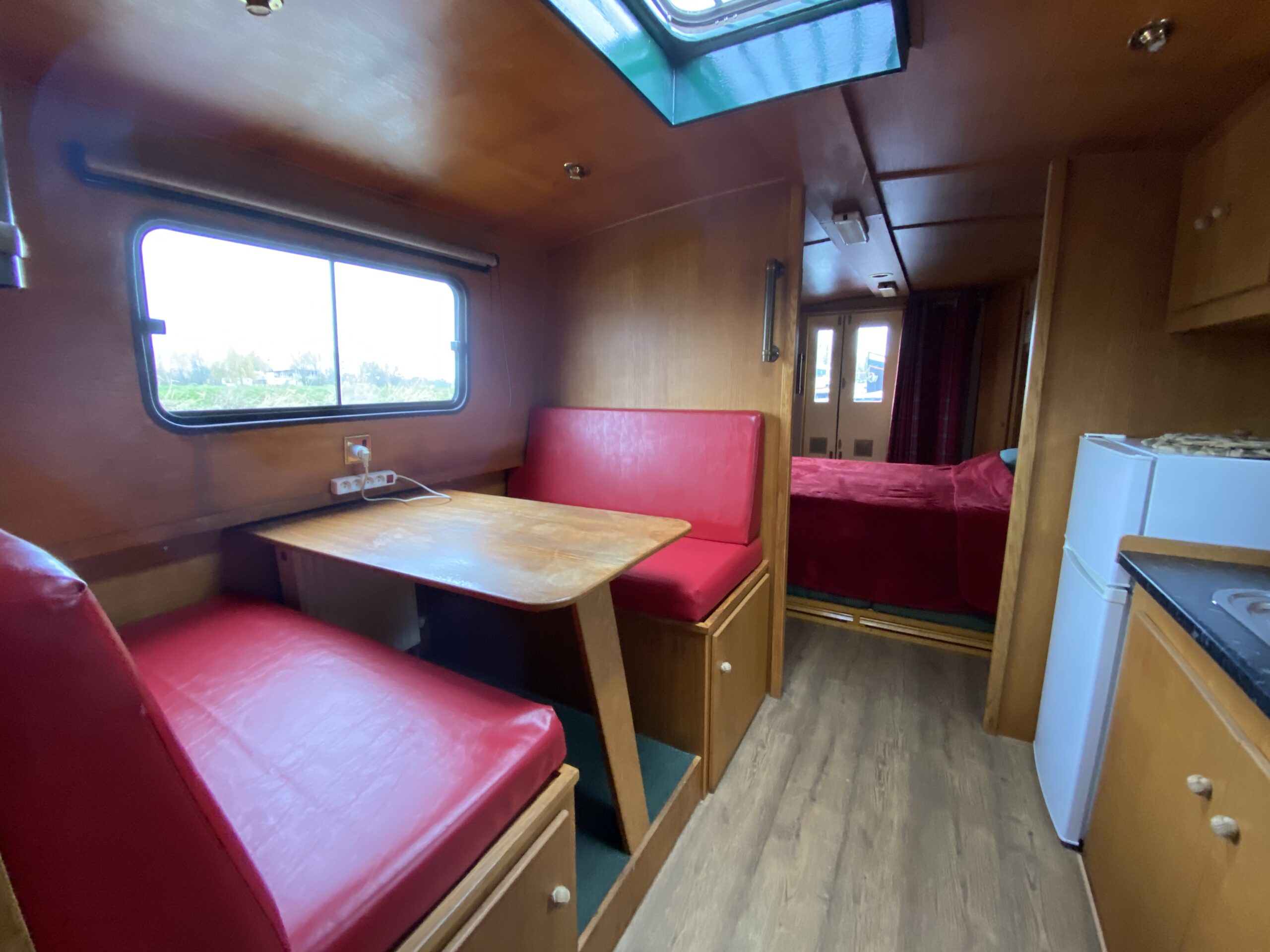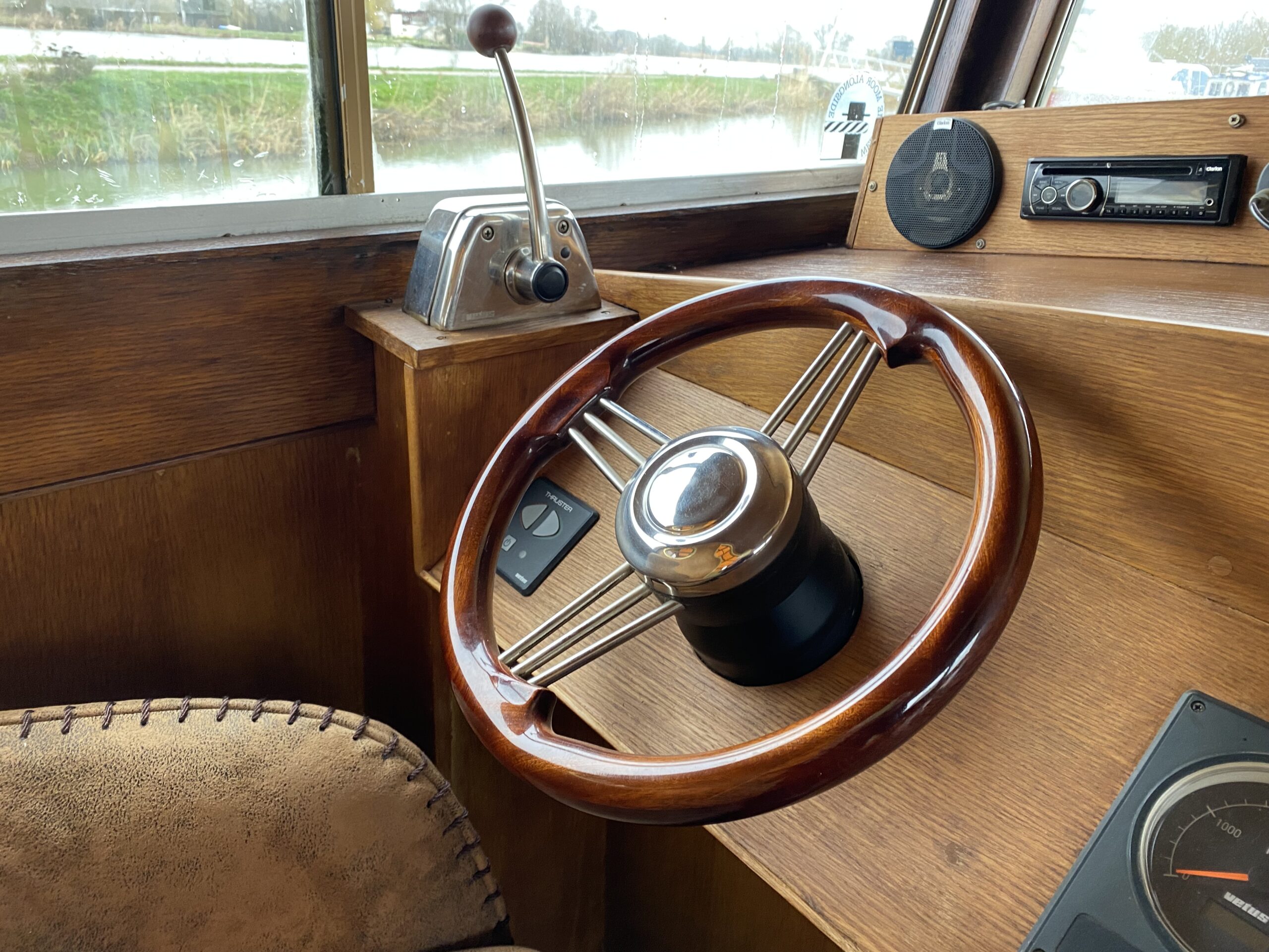Ce bateau offre de très beaux volumes et une conception bien pensée. À l’arrière, une terrasse équipée d’un taud complet fermé permet de créer une véritable pièce de vie supplémentaire, utilisable toute l’année. À l’avant, une seconde terrasse offre un espace agréable pour profiter de l’extérieur. La timonerie dispose d’un poste de pilotage avec banquette, tandis que l’intérieur comprend une cuisine fonctionnelle, une dinette conviviale, une salle de bain avec douche et WC, ainsi qu’une cabine avant avec lit double.