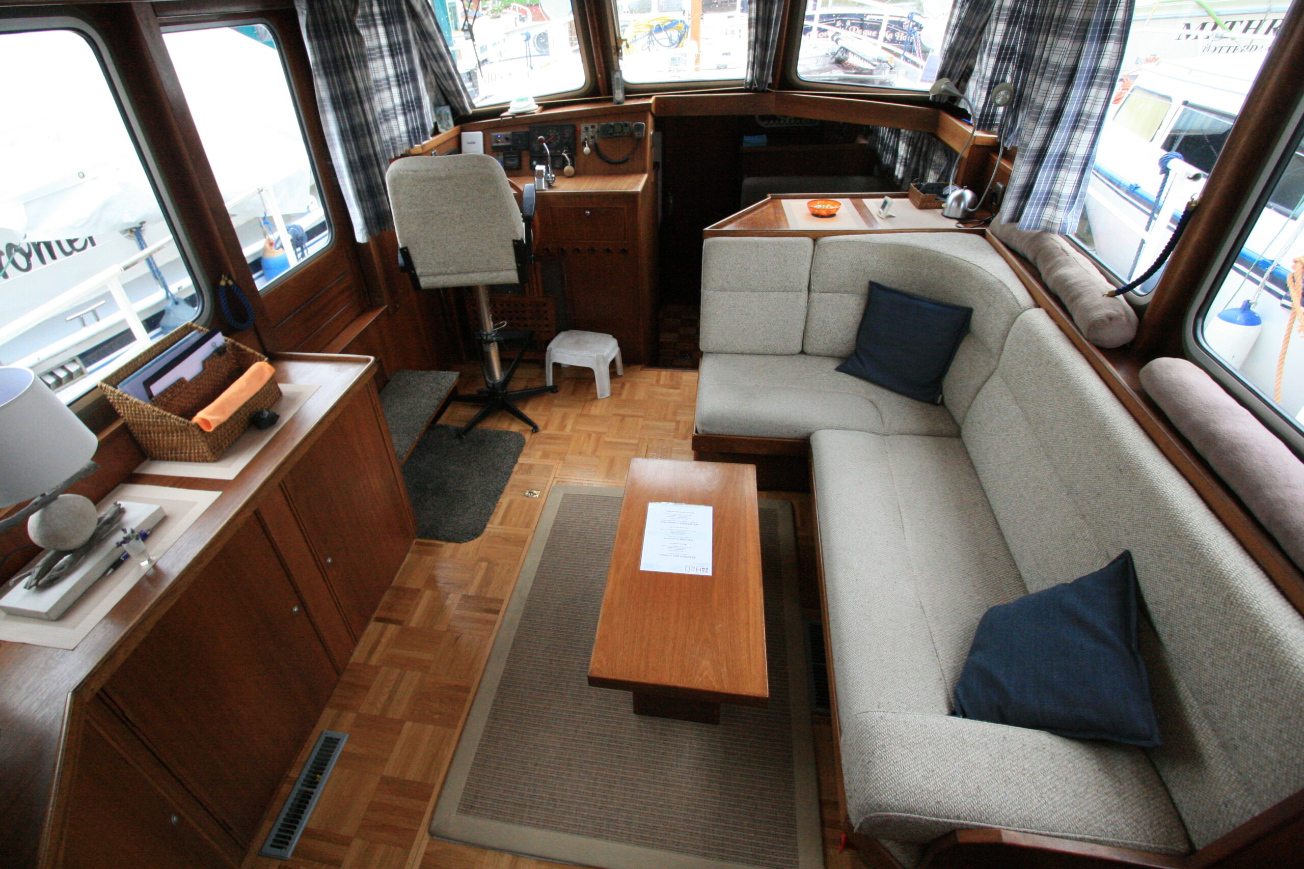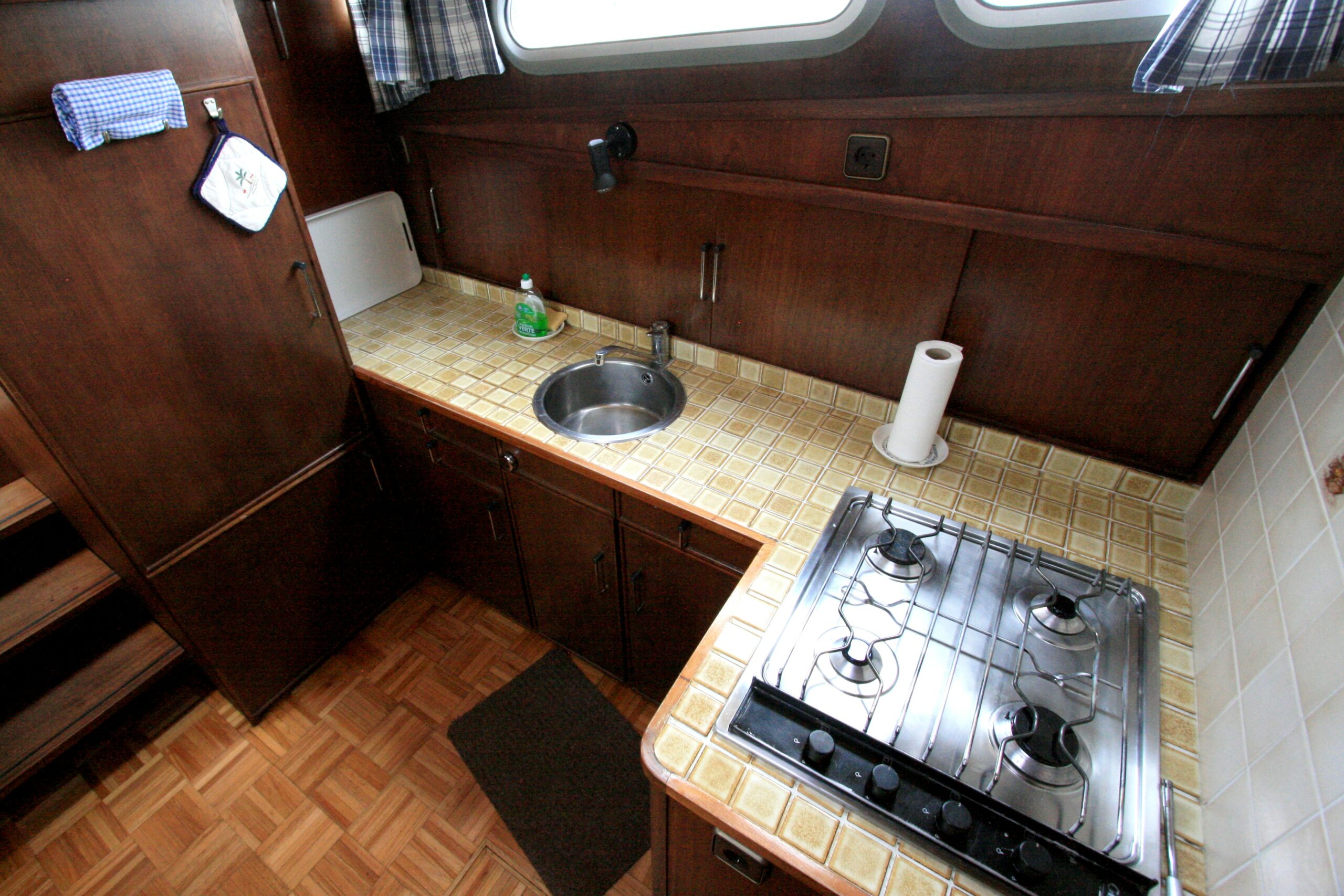 Le salon, lumineux grâce à son carré central, intègre le poste de pilotage intérieur ainsi que des banquettes avec coffres de rangement. La cuisine, entièrement équipée, fait face à une dinette qui se transforme facilement en couchage double. À l’avant, une cabine en V propose deux lits simples et bénéficie de la présence d’un lave-linge, un atout rare pour une vedette de cette taille.