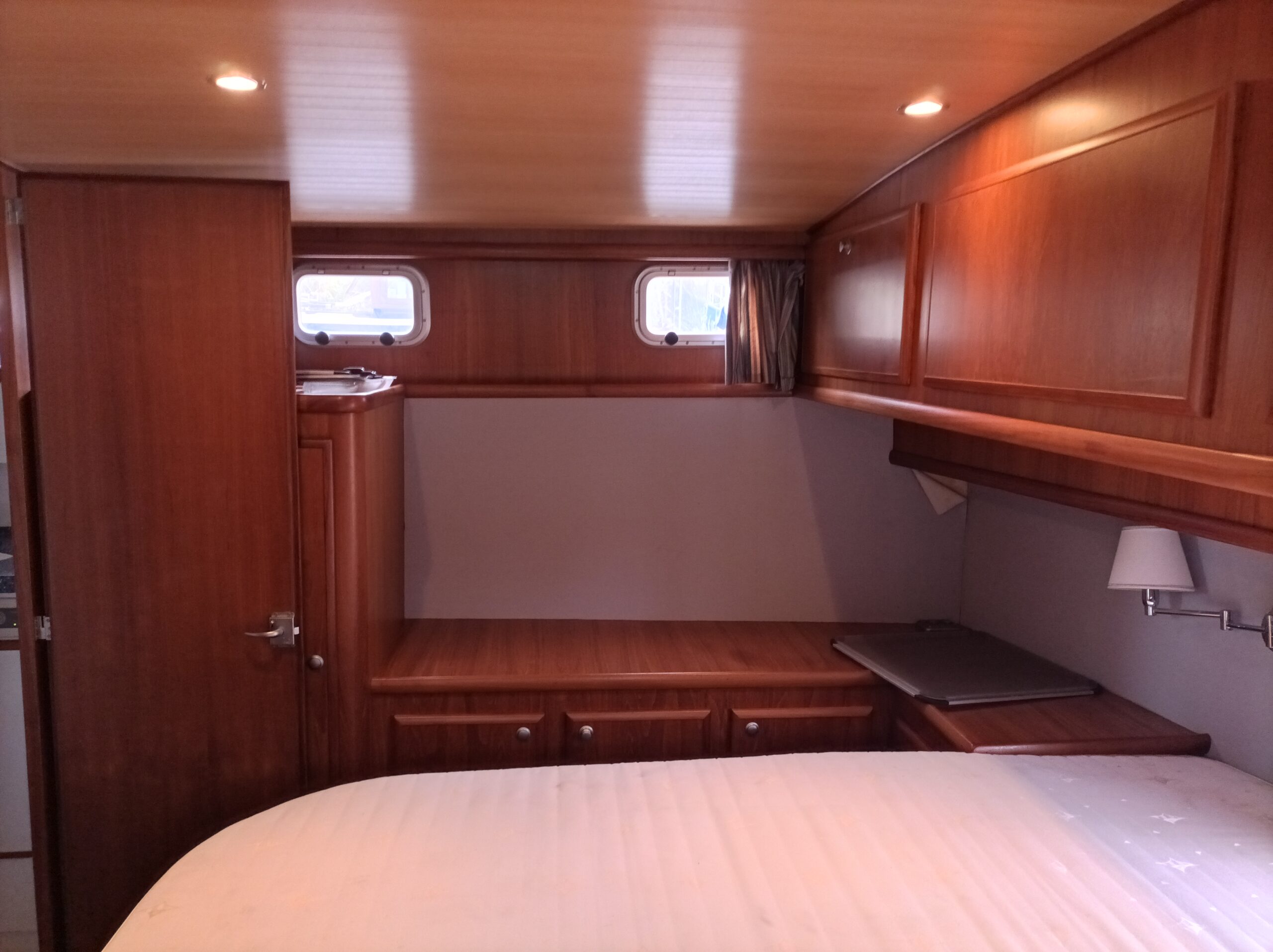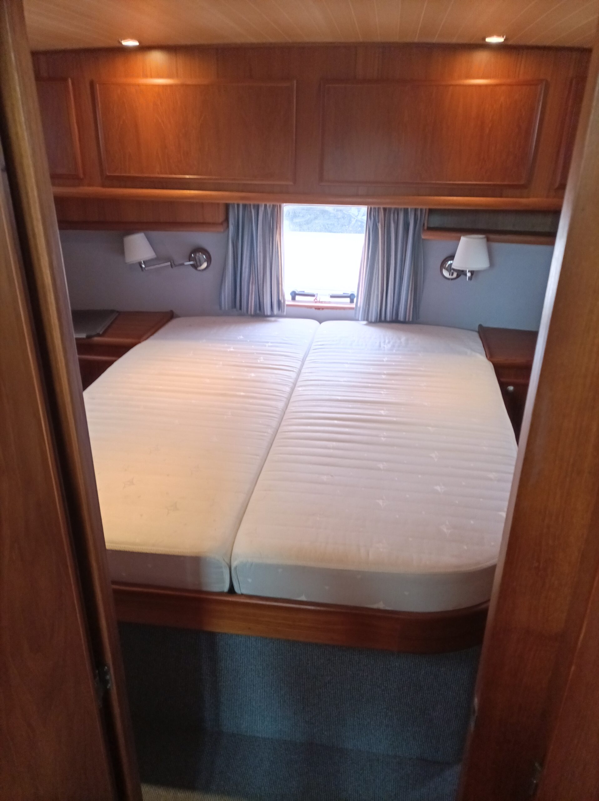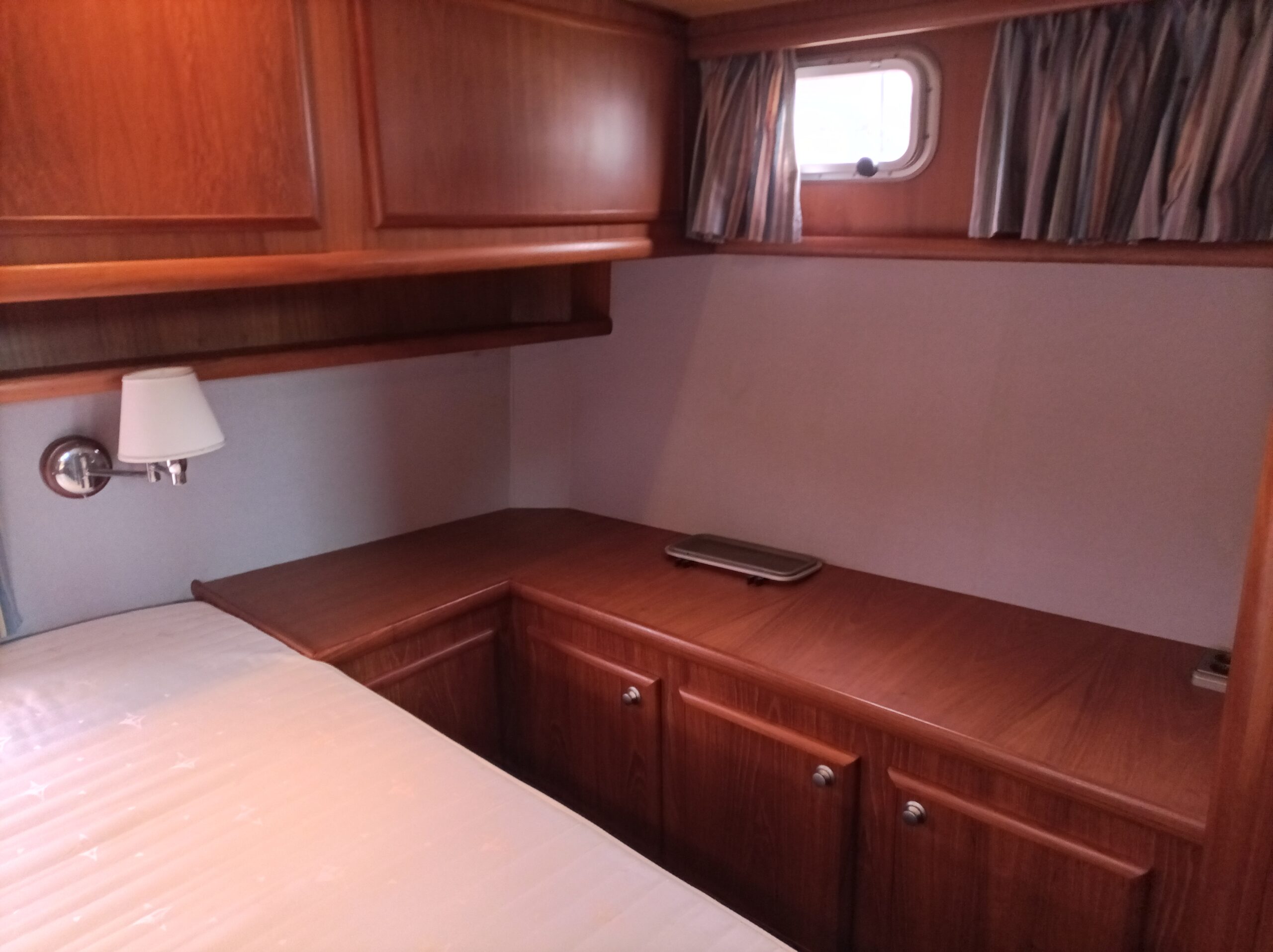 Construite par le chantier Aquanaut, reconnu pour ses yachts en acier, cette vedette habitable de 12.65 mètres allie à merveille robustesse et confort. De larges fenêtres à double vitrage subliment son intérieur chaleureux et raffiné et inondent le salon de lumière naturelle. Par ailleurs, la cuisine, entièrement équipée avec réfrigérateur 12V, congélateur, four 220V et micro-ondes, permet de profiter de longues croisières en toute autonomie. De plus, l’agencement intelligent des espaces comprend une cabine arrière spacieuse et cosy avec lit double central, ainsi qu’une cabine avant confortable. Pour couronner le tout, le bateau dispose également d’un lave-linge/sèche-linge et d’une climatisation réversible, garantissant bien-être et praticité en toutes saisons.