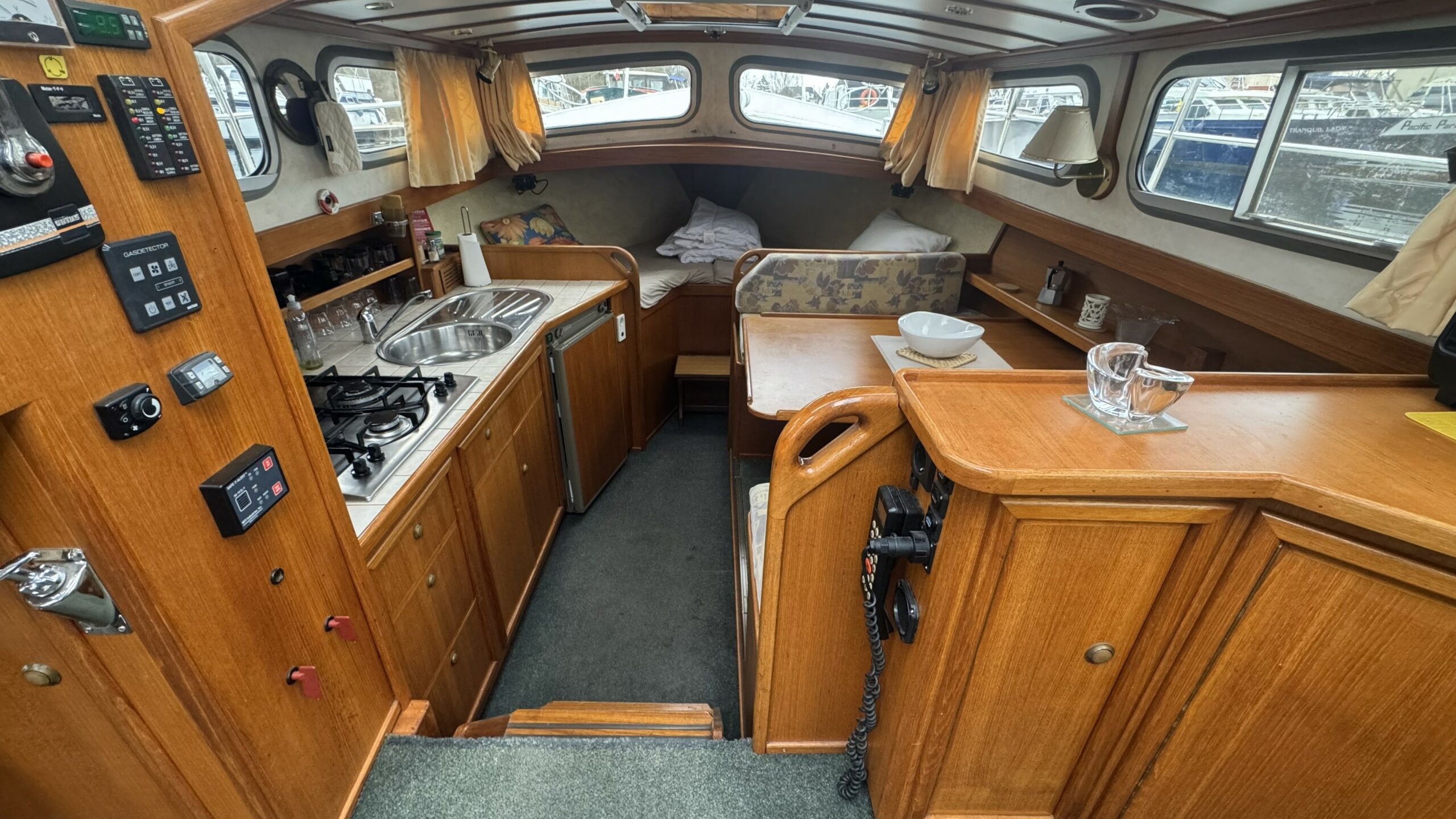 Ensuite, l’accès latéral mène à un intérieur confortable et lumineux, composé d’un salon accueillant, d’une cabine avec lit double et salle de bain avec douche et WC. La cuisine est fonctionnelle et équipée (plaque de cuisson au gaz, four 220V, hotte aspirante, réfrigérateur 12V et 220V), et la dinette est conviviale. Deux couchettes confortables se trouvent dans le pic avant du bateau.