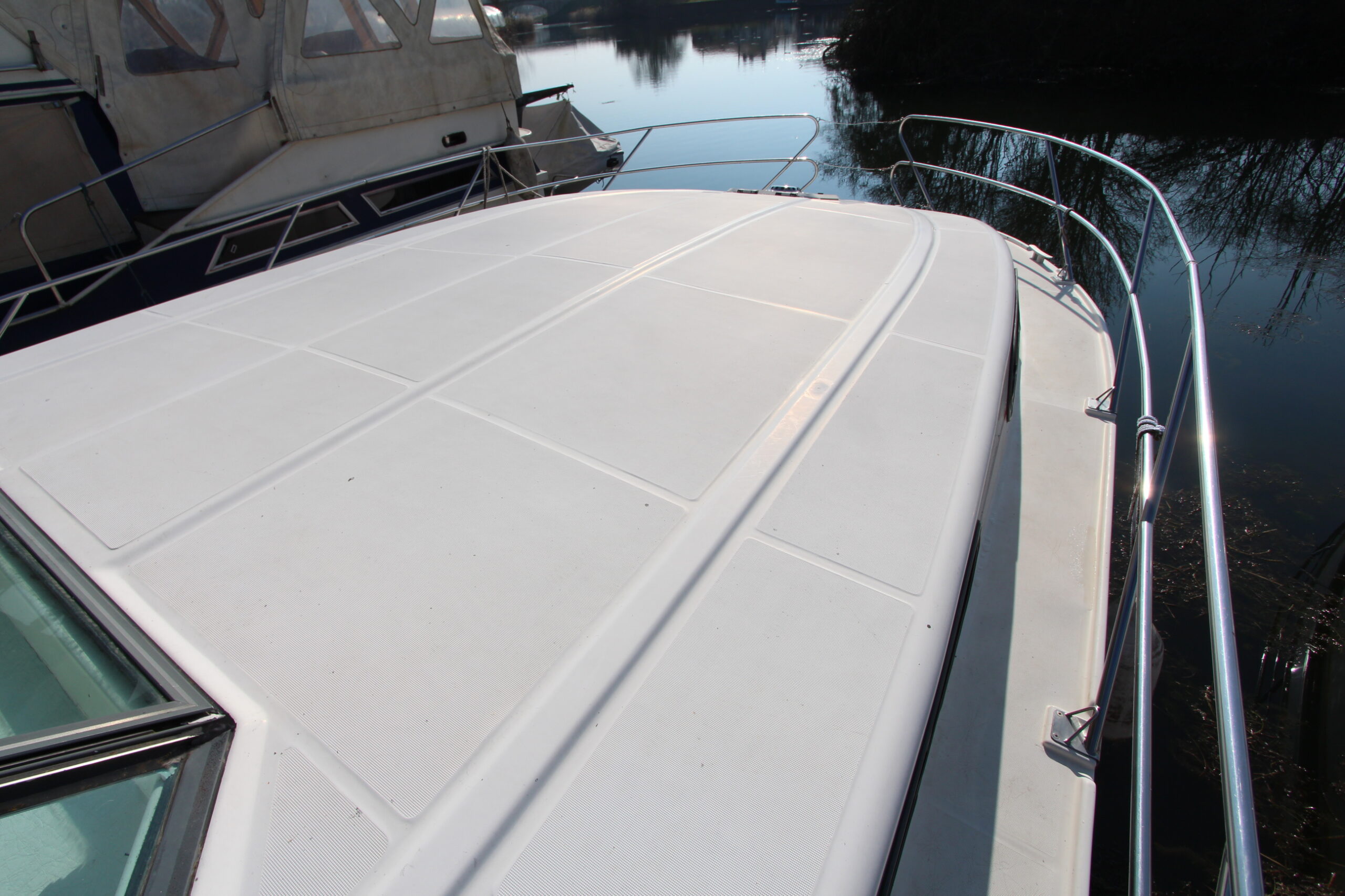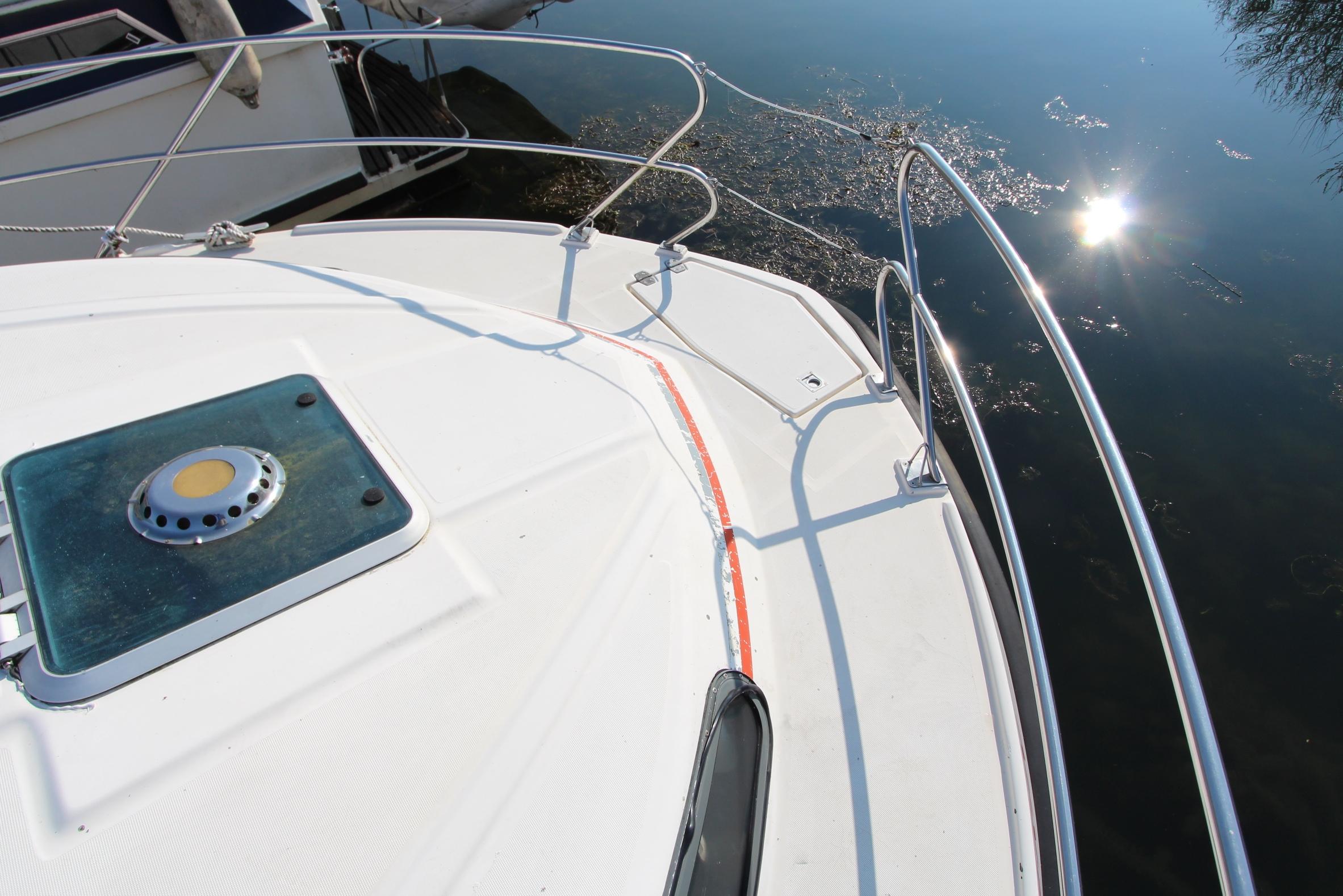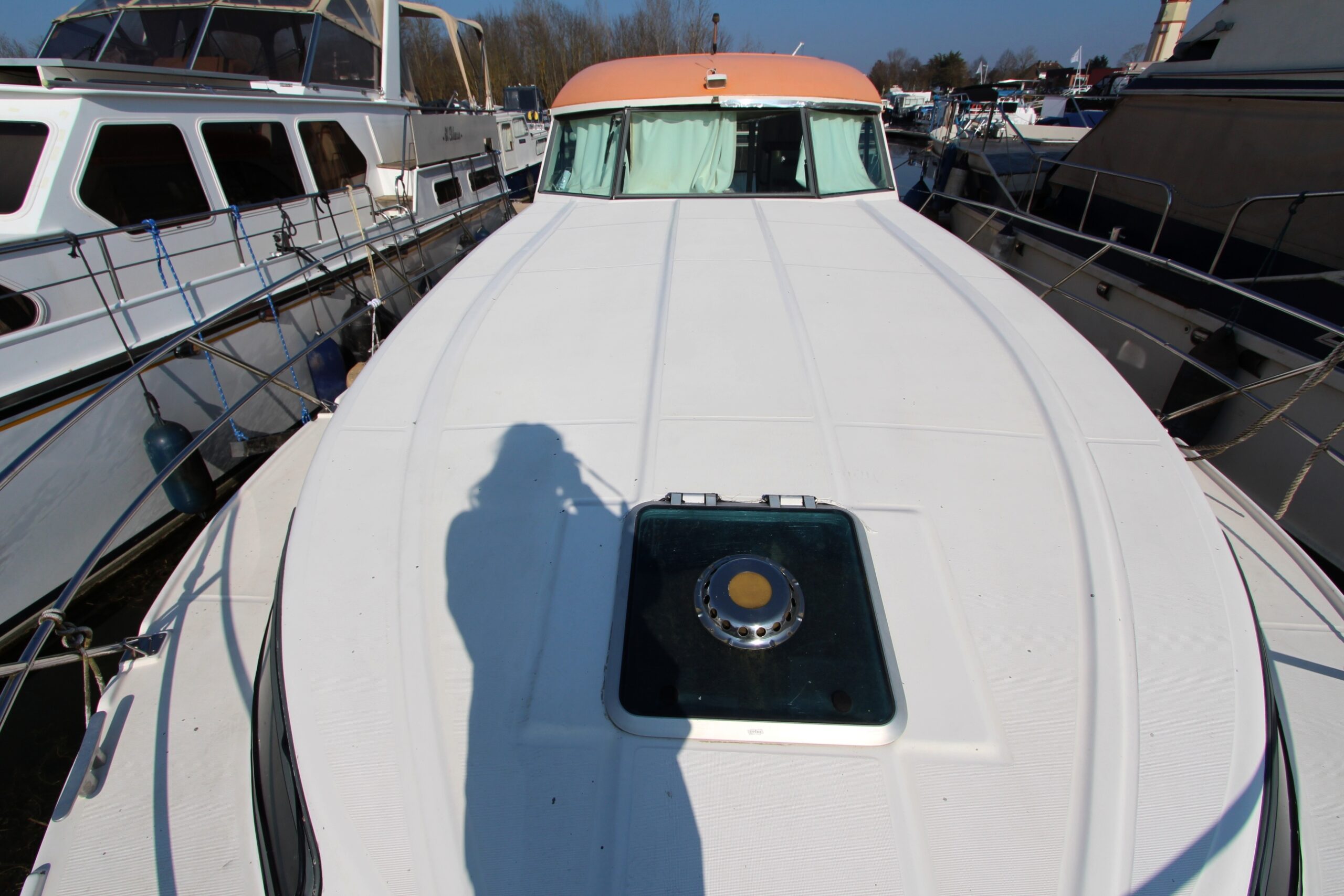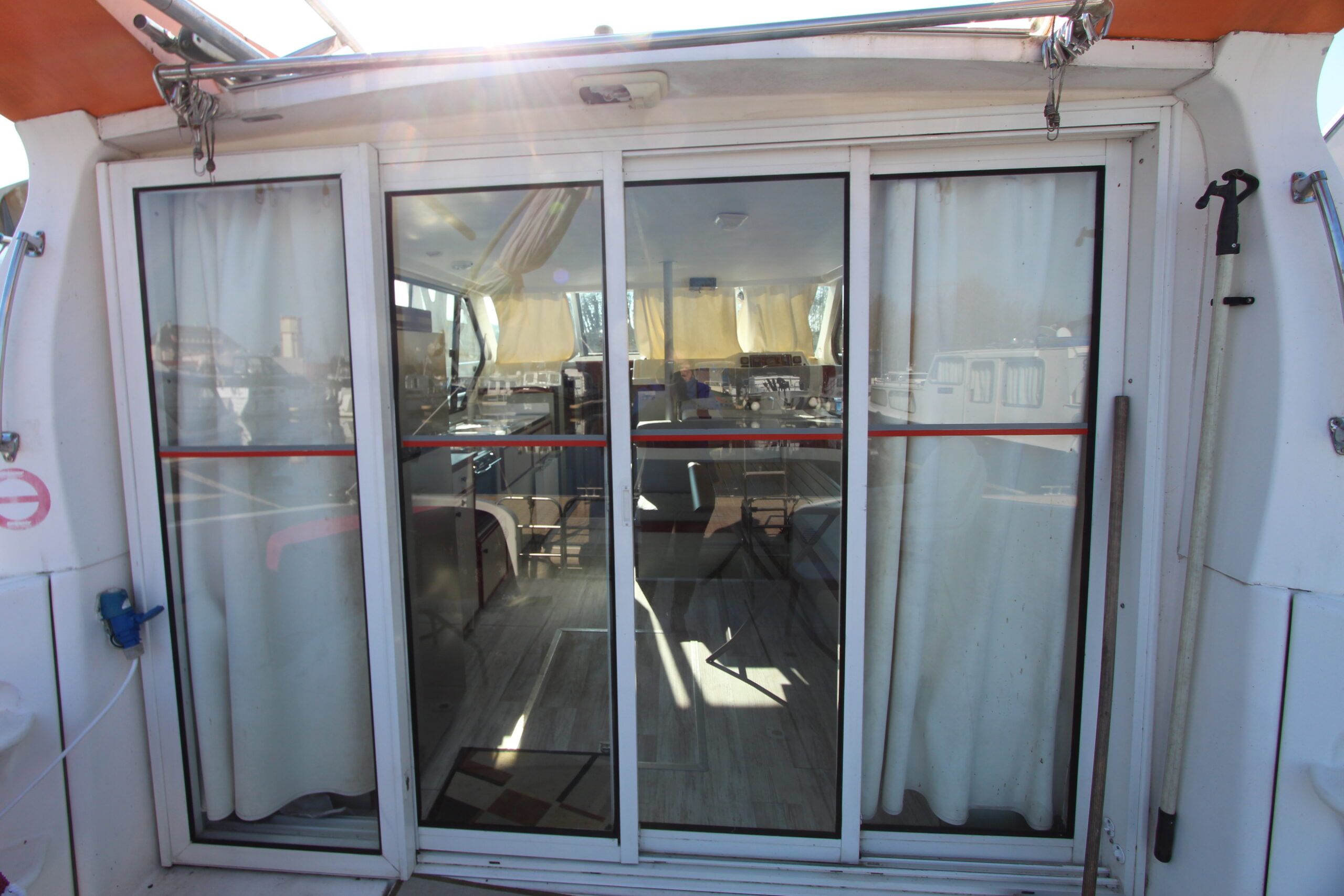 De plus, le poste de pilotage sur flybridge permet de profiter du beau temps tout en manœuvrant facilement. À l’intérieur, une grande baie vitrée illumine un agréable espace de vie comprenant une dinette, une cuisine équipée (plaque de cuisson au gaz, four au gaz, réfrigérateur 220V, congélateur) et un second poste de pilotage.
