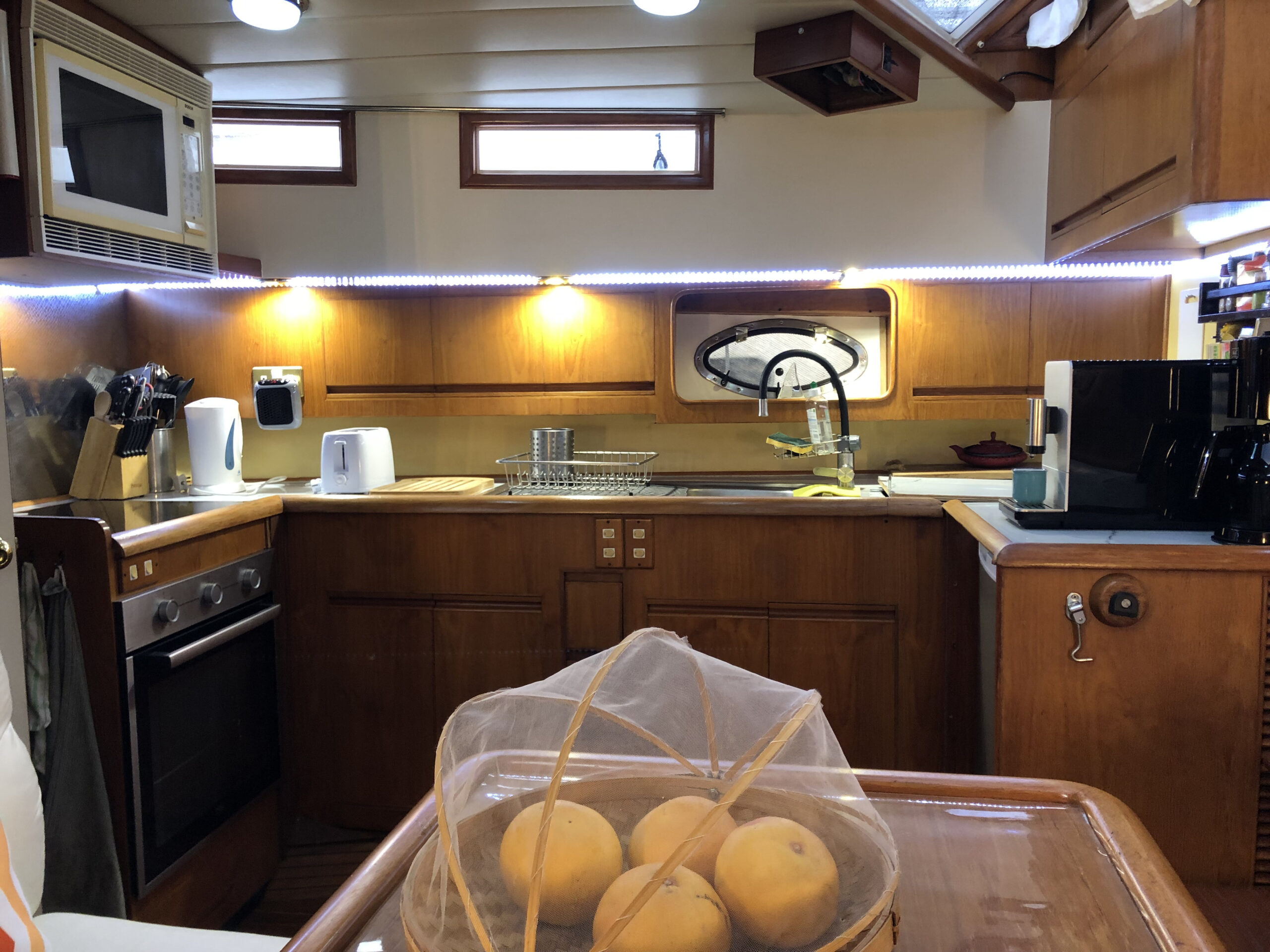 Le bateau comprend deux salles de bain, chacune équipée d’une douche et de toilettes électriques. La cuisine entièrement équipée permet de vivre à bord comme à la maison : plaque de cuisson à induction, four 220V, réfrigérateurs, congélateur et micro-ondes offrent un équipement complet et fonctionnel.