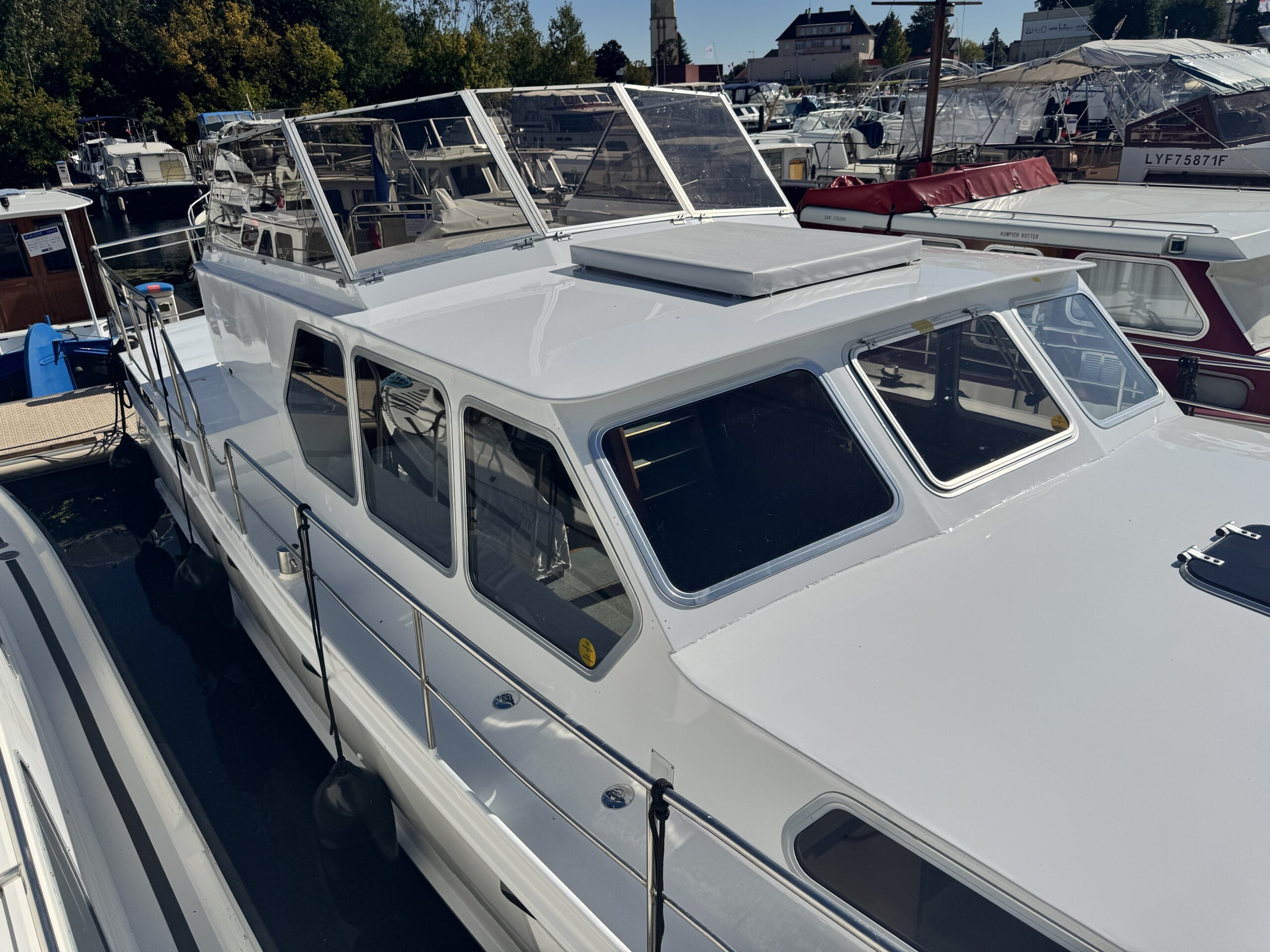 Récemment, le chantier H2O a réalisé une peinture complète neuve, incluant le démontage de toutes les fenêtres et accessoires extérieurs, ainsi que le remplacement de l’ensemble des joints d’étanchéité. La vedette bénéficie ainsi d’une protection optimale et d’une présentation soignée.