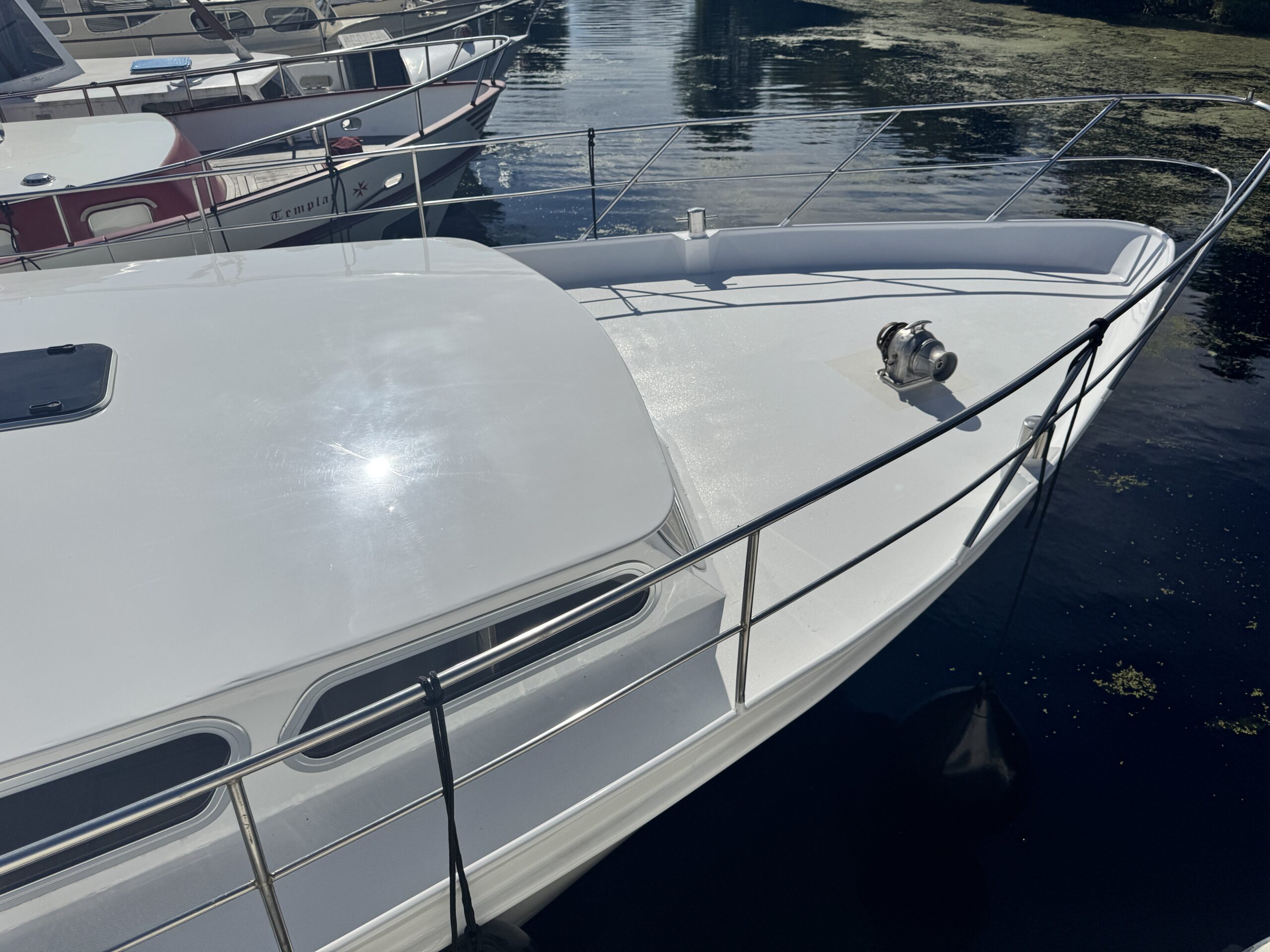 À l’intérieur, le bateau offre un espace totalement vide, prêt à être aménagé selon vos envies. Vous pourrez aisément y créer deux cabines ainsi qu’un espace de vie à votre image. Côté navigation, la vedette dispose de deux postes de pilotage – un à l’intérieur et un à l’extérieur – permettant de naviguer confortablement en toutes saisons et de profiter pleinement des beaux jours.