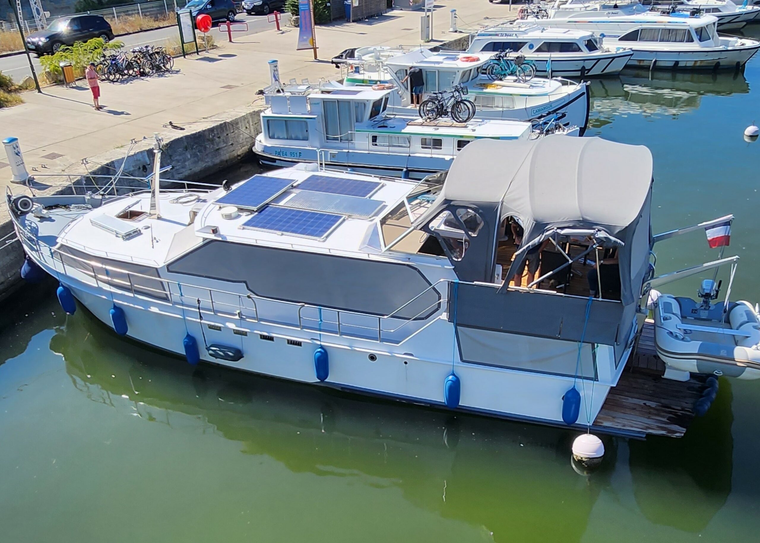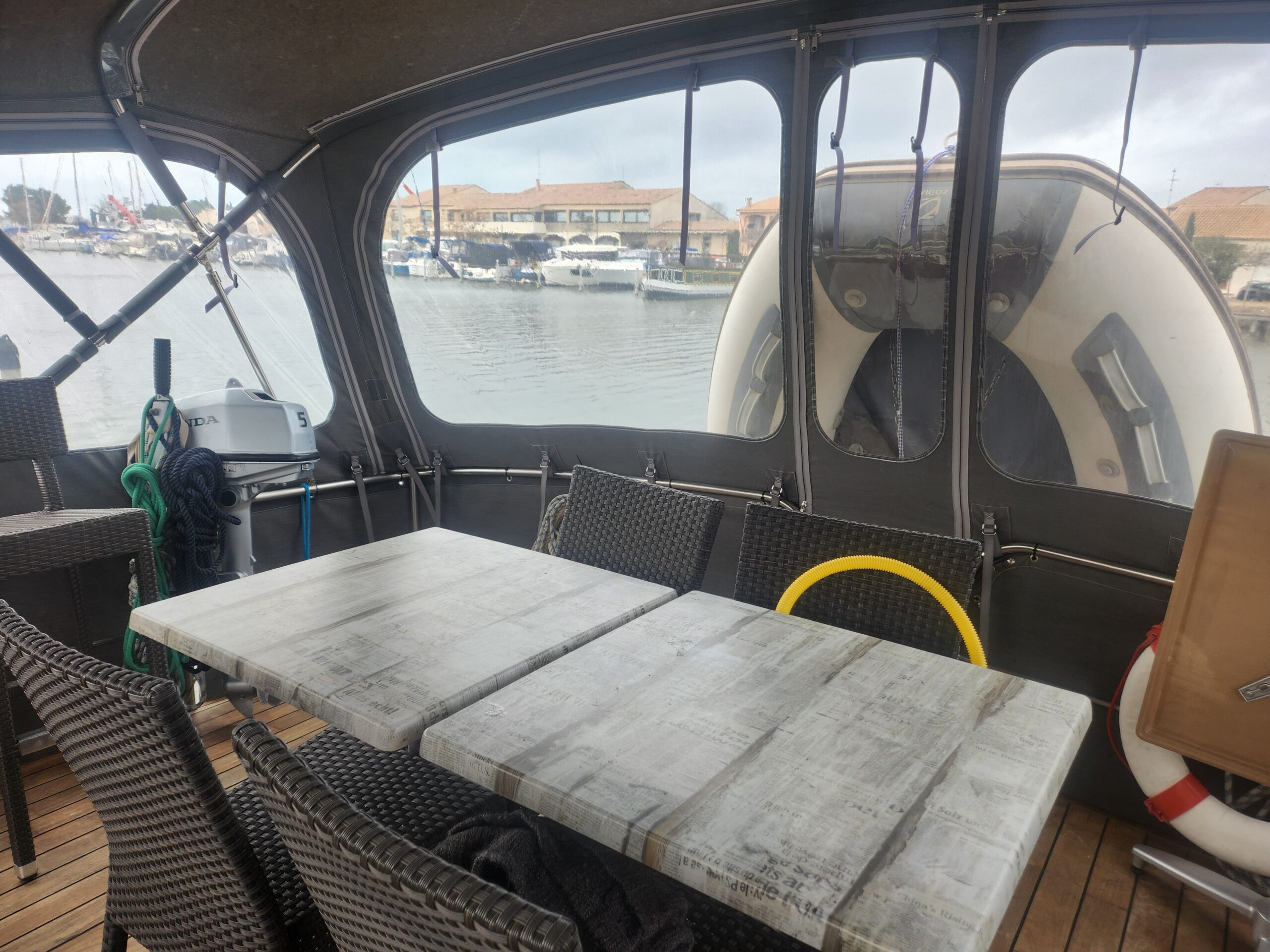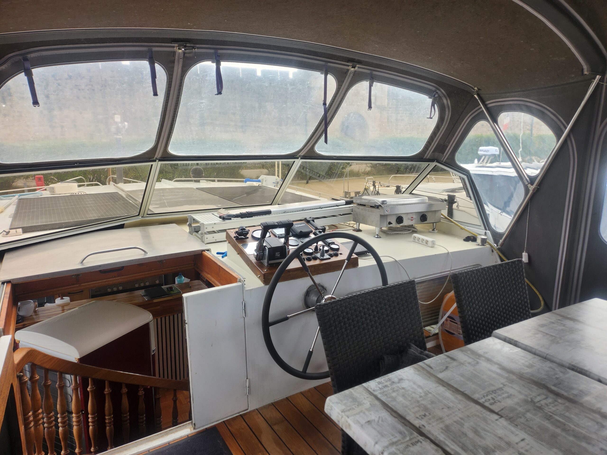 À l’extérieur, la terrasse arrière offre un bel espace de détente, parfait pour profiter de la navigation ou des escales. Le poste de pilotage, bien protégé, garantit une conduite agréable et sécurisée.